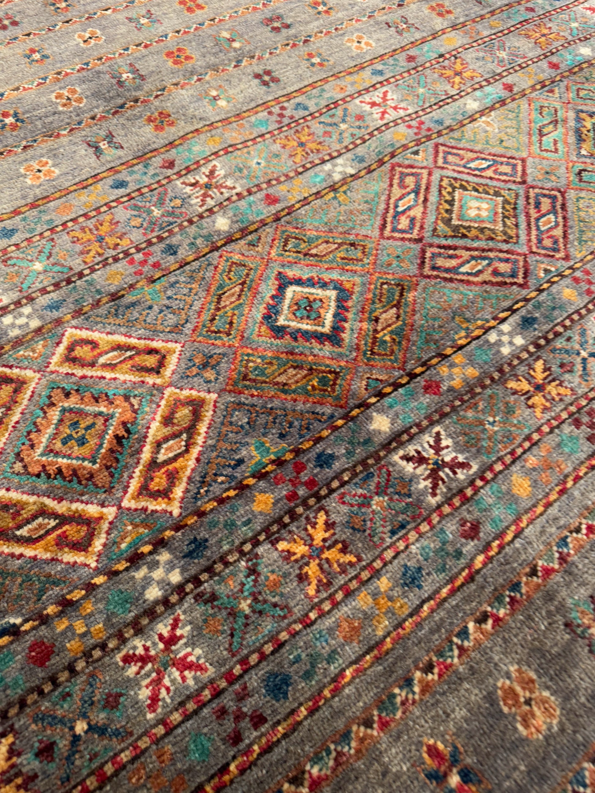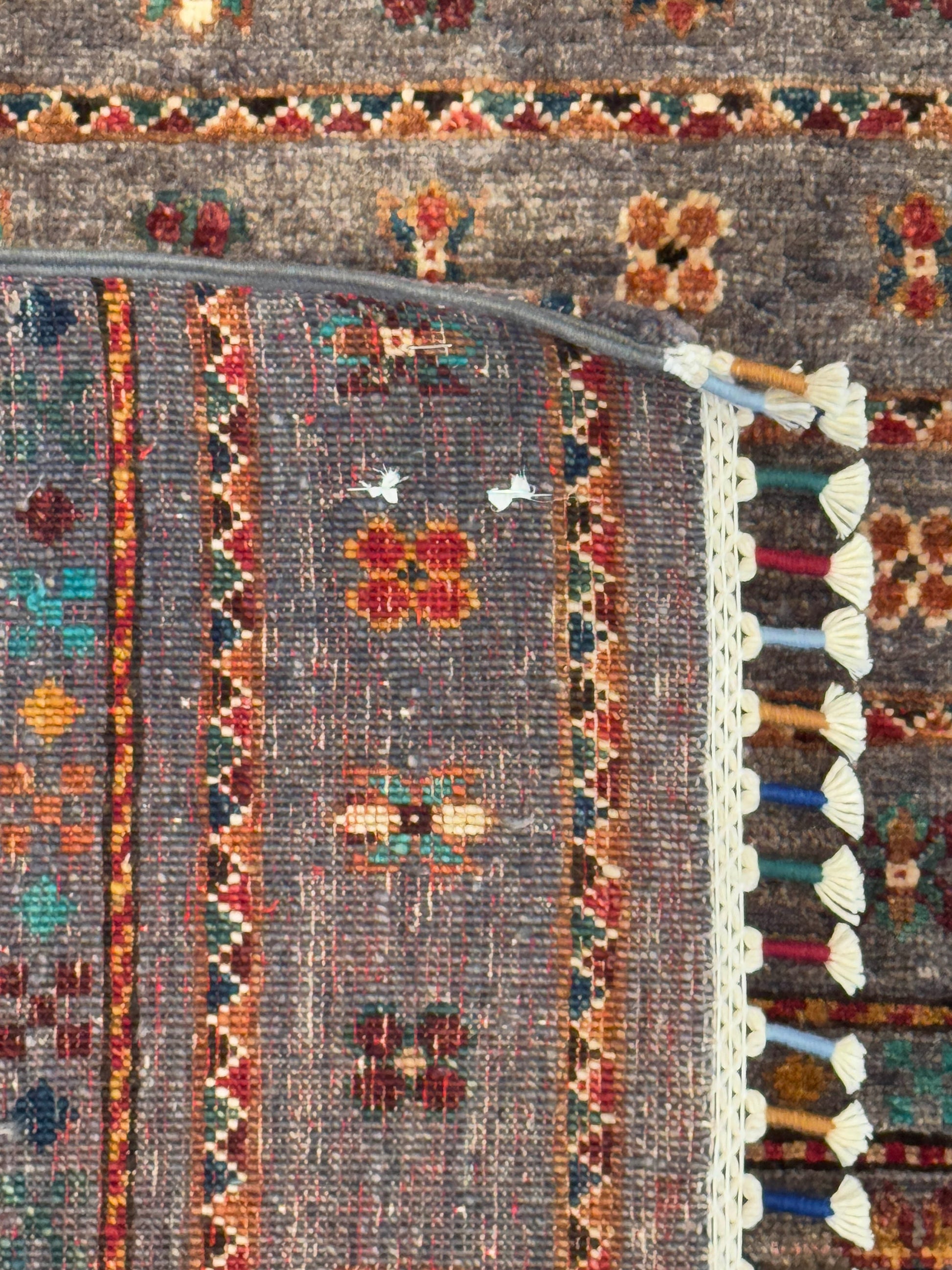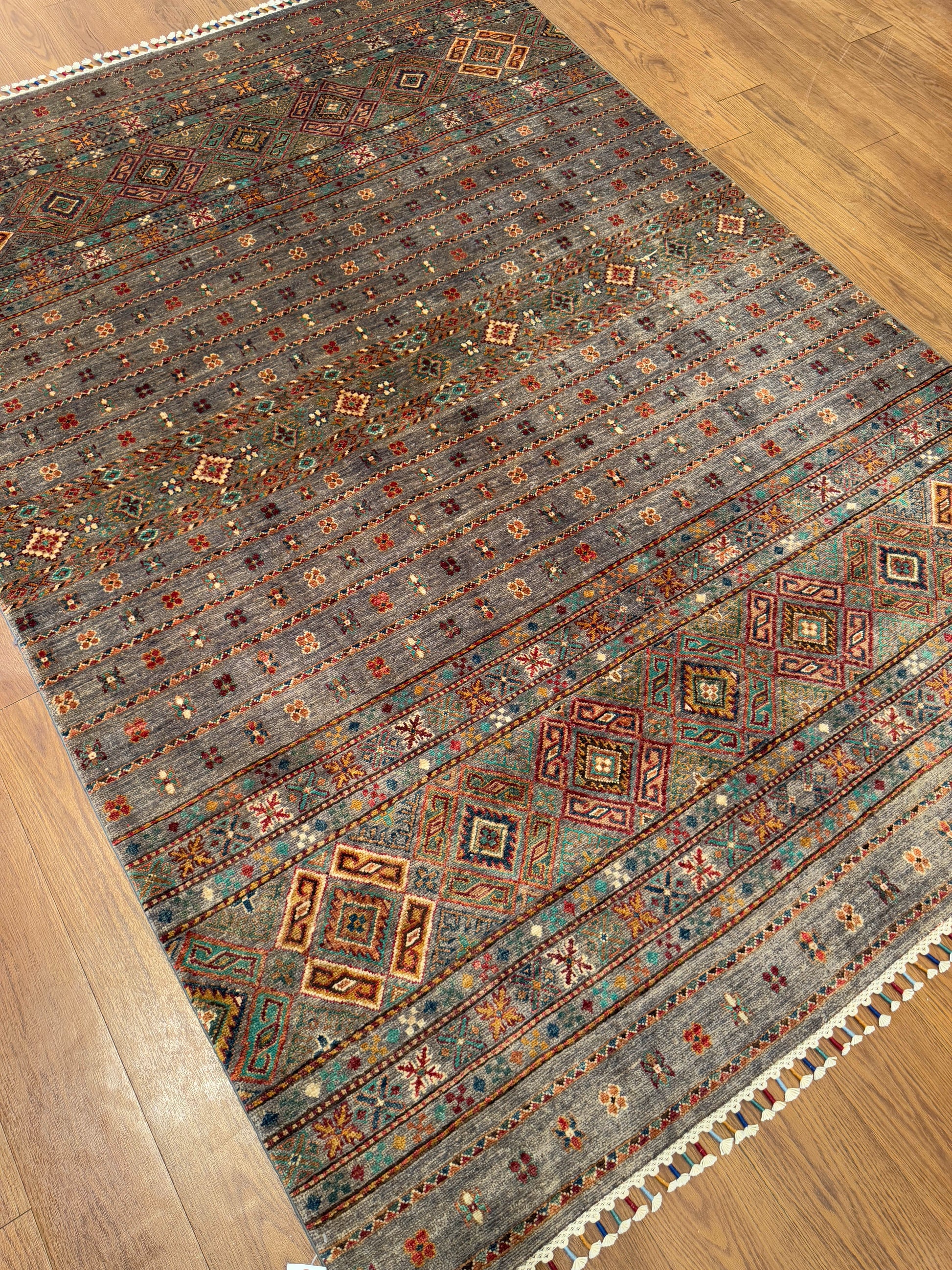 This rug presents a beautifully weathered, earthy elegance with its muted taupe-gray field enriched by rows of tribal diamond medallions and petite floral motifs. Subtle accents of rust, teal, gold, and deep red add warmth and depth, while the intricate border design showcases the artistry of traditional weaving. Finished with tasseled edges, this piece blends rustic authenticity with refined craftsmanship—perfect for grounding modern or eclectic interiors.