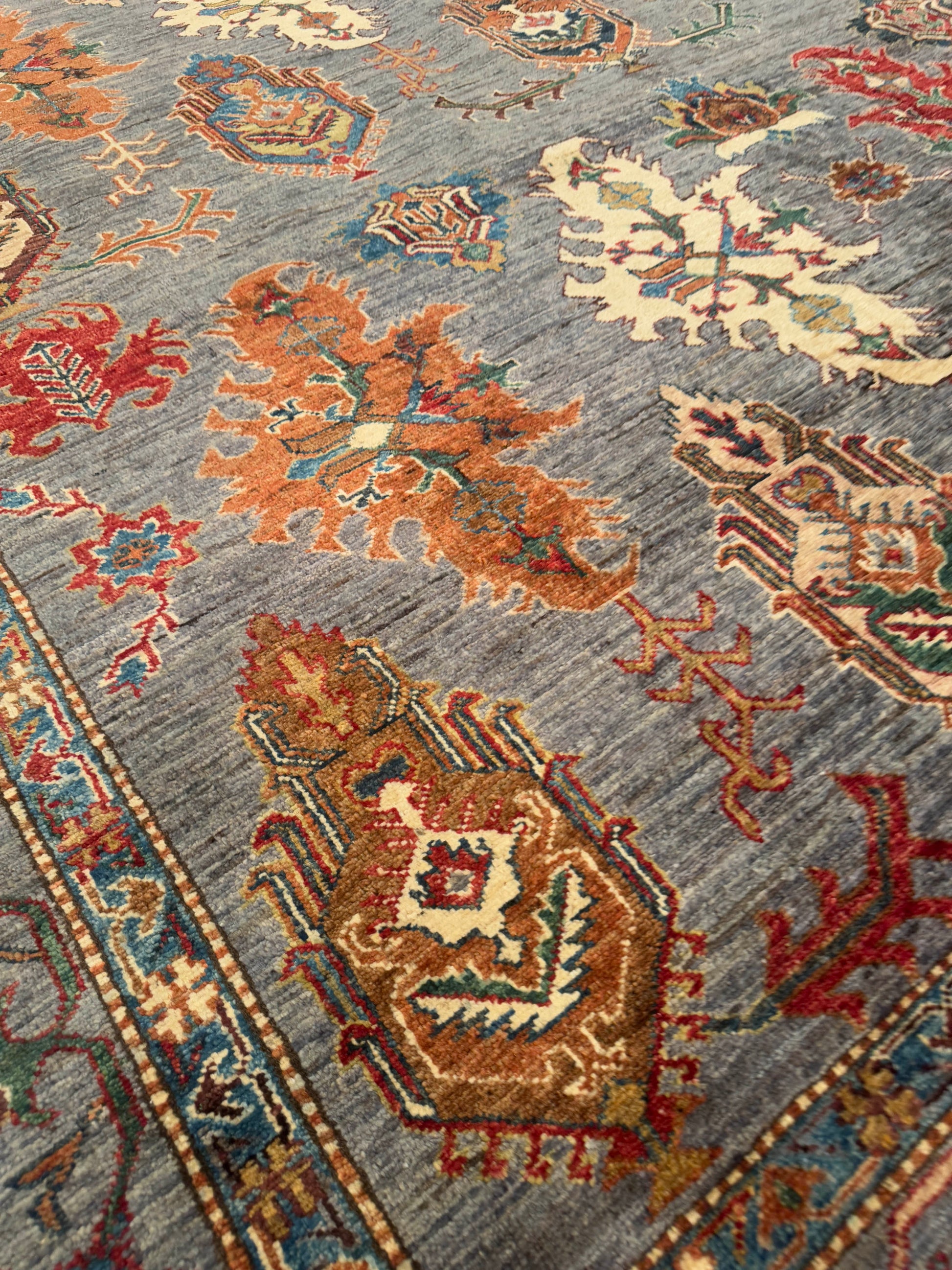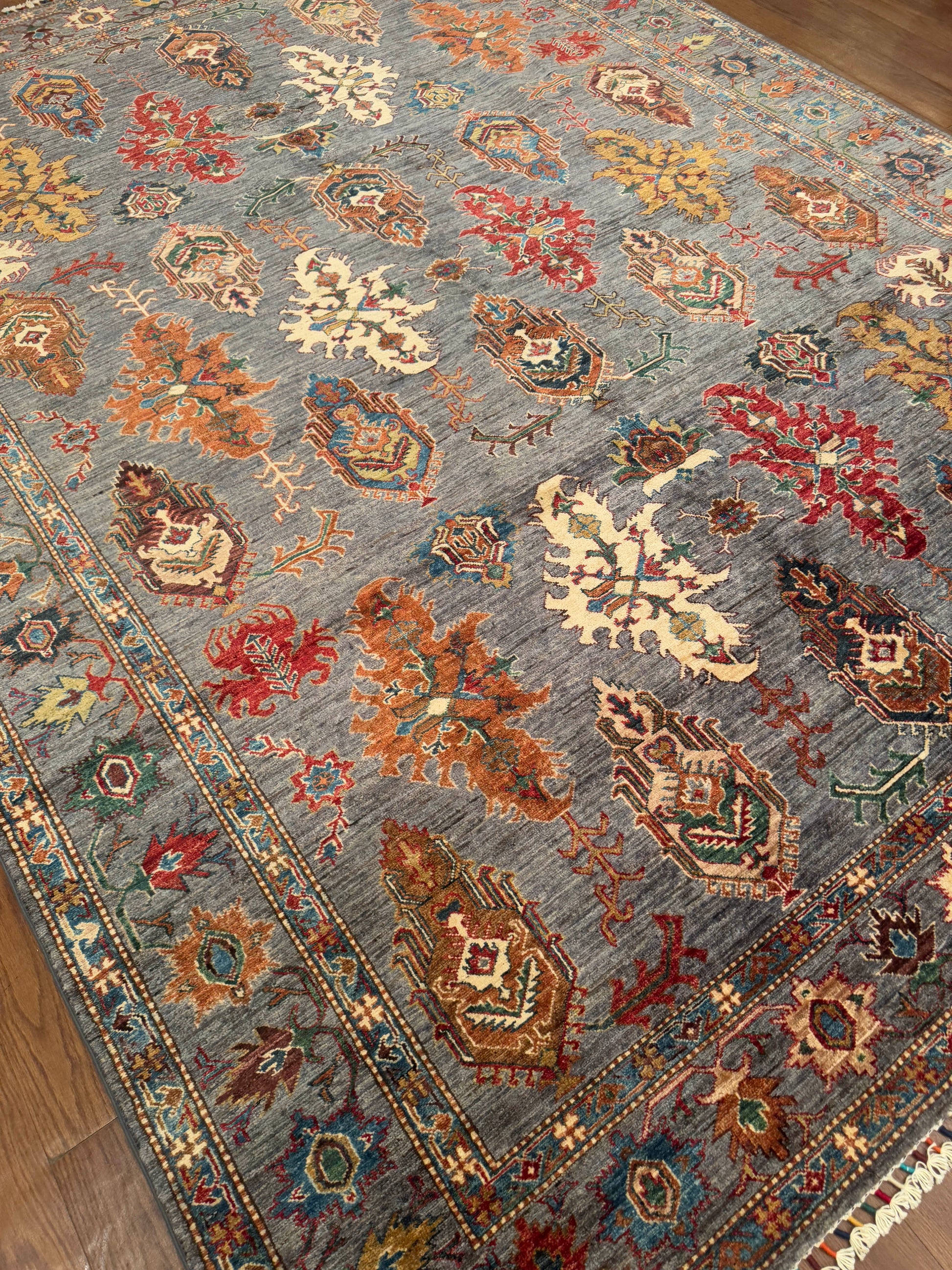 This handmade rug features an elegant allover pattern of stylized botanical motifs in a mix of vibrant and earthy tones. The gray background provides a refined balance to the vivid reds, golds, creams, and teals that define each medallion-like leaf form. Framed by a detailed border with floral and geometric accents, this piece brings both warmth and sophistication to a space.