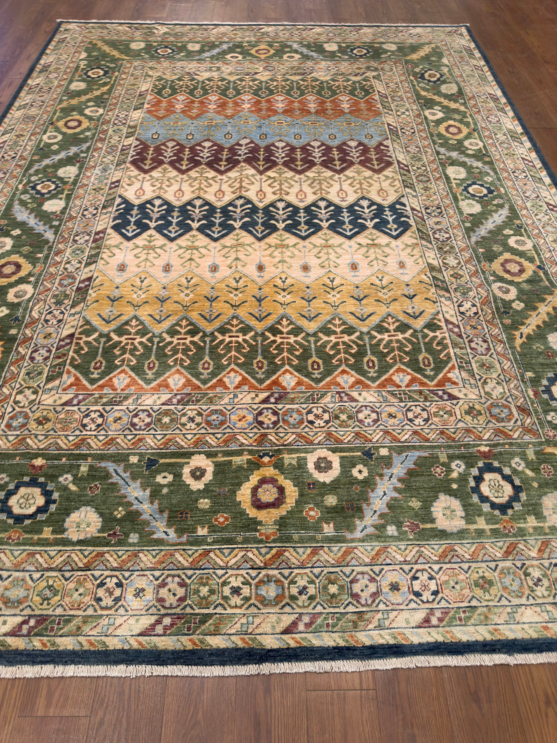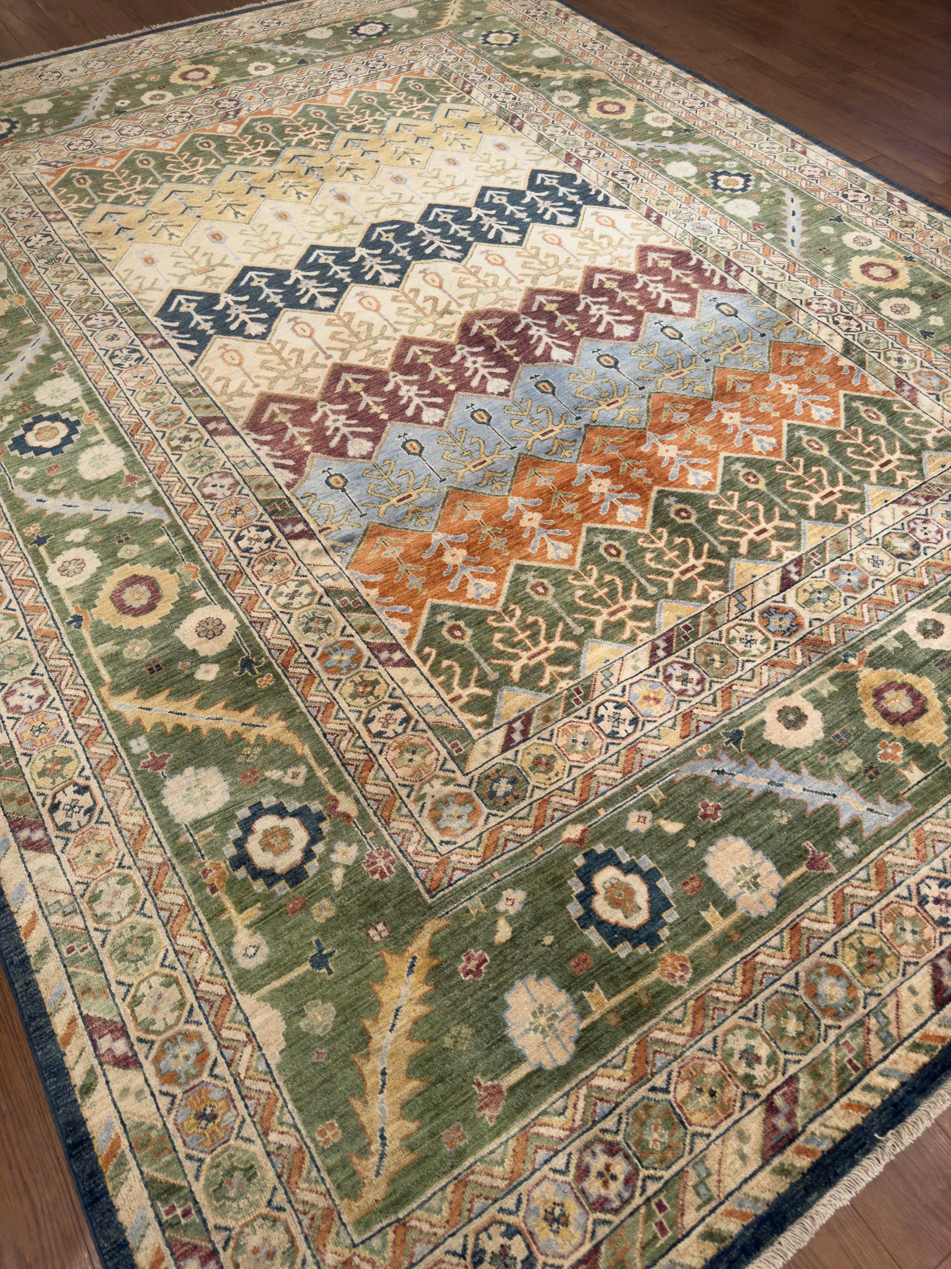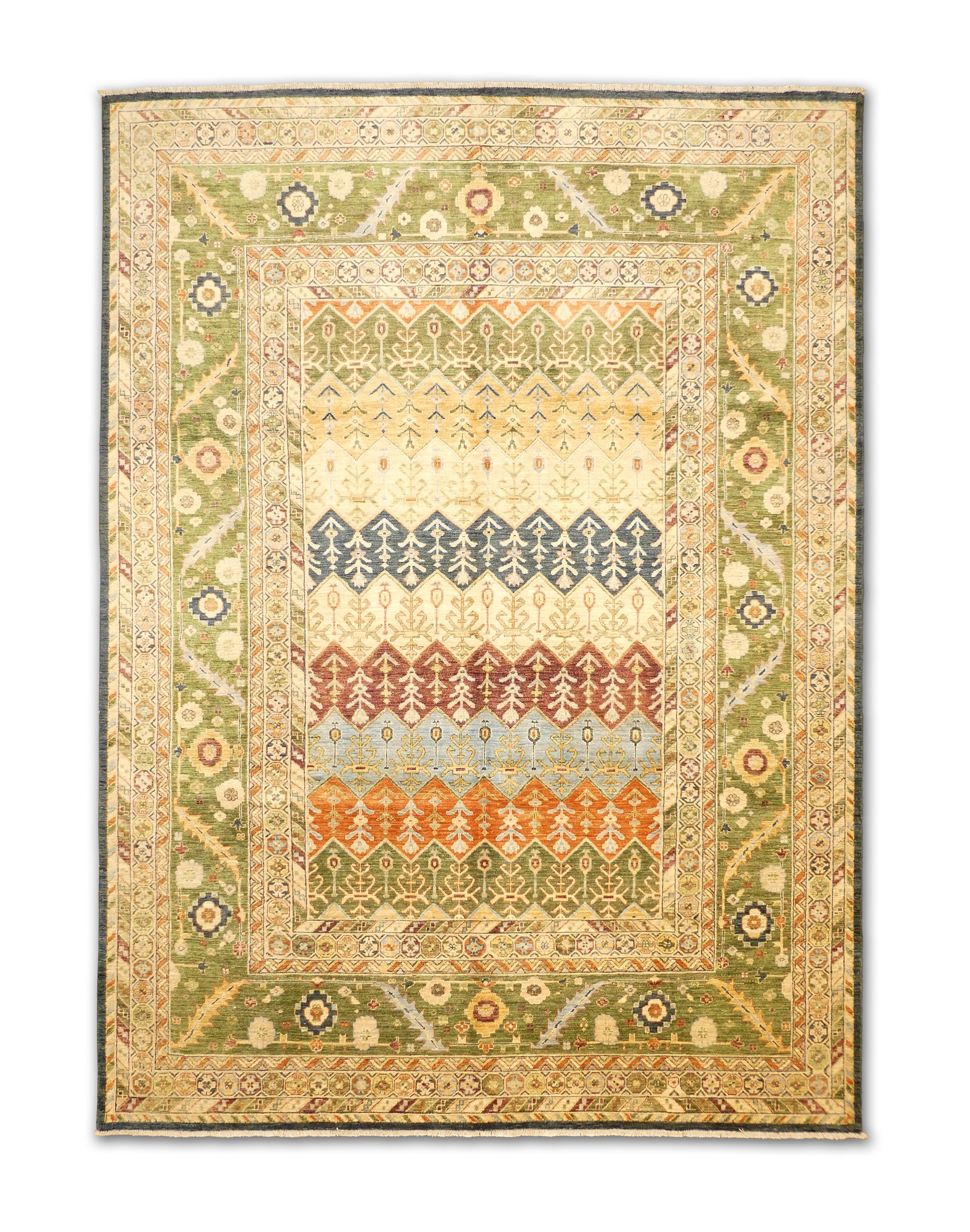 This handmade rug features a striking chevron-inspired pattern composed of layered bands in sage green, gold, blue, rust, and ivory. Each section displays stylized botanical motifs that evoke a sense of natural harmony and rhythm. The soft, earthy tones are enhanced by an intricate border, adding balance and refinement to the overall design. Perfect for creating an inviting and artistic atmosphere in any space.