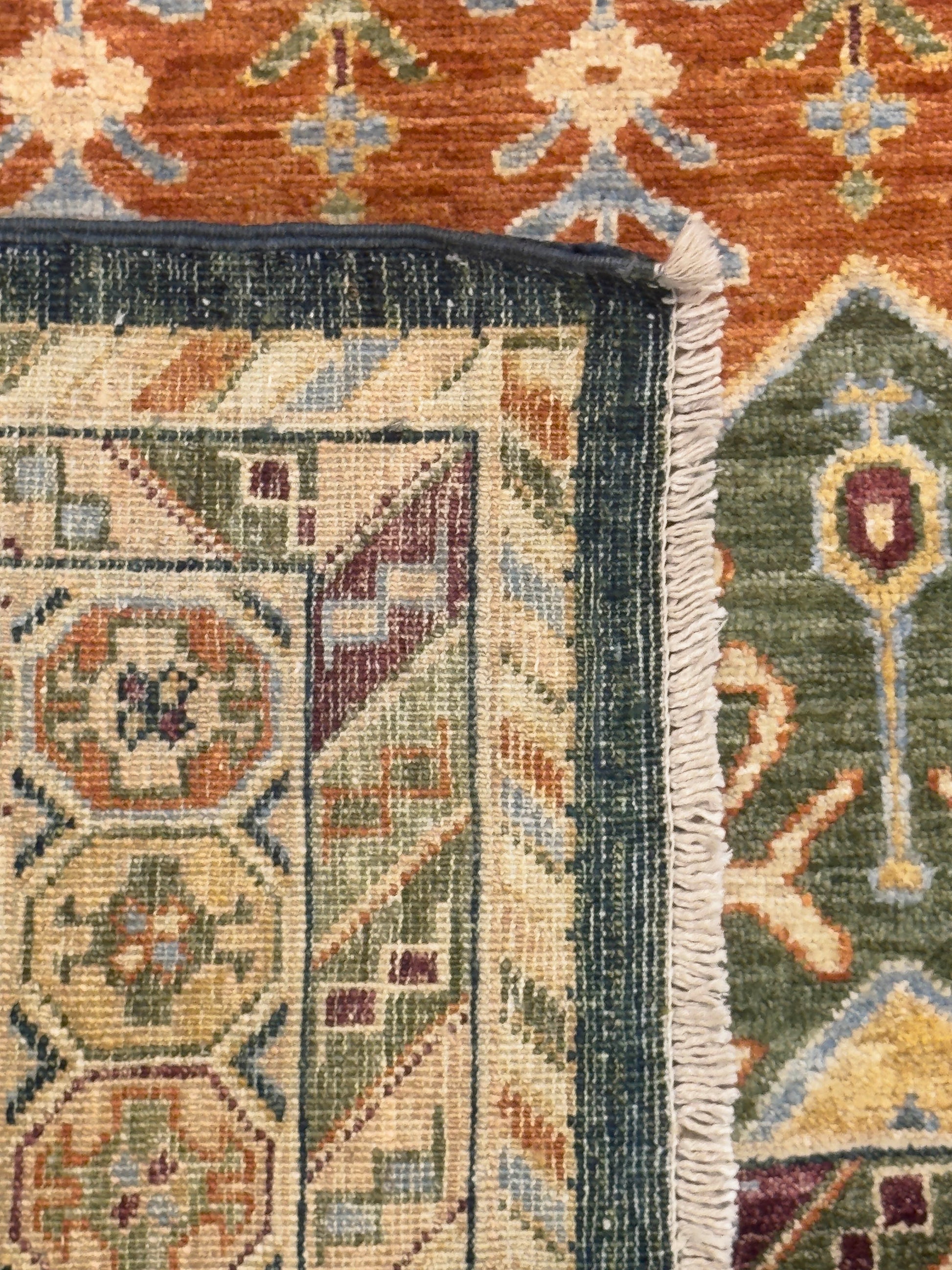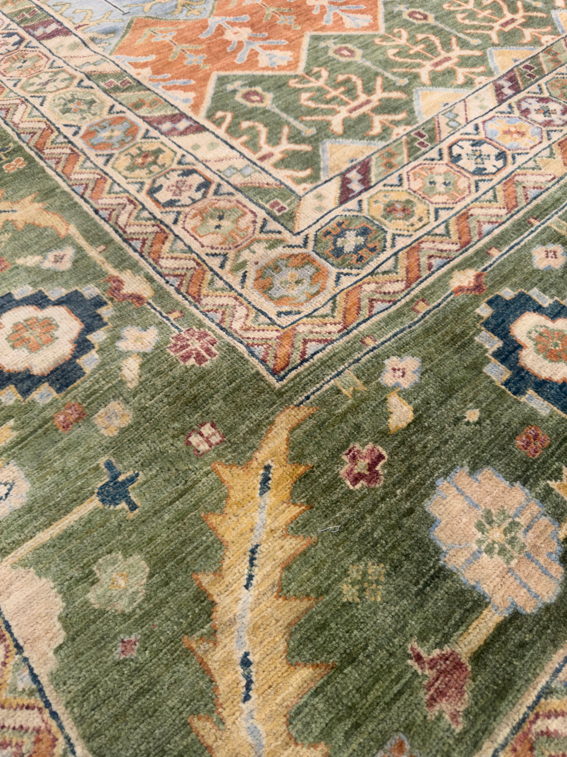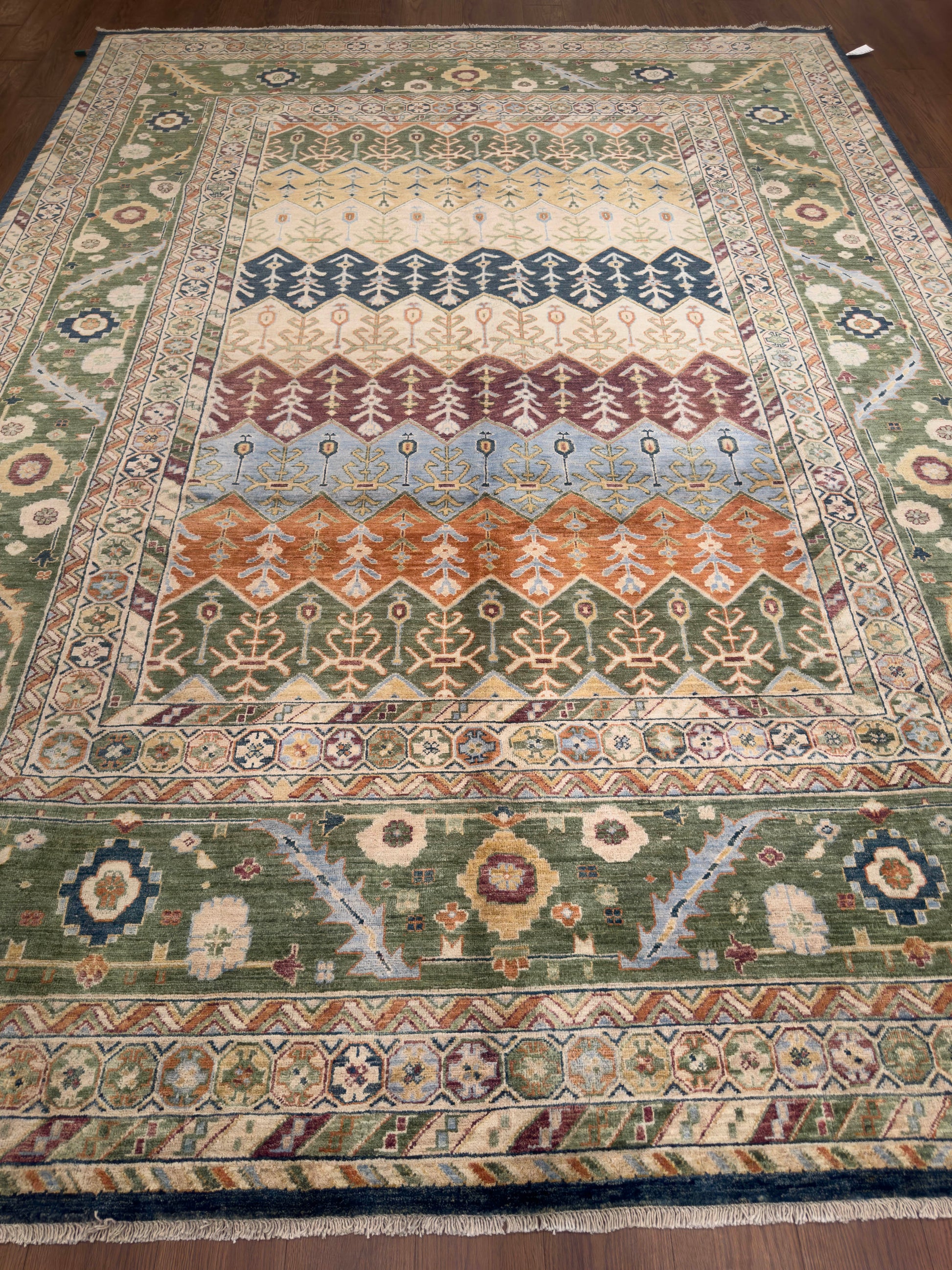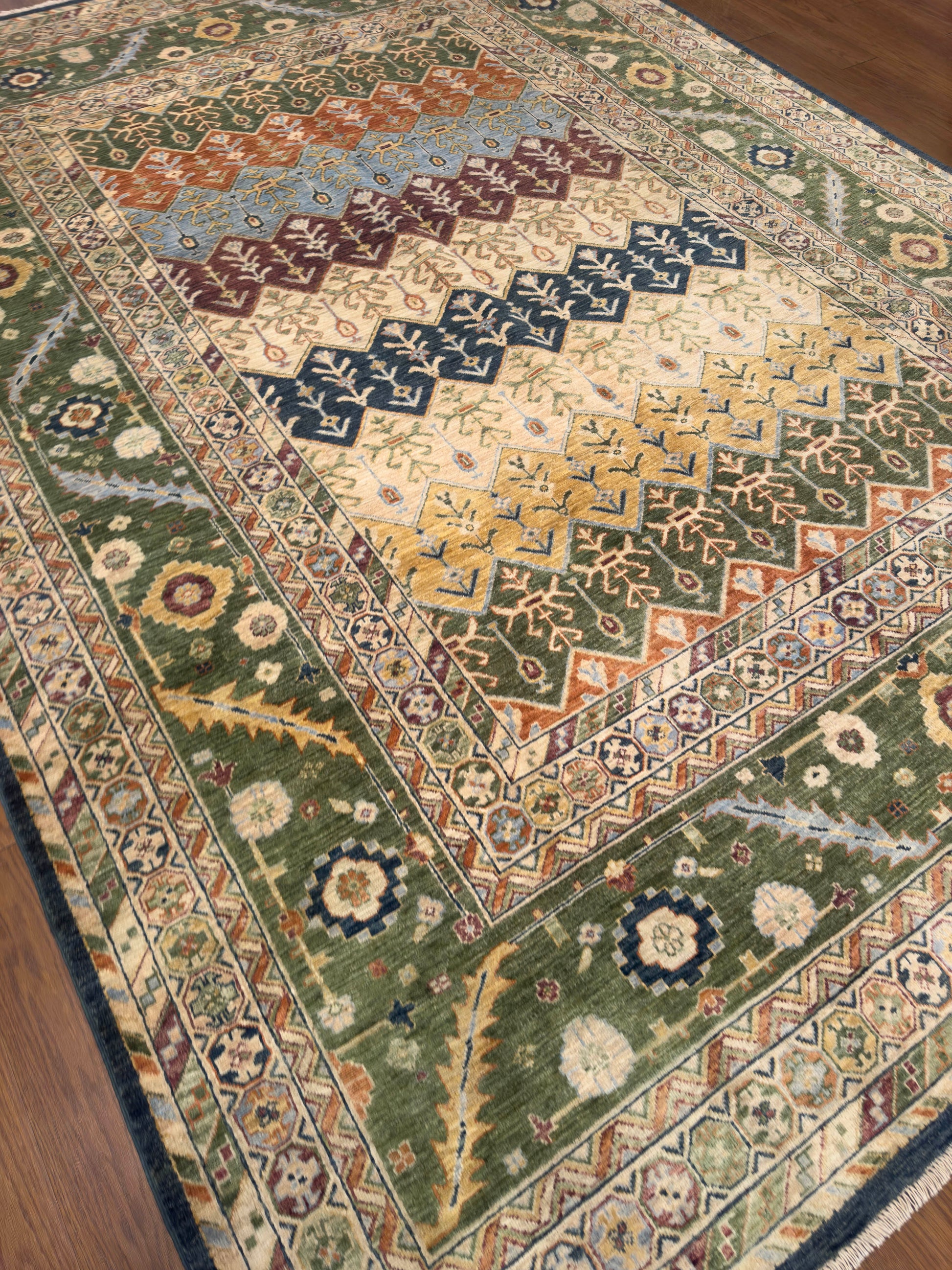 This handmade rug features a striking chevron-inspired pattern composed of layered bands in sage green, gold, blue, rust, and ivory. Each section displays stylized botanical motifs that evoke a sense of natural harmony and rhythm. The soft, earthy tones are enhanced by an intricate border, adding balance and refinement to the overall design. Perfect for creating an inviting and artistic atmosphere in any space.