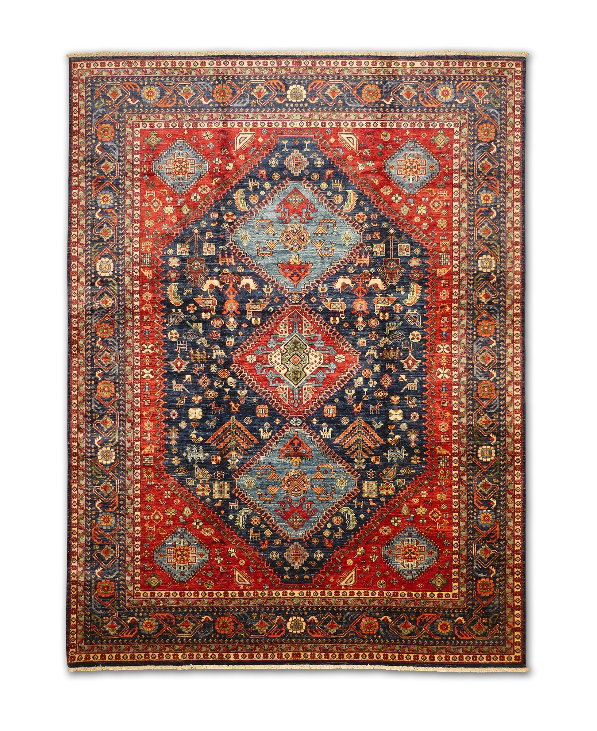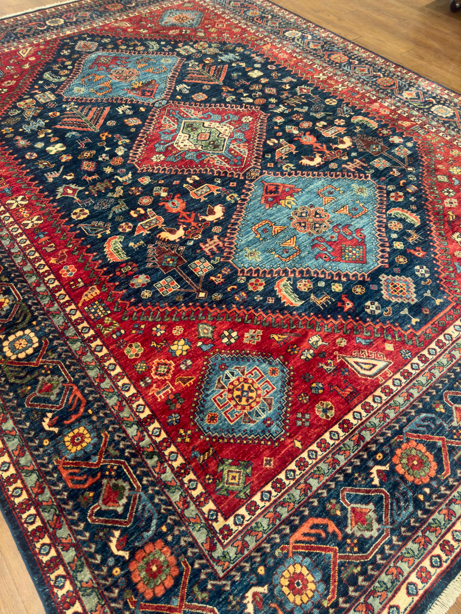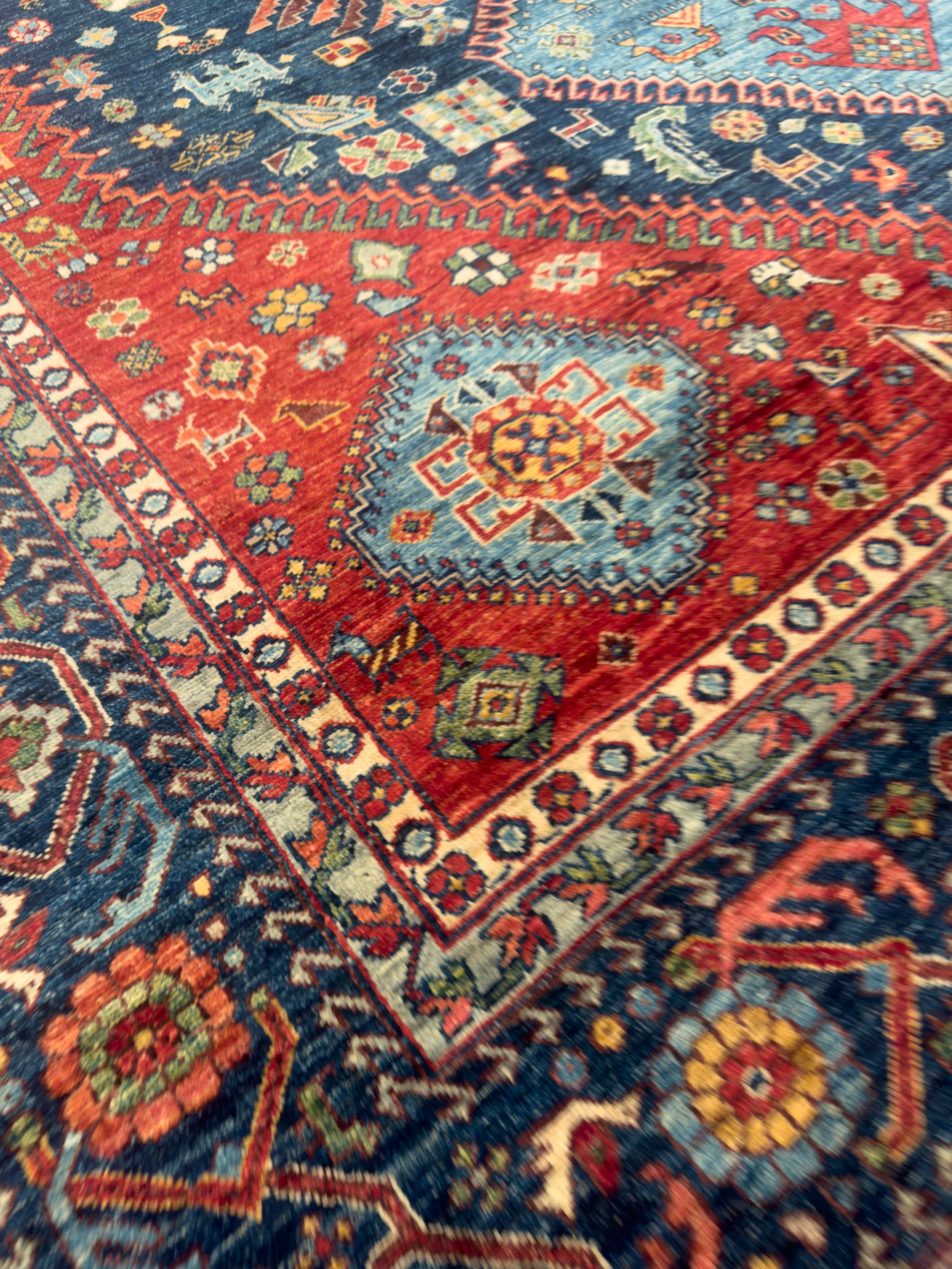 This handmade rug features a bold diamond medallion layout set against a deep navy background, highlighted by intricate motifs of animals, trees, and geometric forms. Shades of red, sky blue, ivory, and soft green add vibrancy and contrast, creating a visually dynamic and storied composition. The detailed borders tie the palette together, making this rug both decorative and expressive.