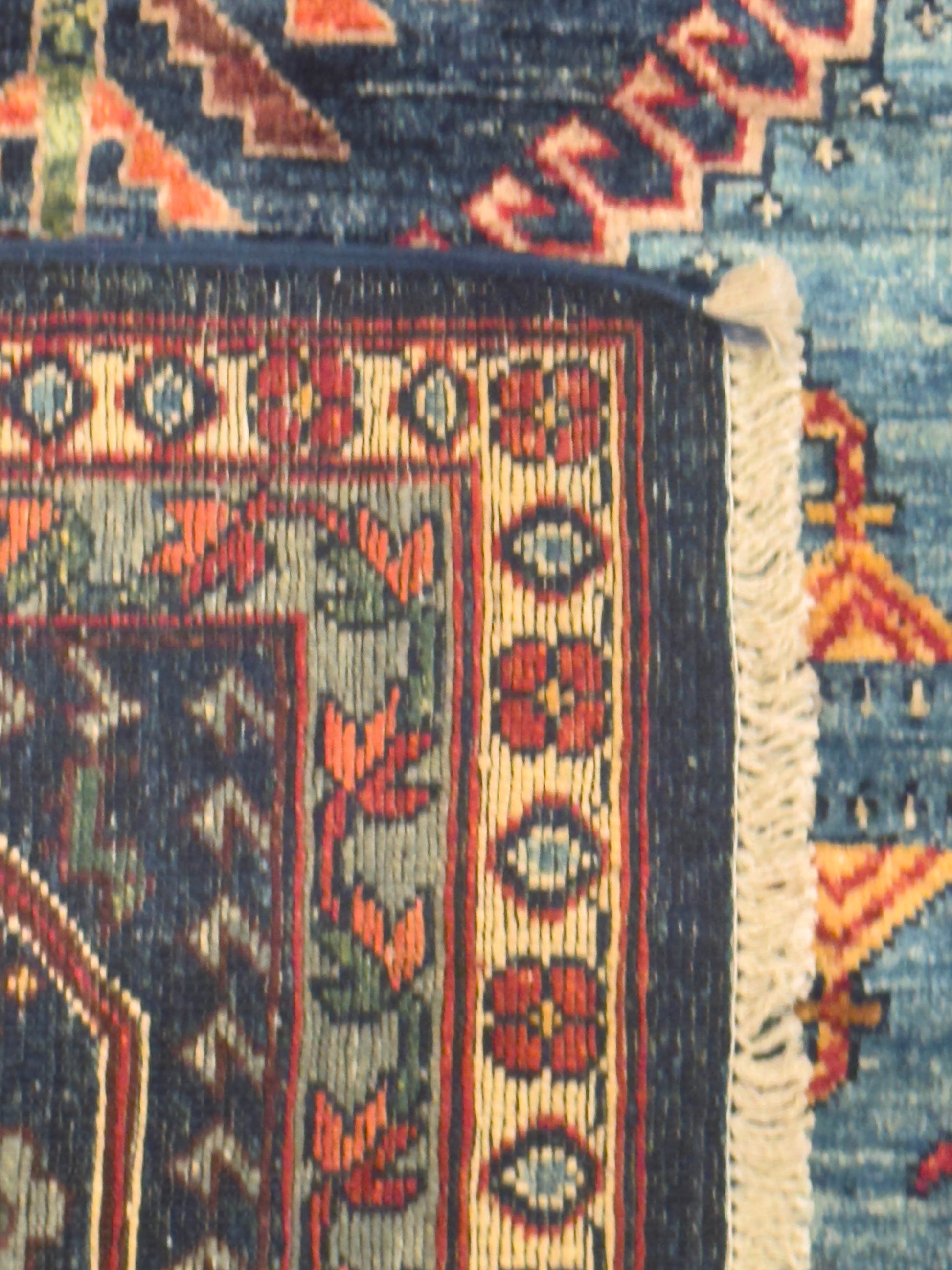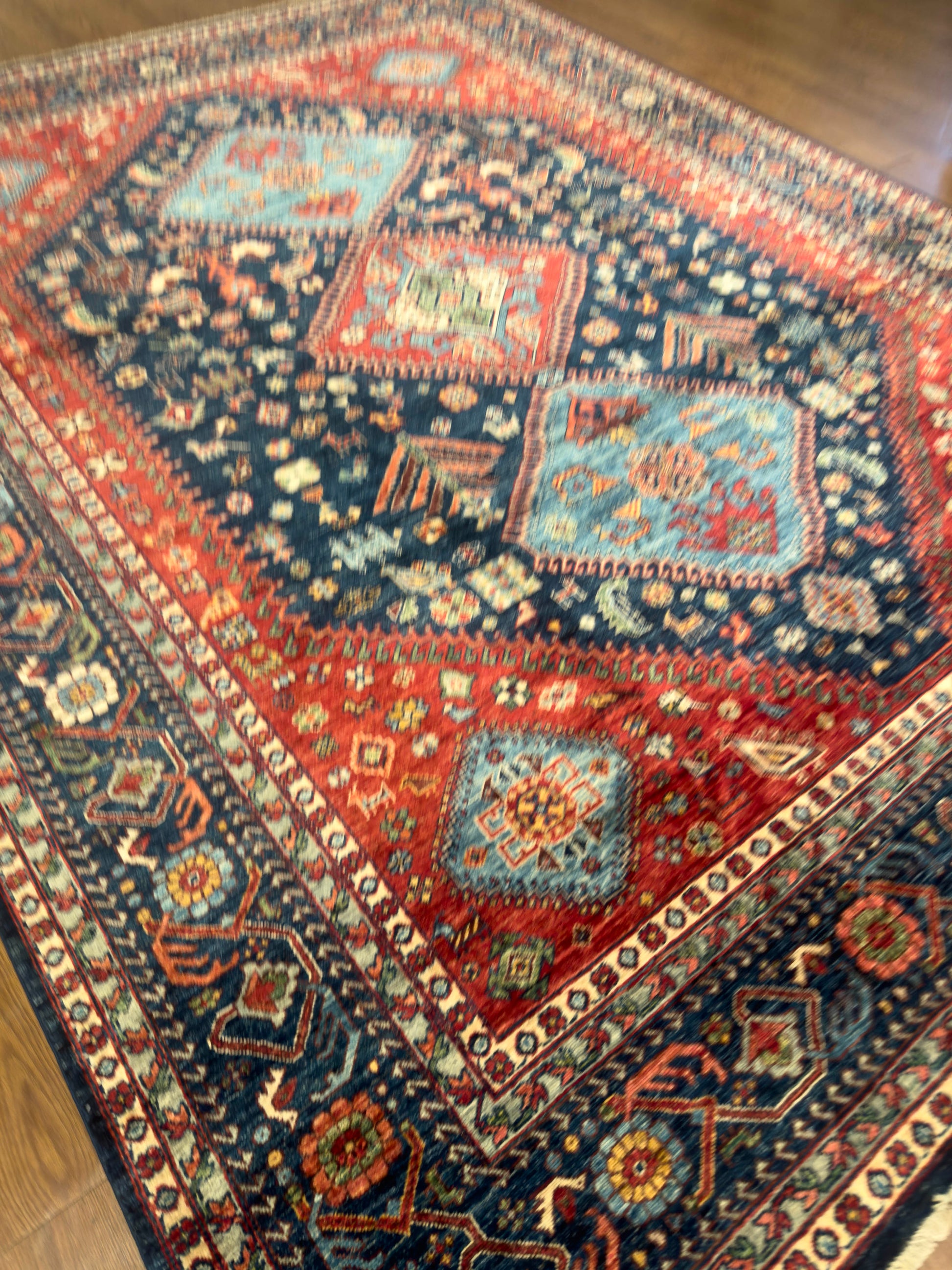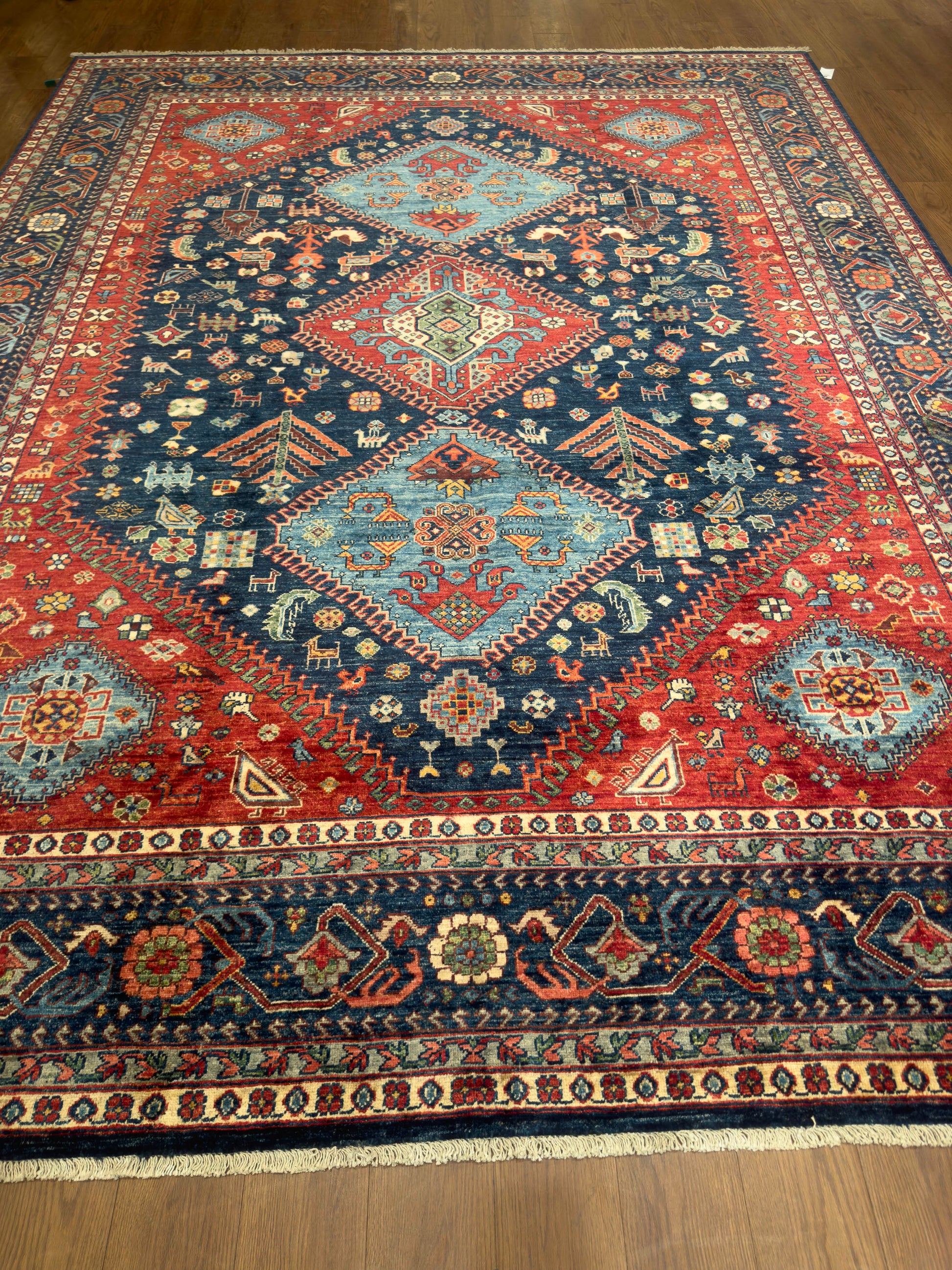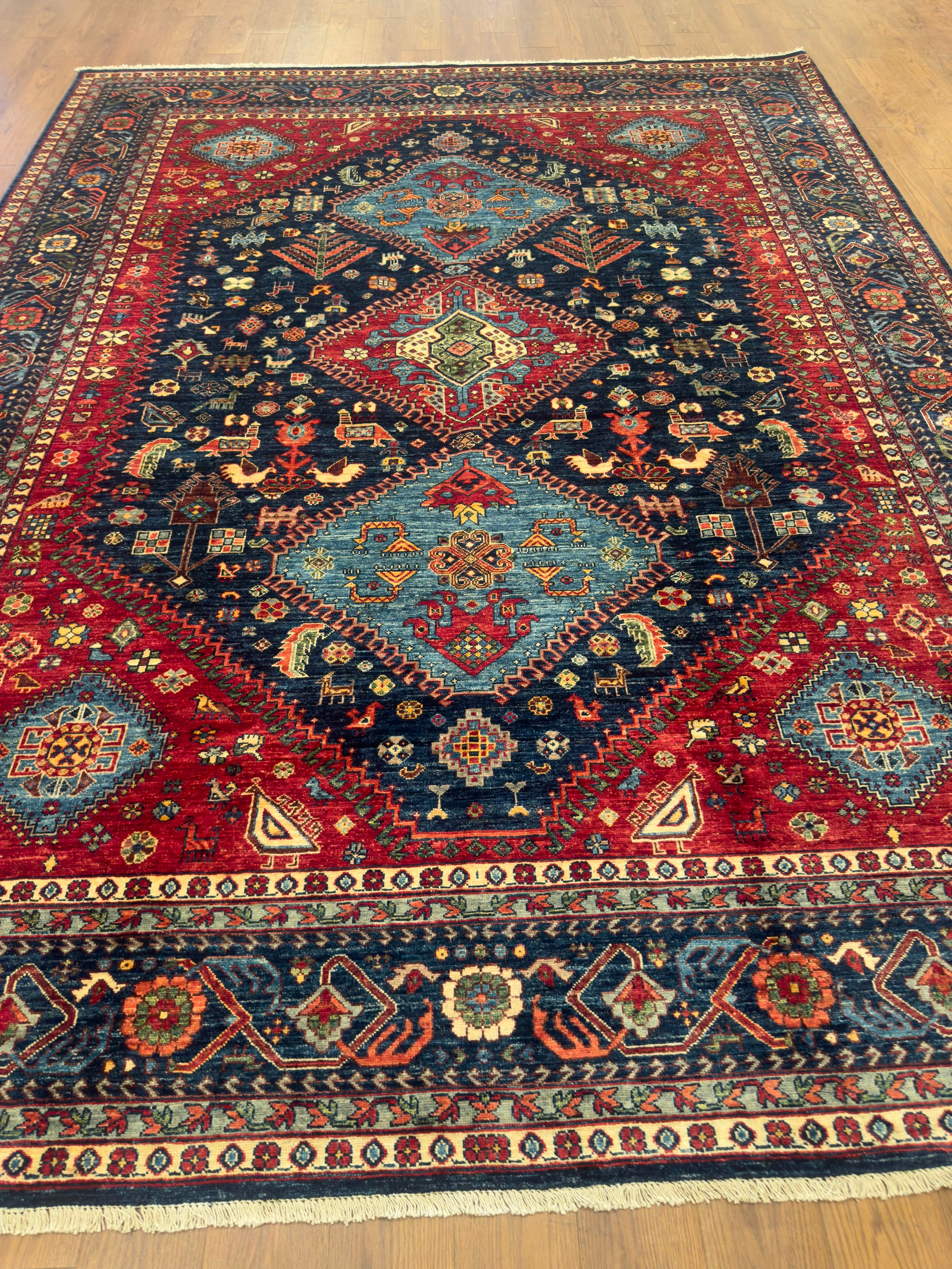 This handmade rug features a bold diamond medallion layout set against a deep navy background, highlighted by intricate motifs of animals, trees, and geometric forms. Shades of red, sky blue, ivory, and soft green add vibrancy and contrast, creating a visually dynamic and storied composition. The detailed borders tie the palette together, making this rug both decorative and expressive.