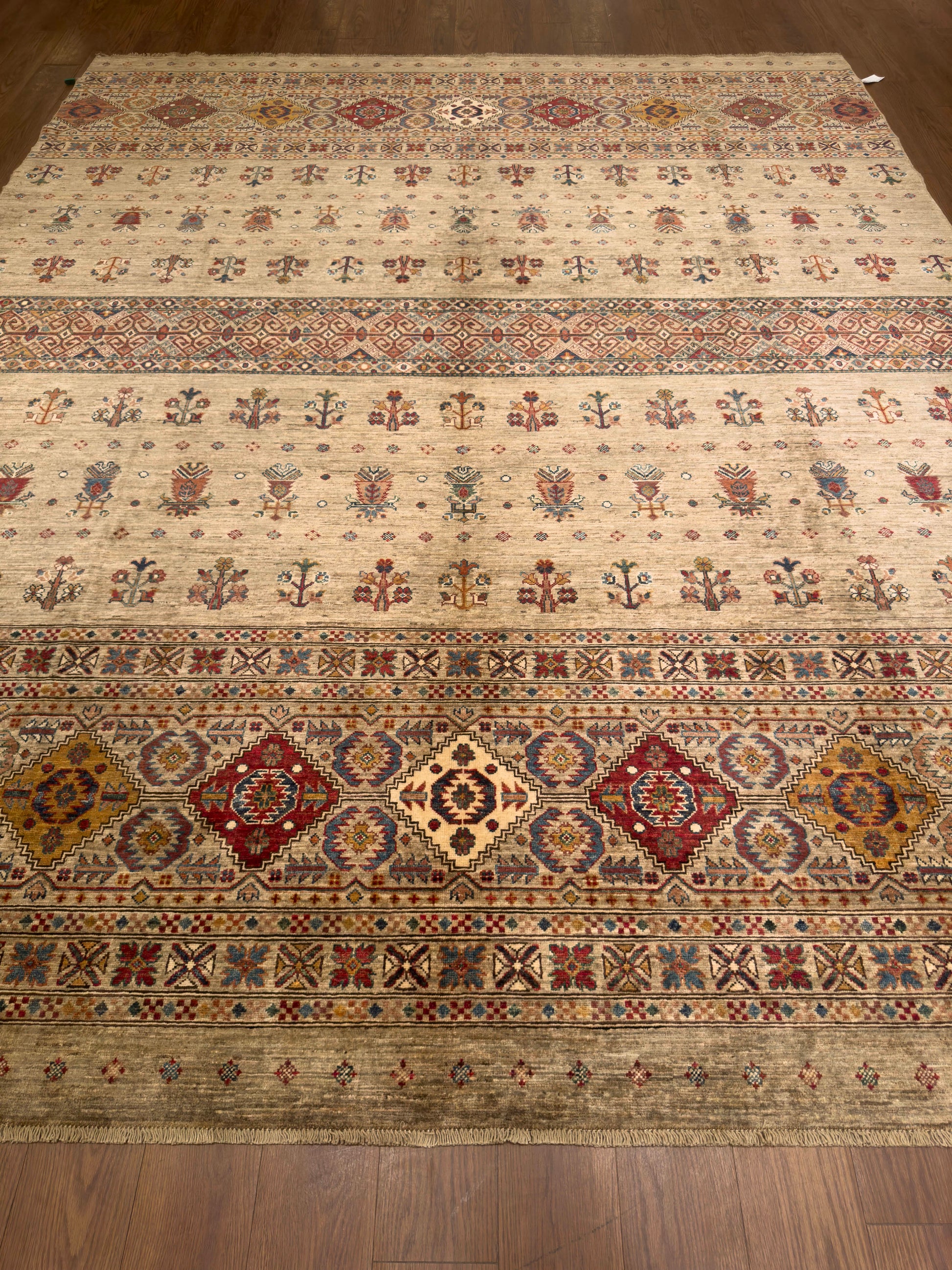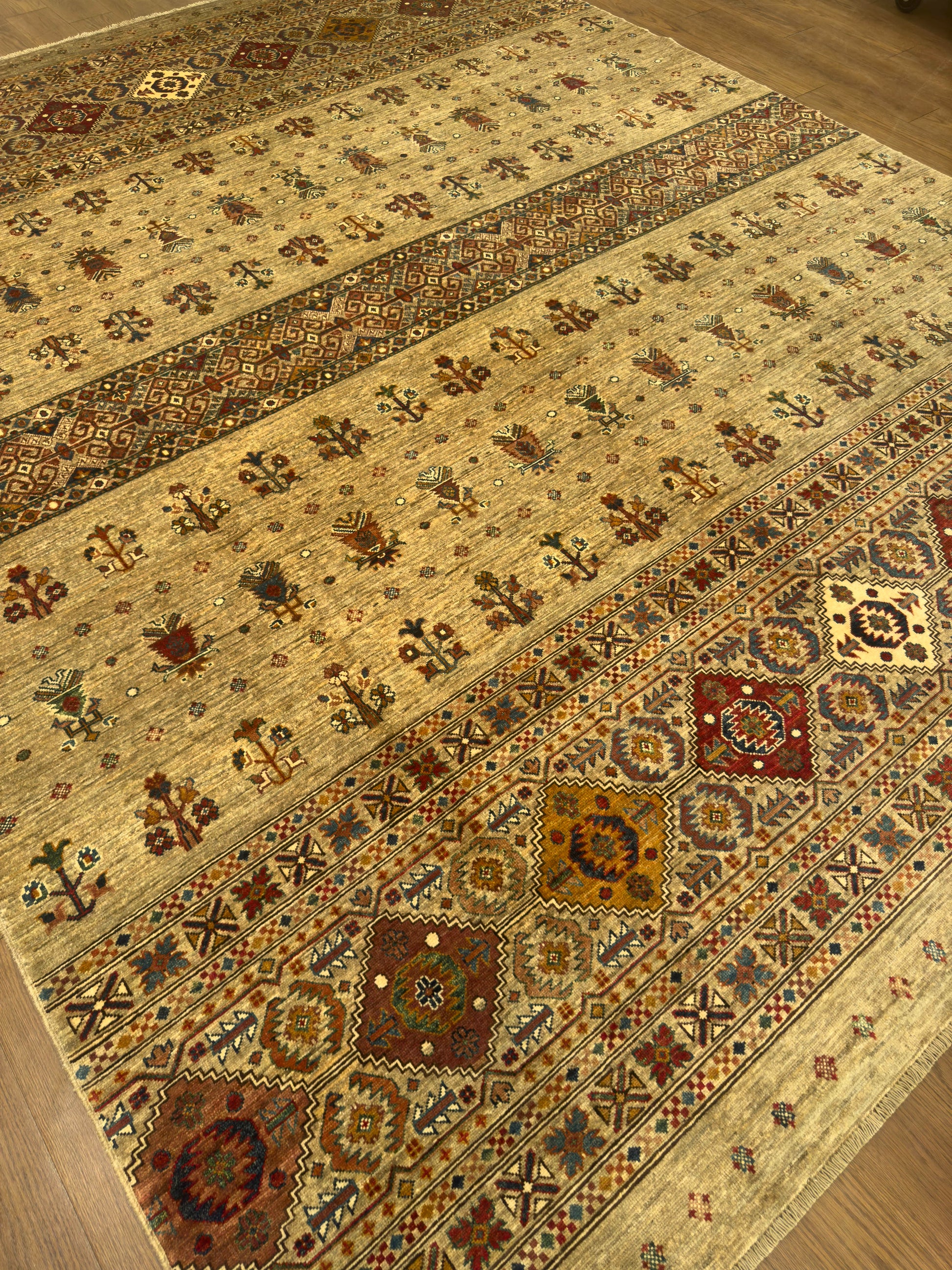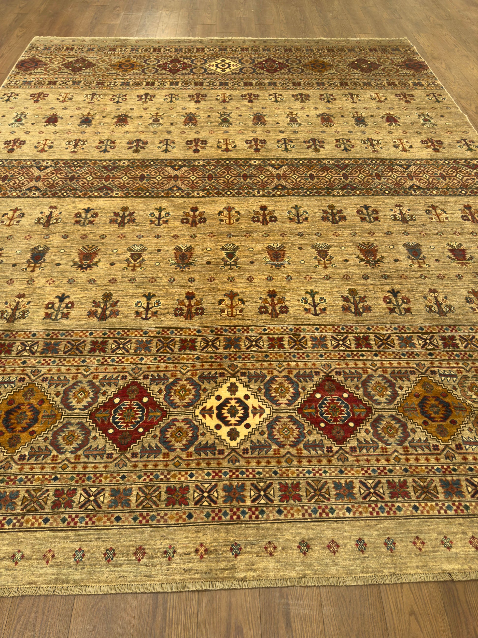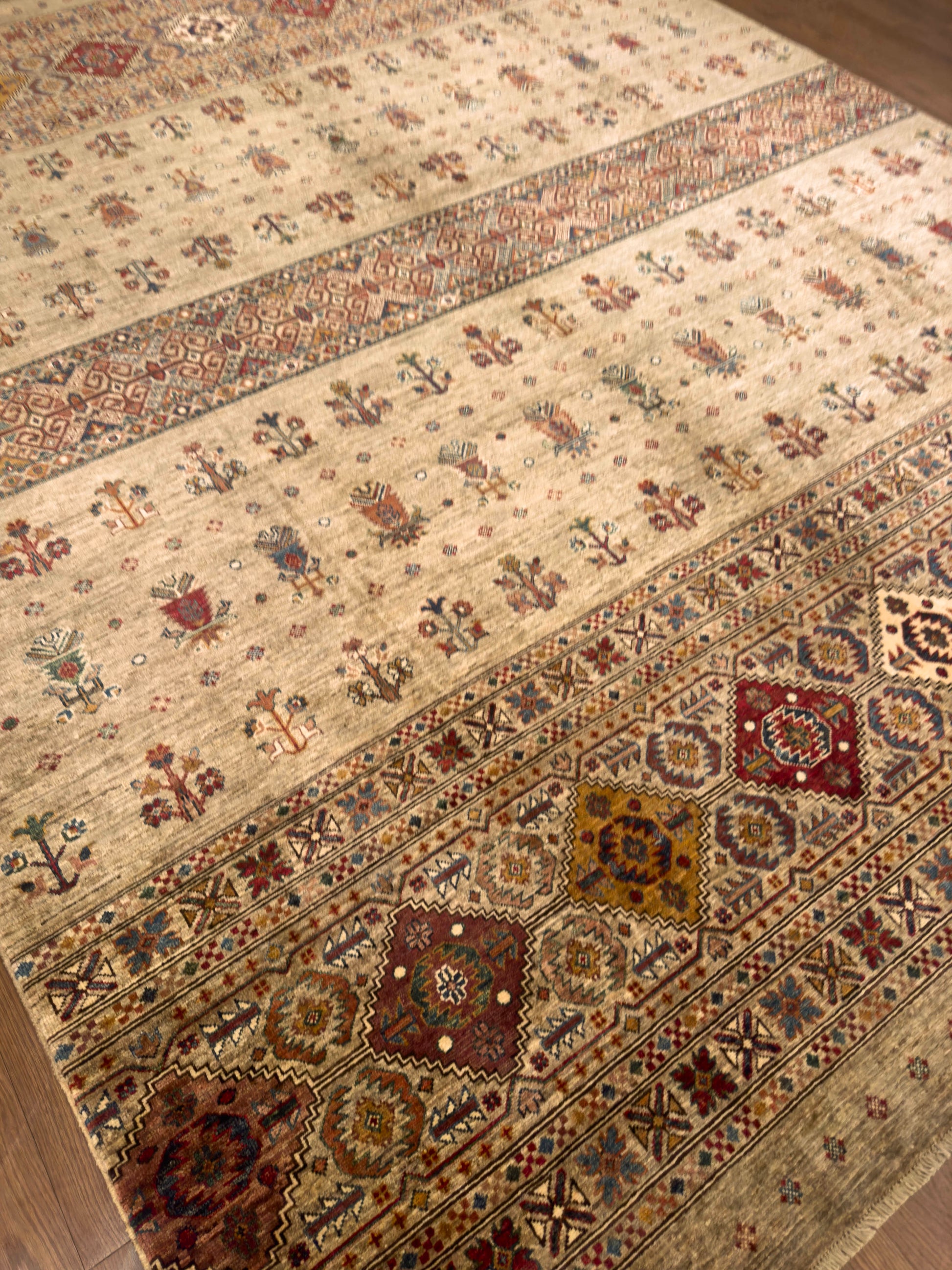 This handmade rug features a soothing field of soft beige tones accented by horizontal bands of geometric and floral motifs. The subtle mix of warm gold, rust, and blue hues adds character while maintaining an understated, earthy elegance. Its banded layout and symmetrical detailing create a balanced and timeless look that blends beautifully with both rustic and contemporary interiors.