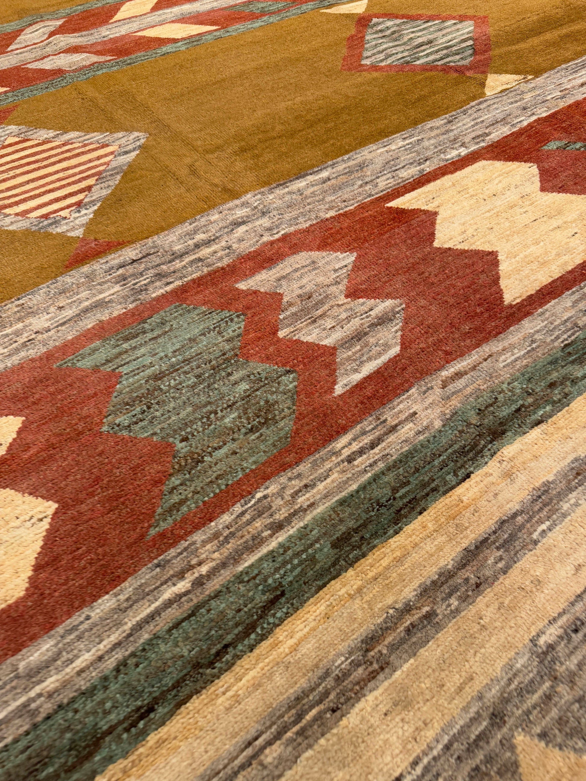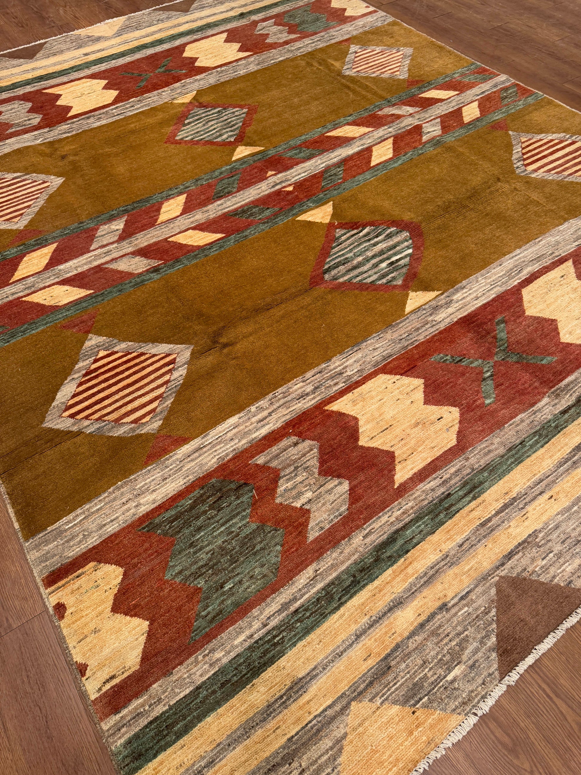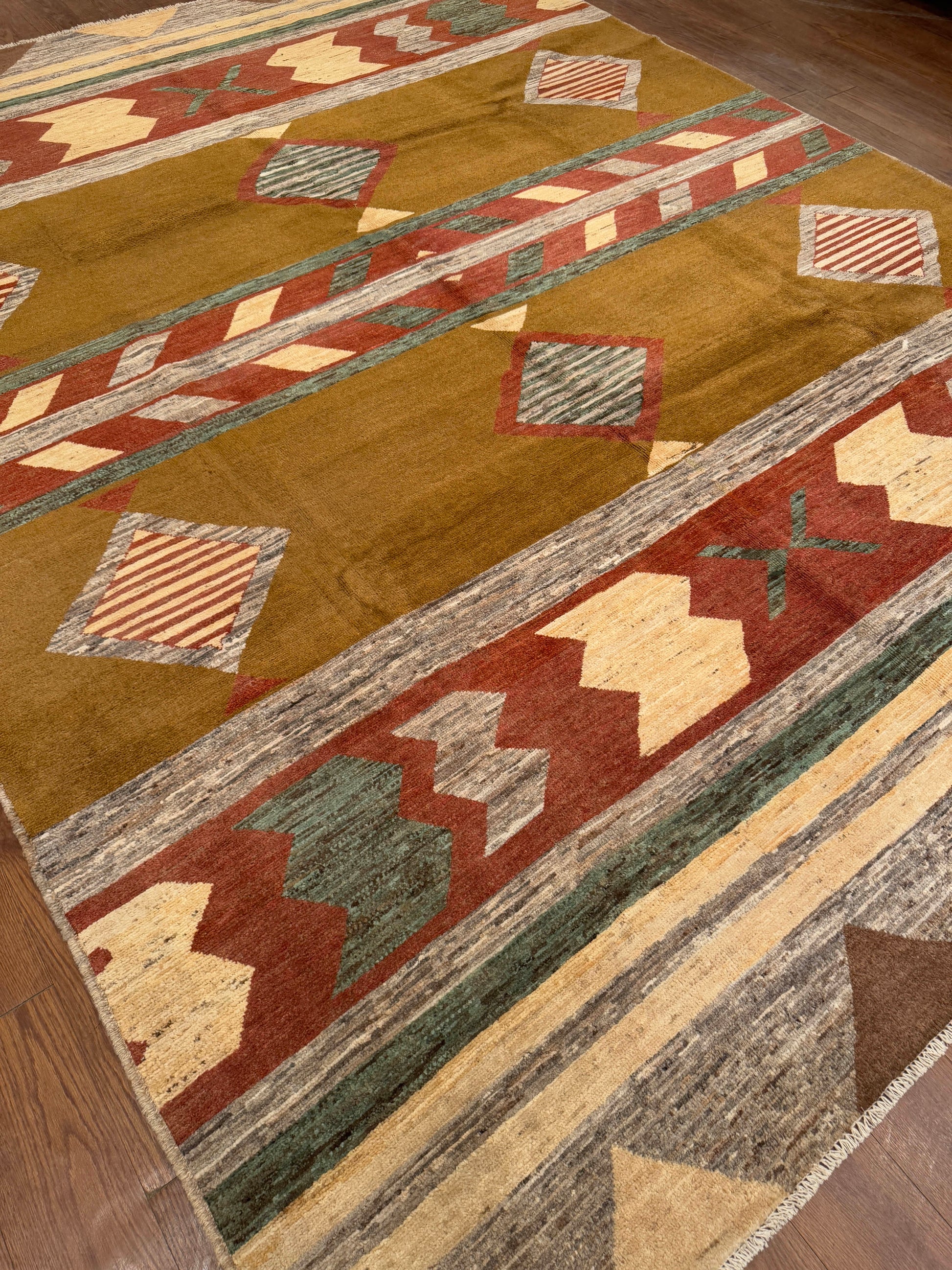This handmade rug features a striking tribal pattern defined by bold geometric motifs and warm, earthy tones. The composition alternates between mustard gold, terracotta, and muted beige bands, accented with diamond and chevron designs in olive and rust. Its minimalist symmetry and rich natural hues make it a perfect centerpiece for rustic, Southwestern, or modern boho interiors.