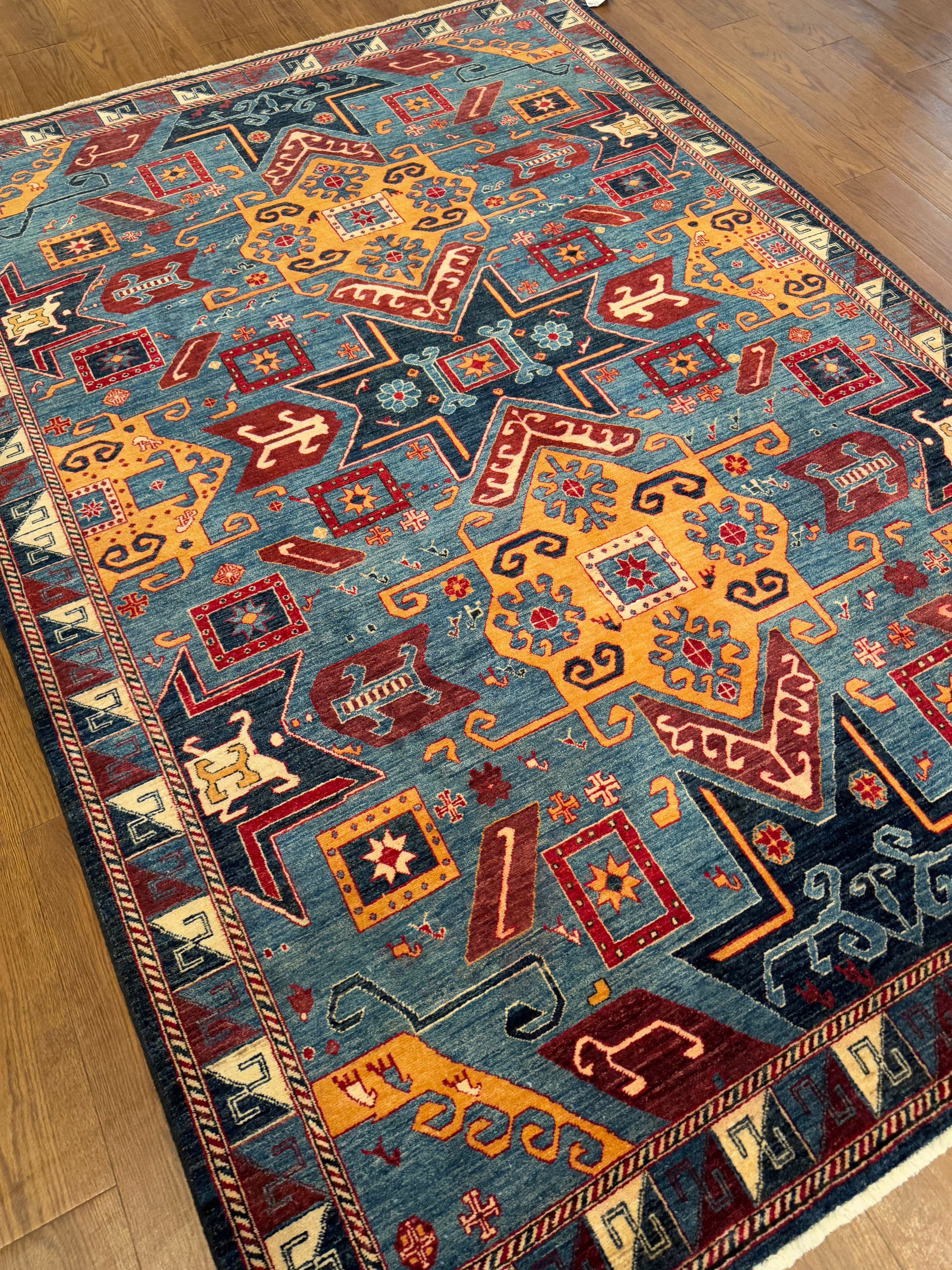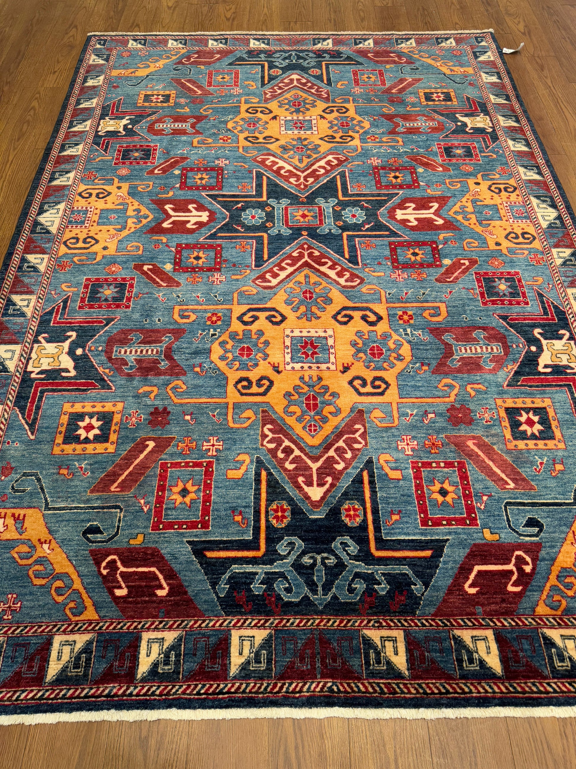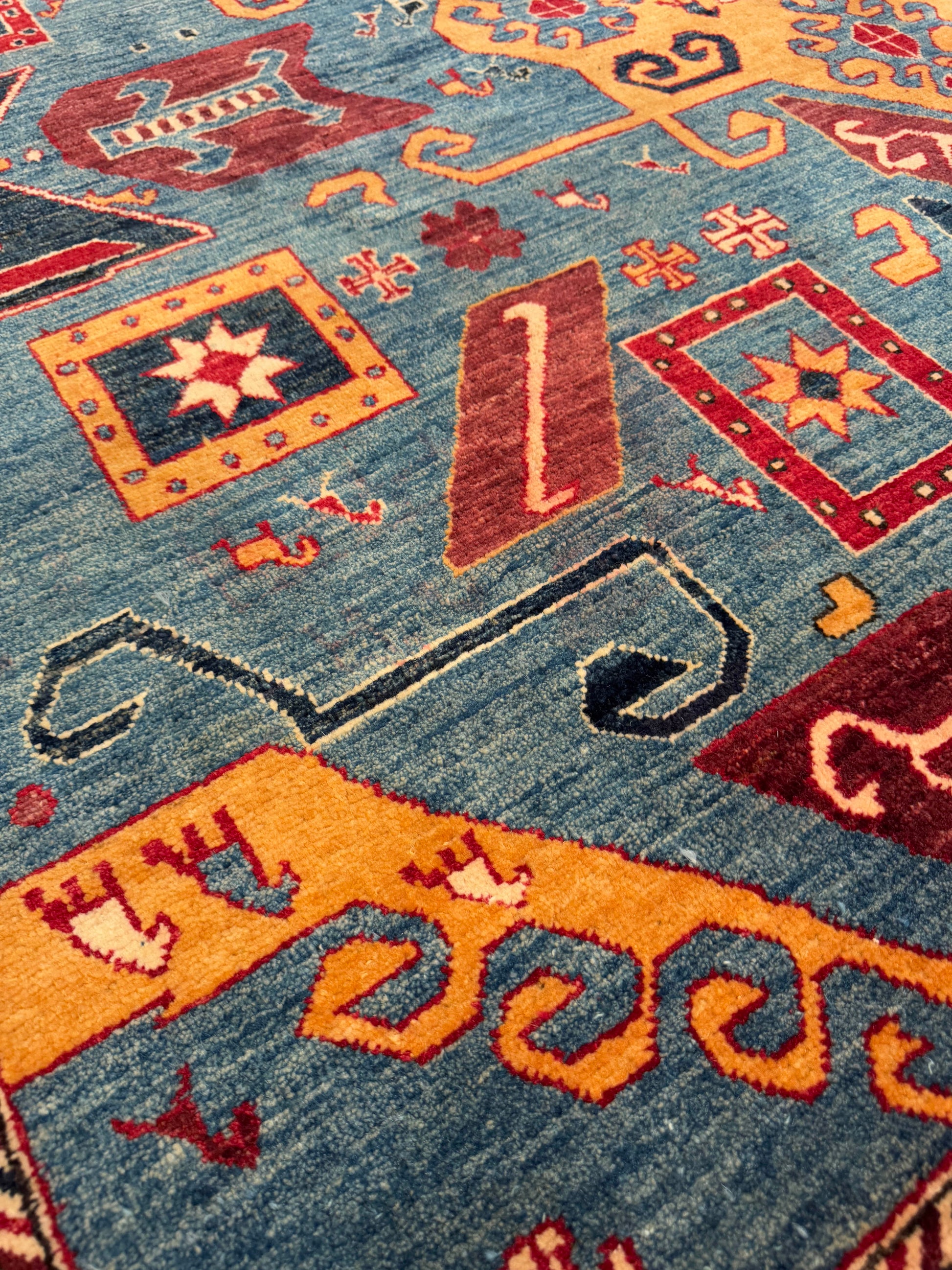 This rug bursts with vivid energy, featuring bold geometric medallions layered along a striking blue field with golden-yellow, crimson, and ivory highlights. The composition is filled with angular motifs, stylized animals, and tribal symbols, giving it a dynamic and storytelling presence. A patterned border frames the field, enhancing the rug’s strong symmetry and visual impact.