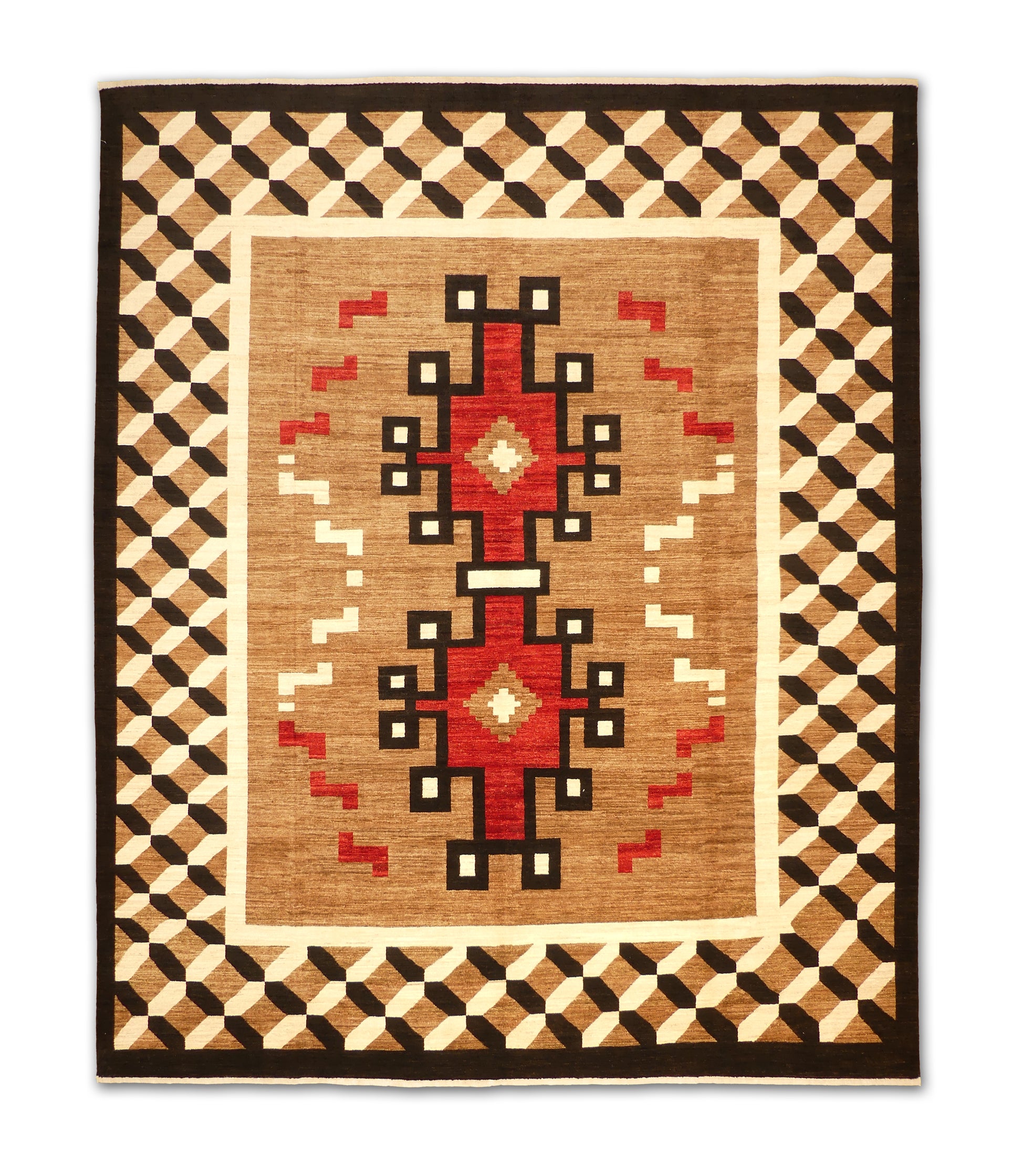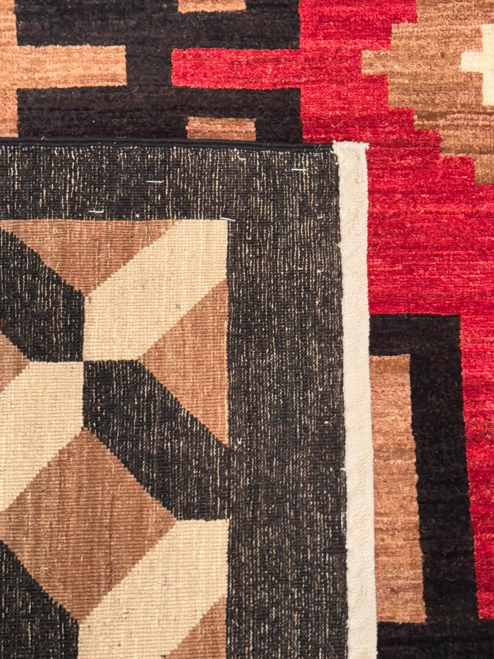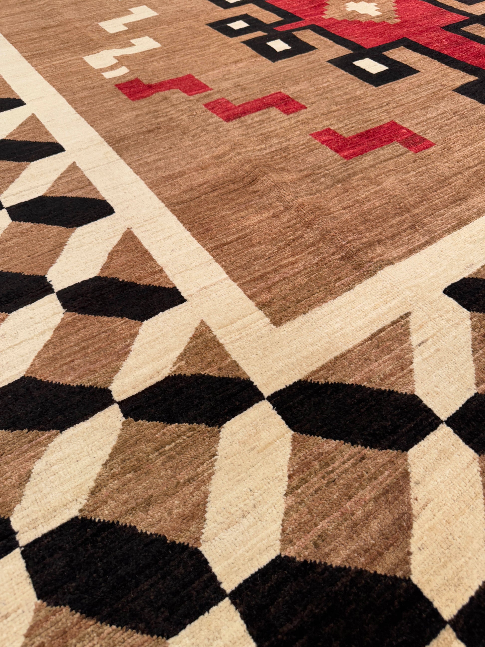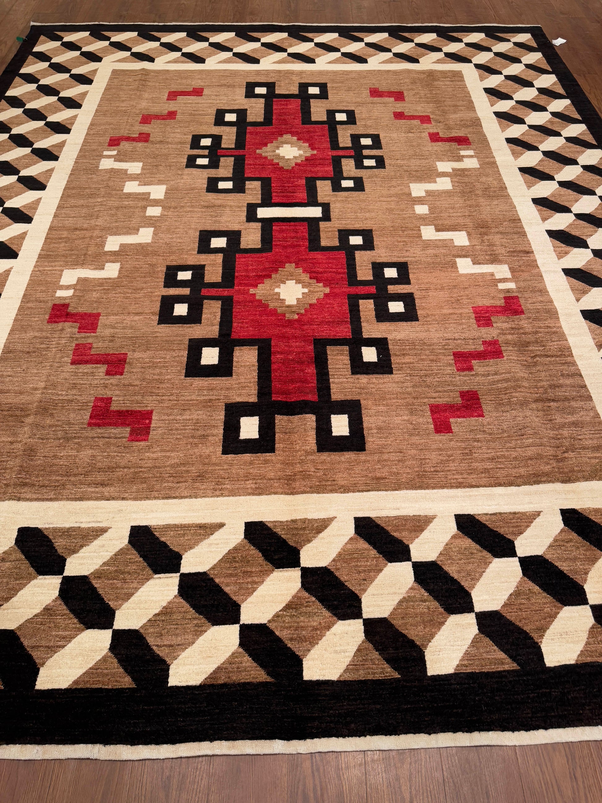 This handmade rug presents a striking geometric composition inspired by tribal and Southwestern aesthetics. The bold central pattern in red and black contrasts beautifully against a warm beige field, while the 3D-style border adds visual depth and dimension. Its graphic symmetry and earthy palette make it both modern and timeless, perfect for spaces that appreciate artistic balance and cultural influence.