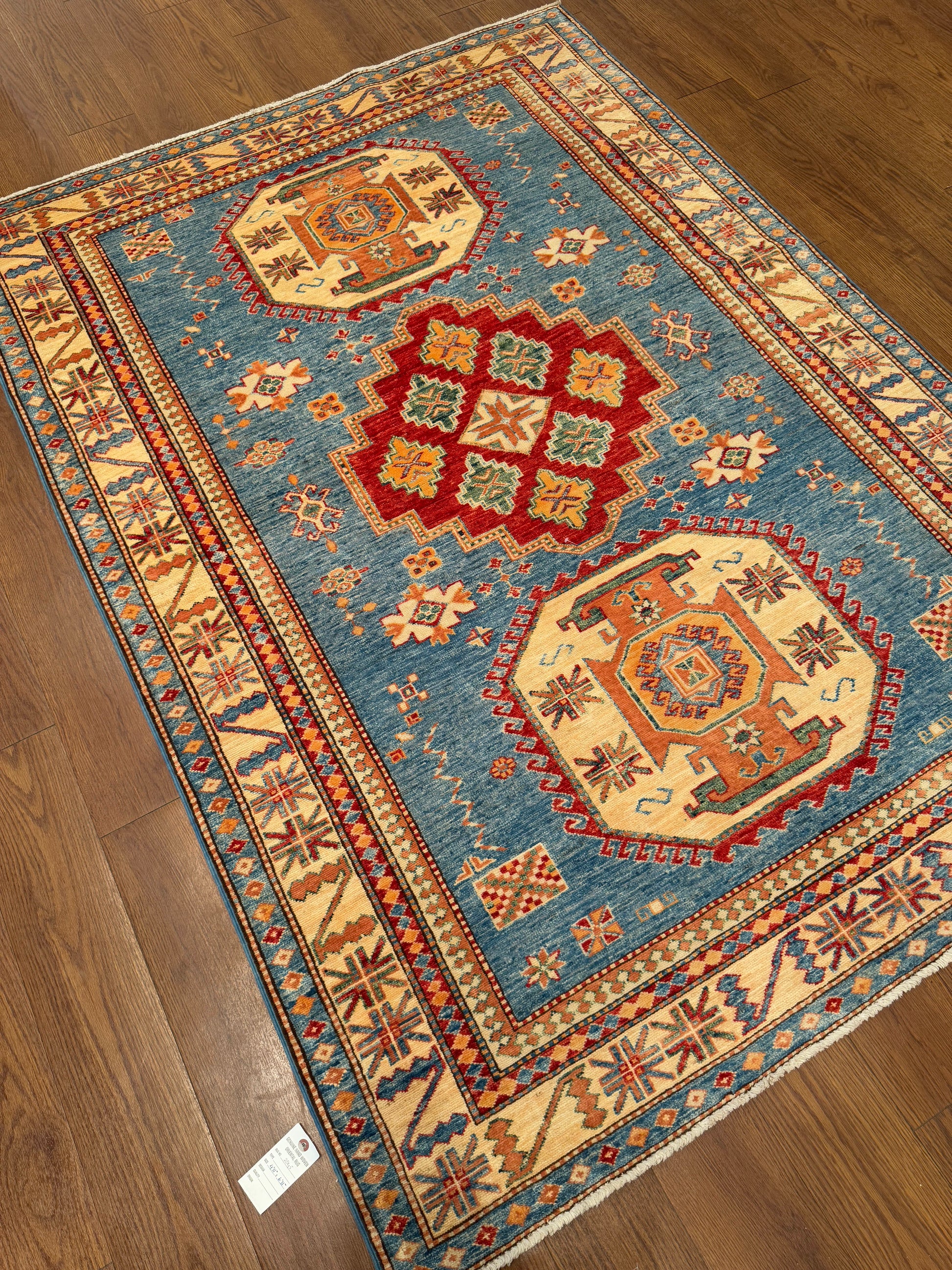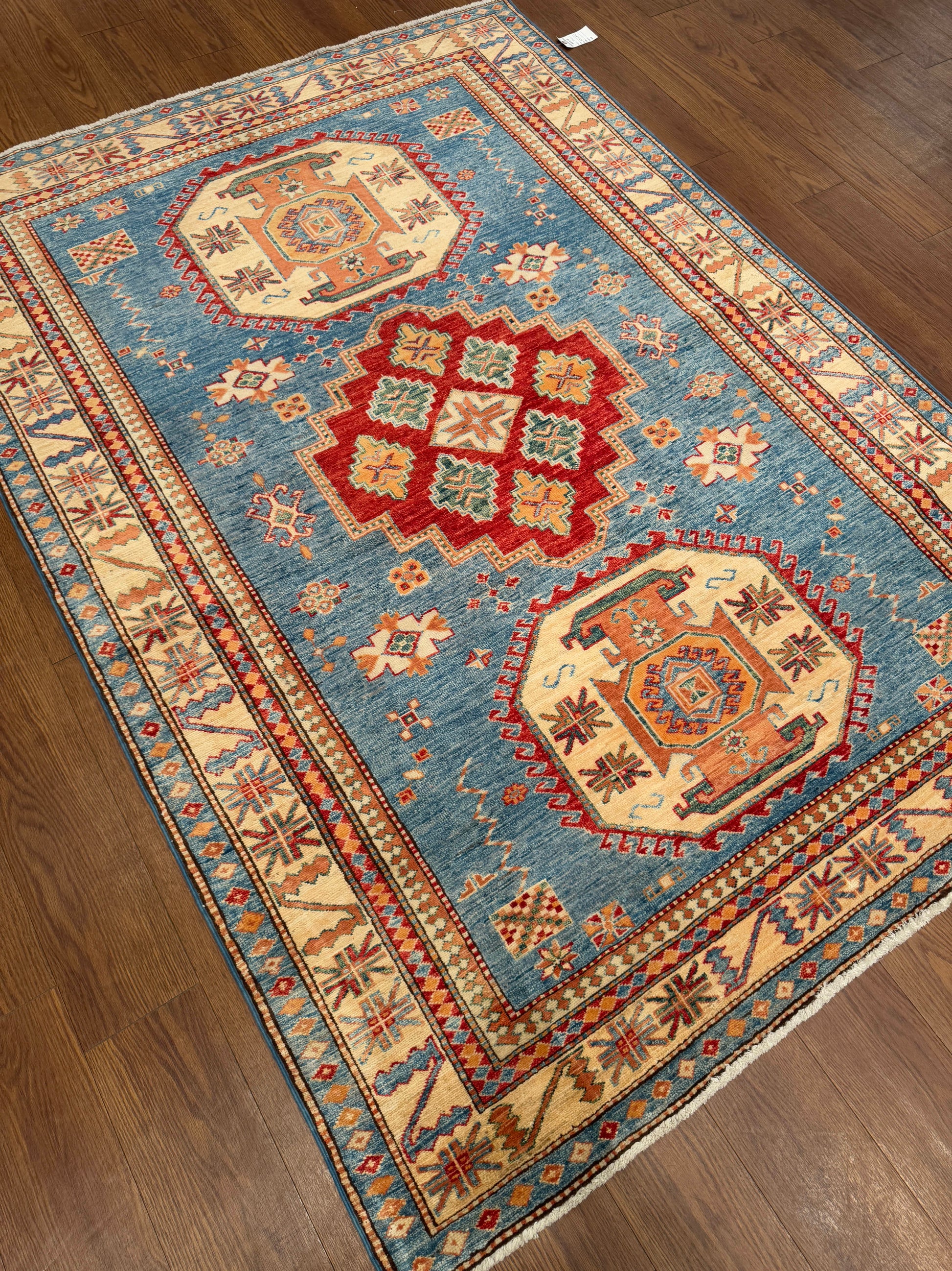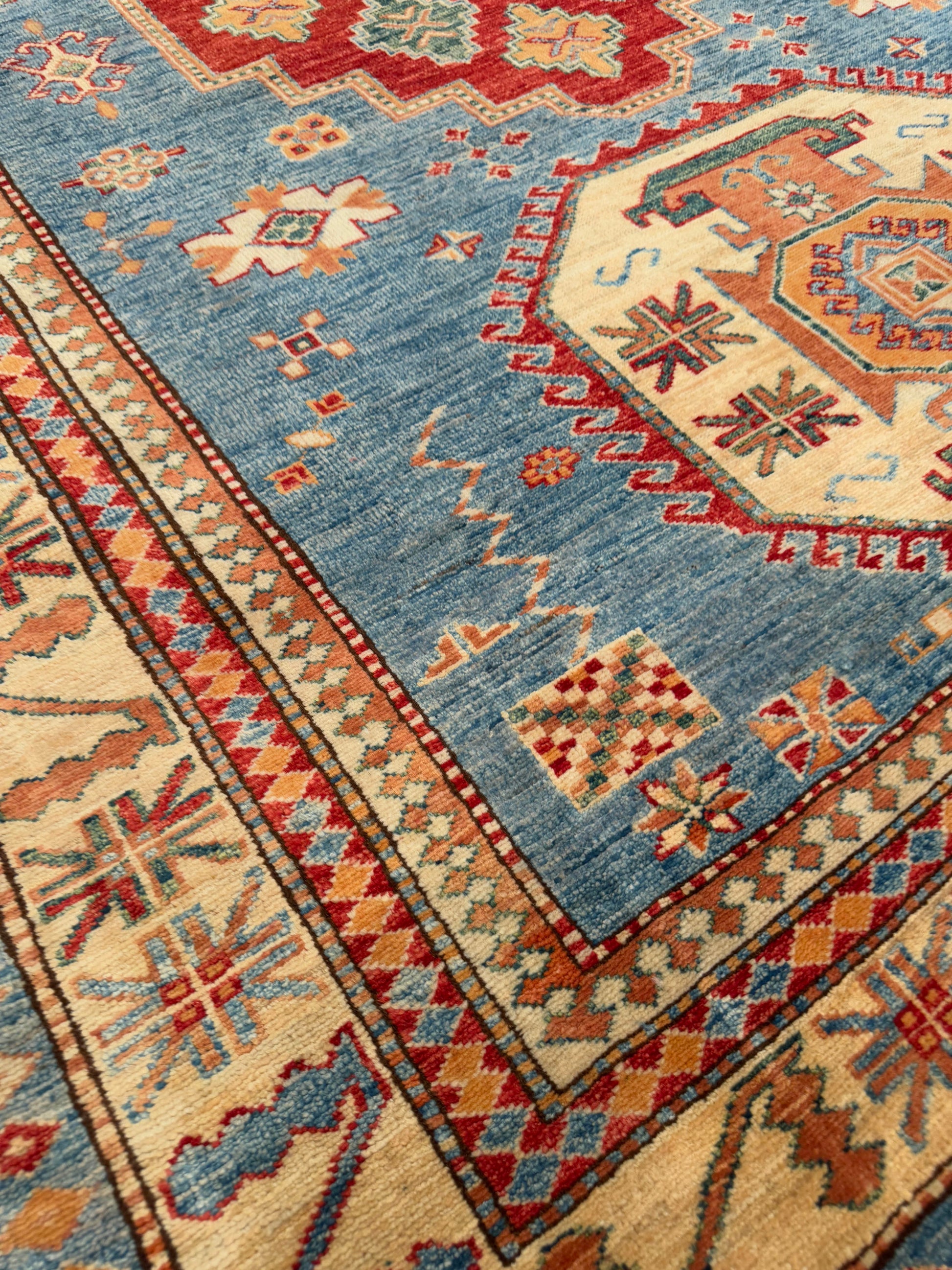 This rug displays a bold arrangement of large central medallions on a soft blue field, blending geometric motifs with vibrant tribal artistry. The octagonal medallions in golden orange and ivory are accented by a striking red diamond motif at the center, framed with small rosettes and angular guard elements. The ivory border is filled with a series of stylized crosses, stepped diamonds, and star-like symbols, providing a dynamic frame that enhances the rug’s symmetry. Its vivid yet harmonious palette of blue, red, gold, and ivory creates a lively presence while retaining traditional Caucasian balance.