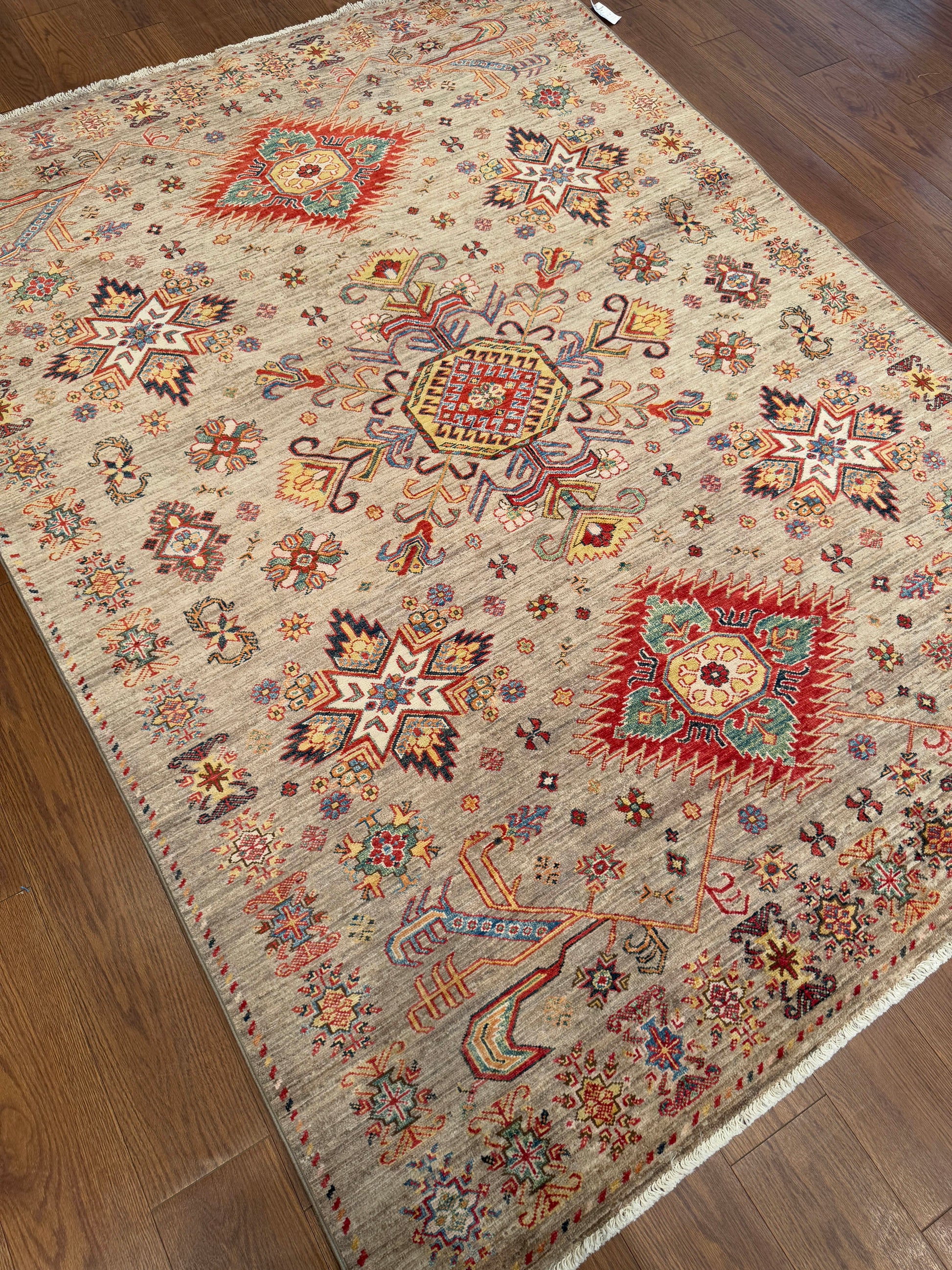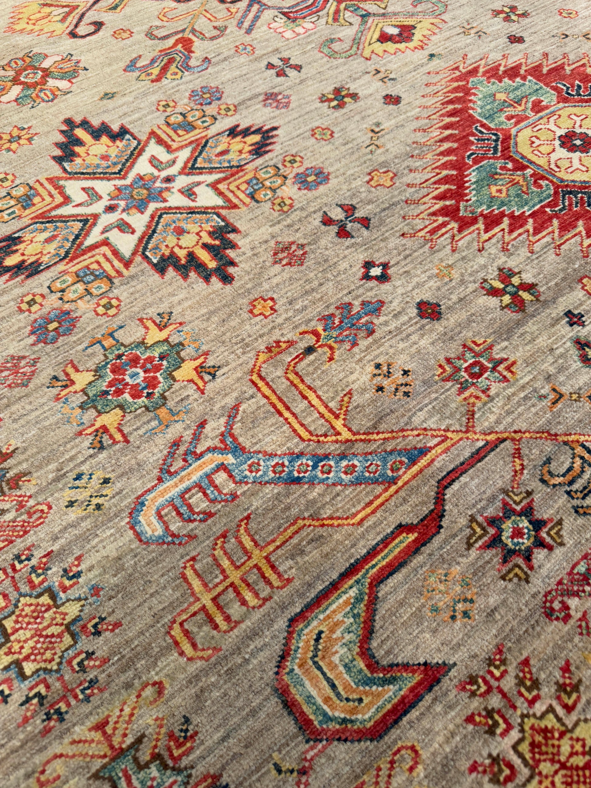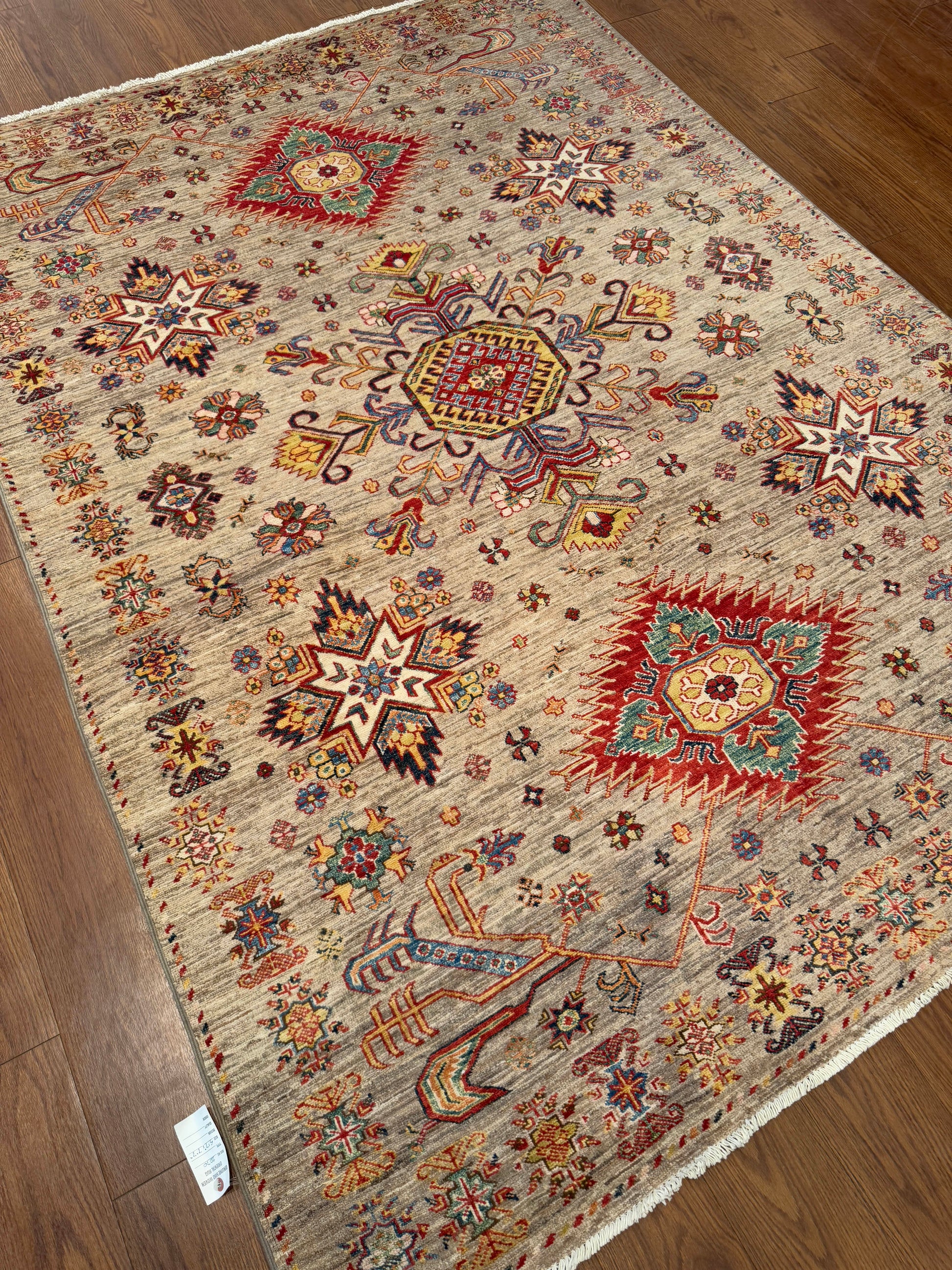 This handwoven rug showcases a striking tribal design on a warm beige field, highlighted by bold diamond medallions in vivid red, emerald, and golden tones. Intricate starbursts, rosettes, and geometric motifs are scattered throughout, bringing energy and rhythm to the composition. Playful animal figures woven into the lower corners add a unique storytelling element, connecting the piece to its traditional roots. The overall balance of bold central medallions and delicate motifs makes this rug both a statement piece and a versatile foundation for any interior.