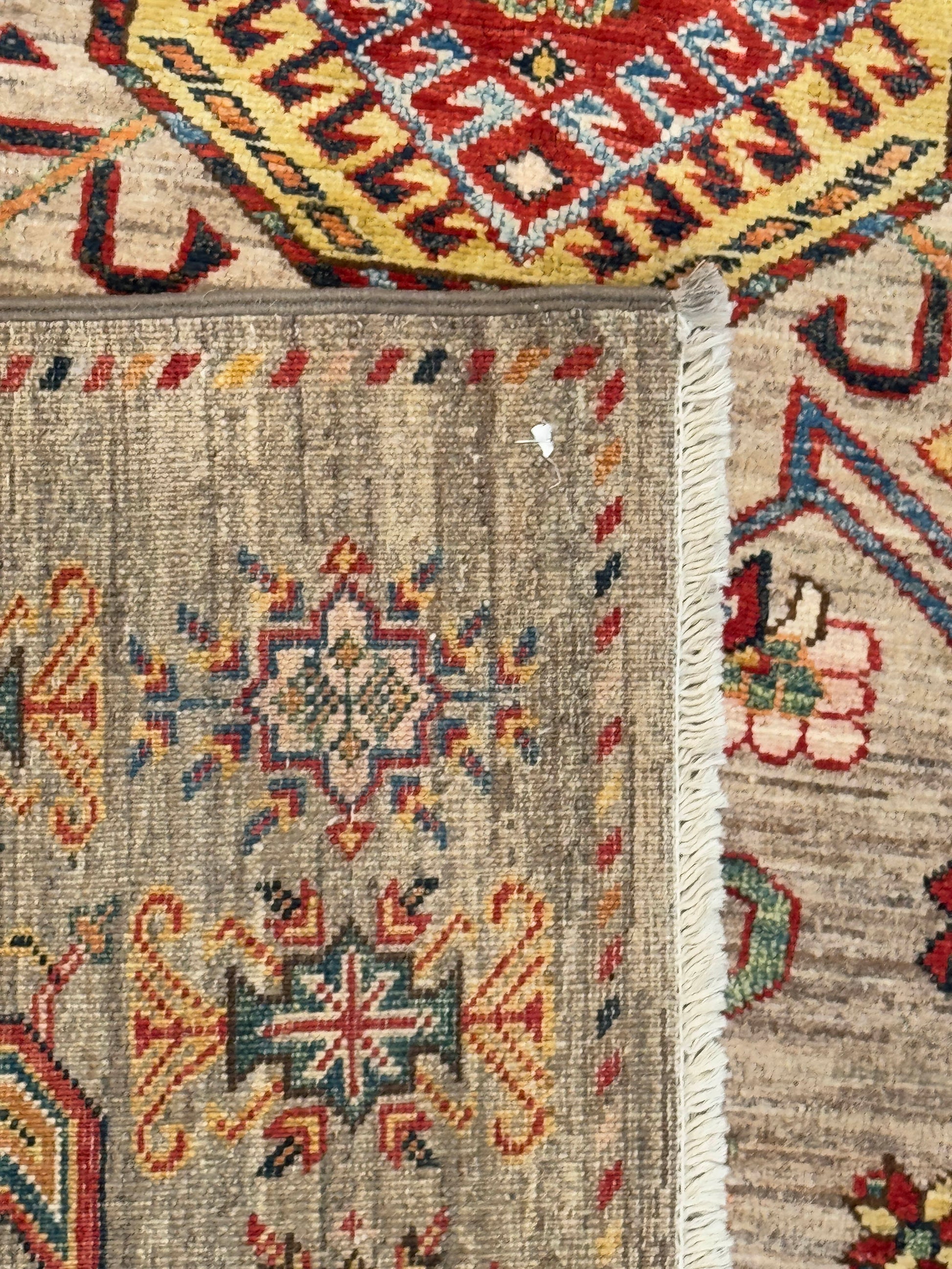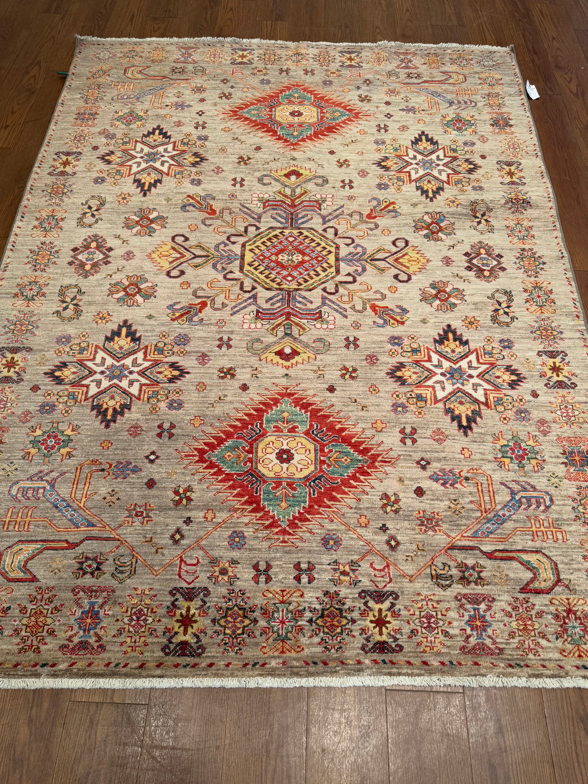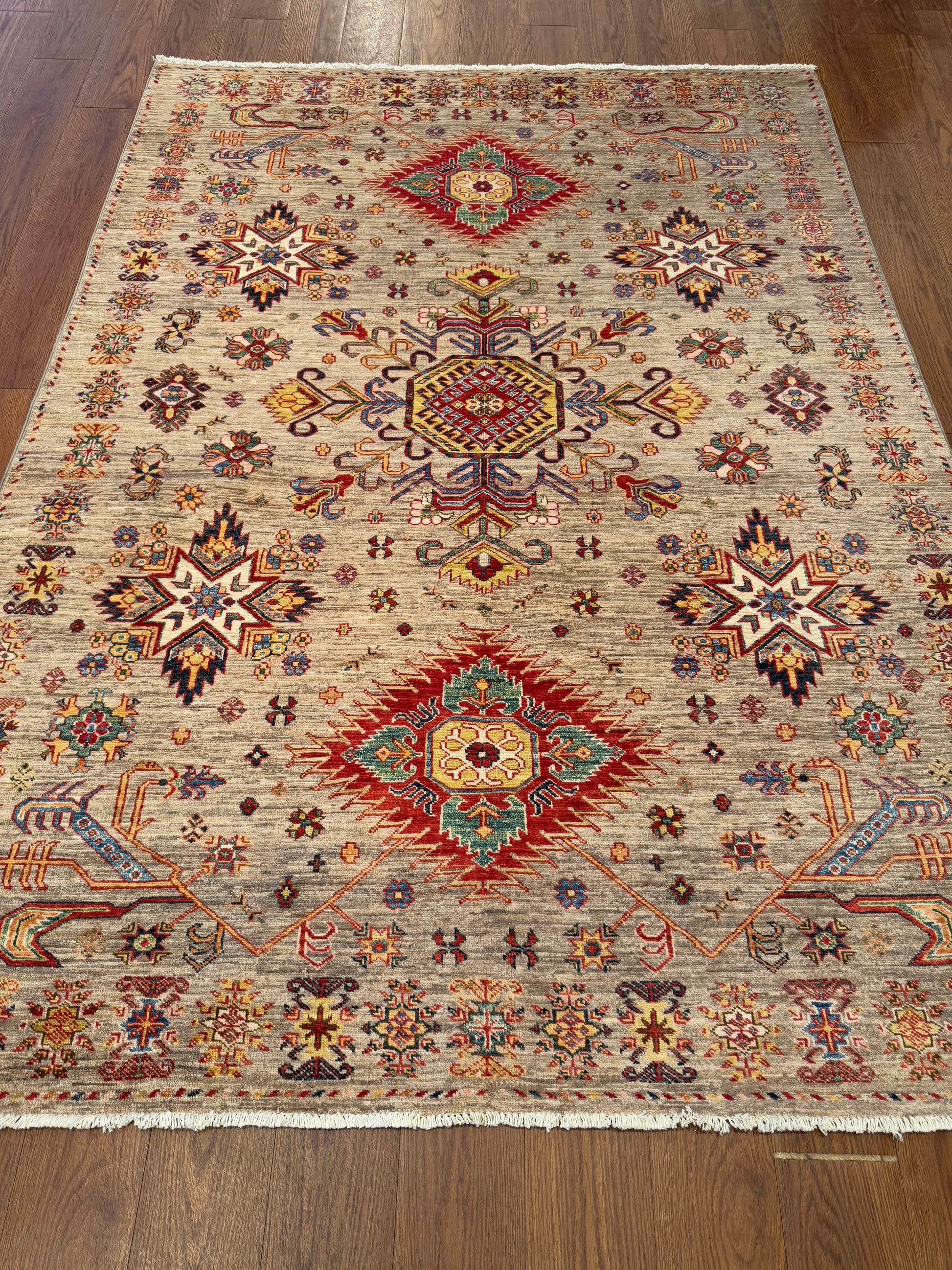 This handwoven rug showcases a striking tribal design on a warm beige field, highlighted by bold diamond medallions in vivid red, emerald, and golden tones. Intricate starbursts, rosettes, and geometric motifs are scattered throughout, bringing energy and rhythm to the composition. Playful animal figures woven into the lower corners add a unique storytelling element, connecting the piece to its traditional roots. The overall balance of bold central medallions and delicate motifs makes this rug both a statement piece and a versatile foundation for any interior.