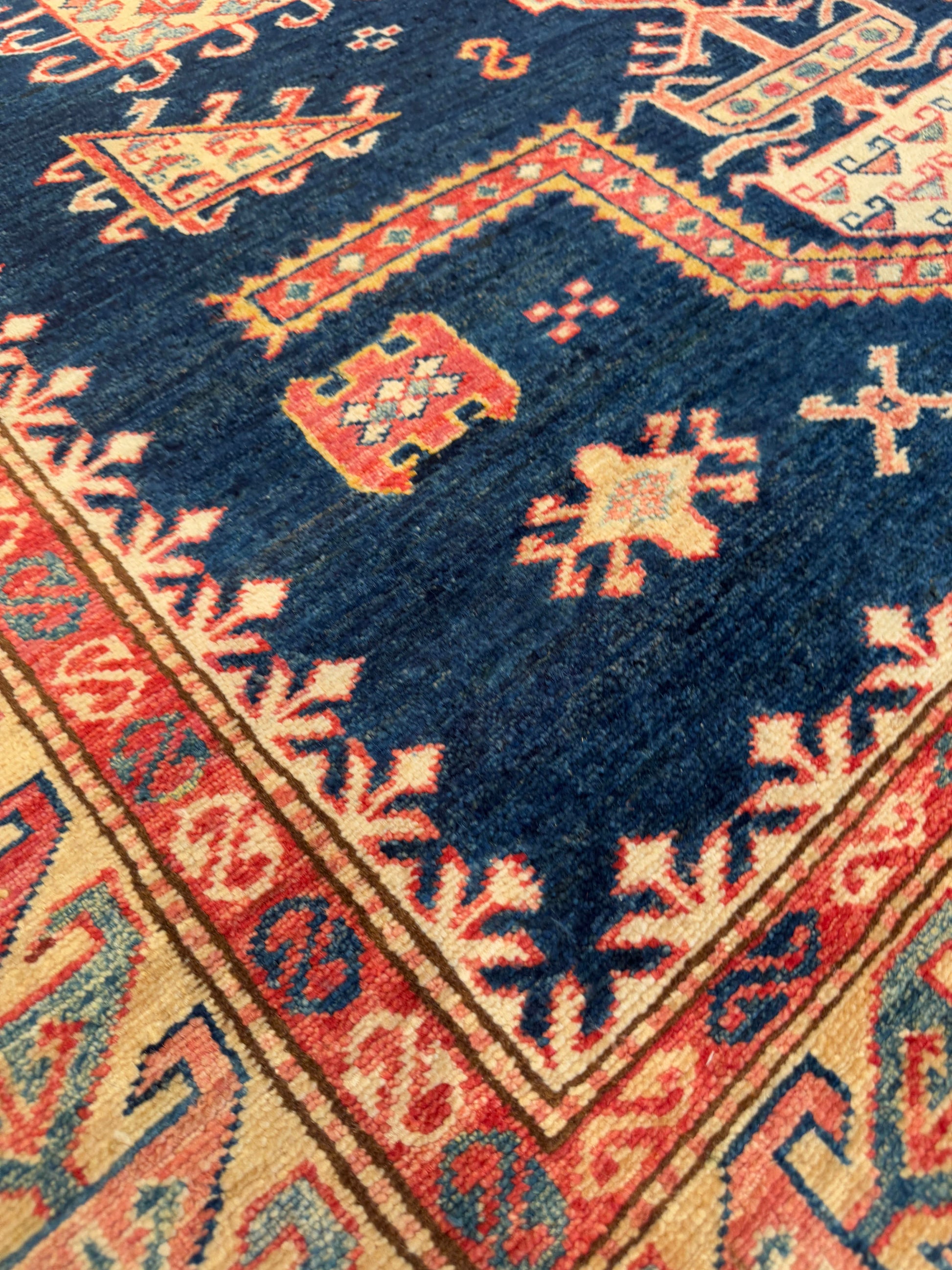 This handwoven rug features a bold navy field accented by a central ivory square medallion framed with intricate geometric motifs. Angular tribal elements and stylized figures bring movement and character to the design, while the detailed borders create harmony with their repeating patterns. Its rich contrast of dark and light tones makes it a statement piece for both traditional and modern interiors.