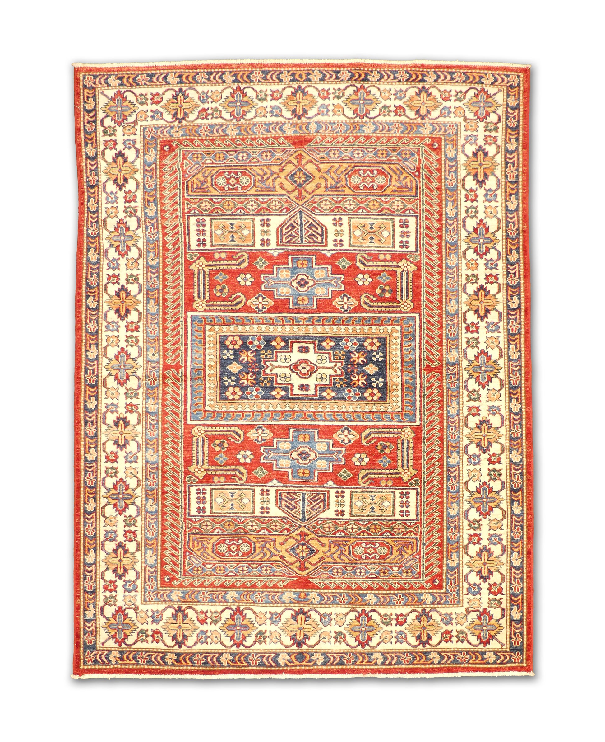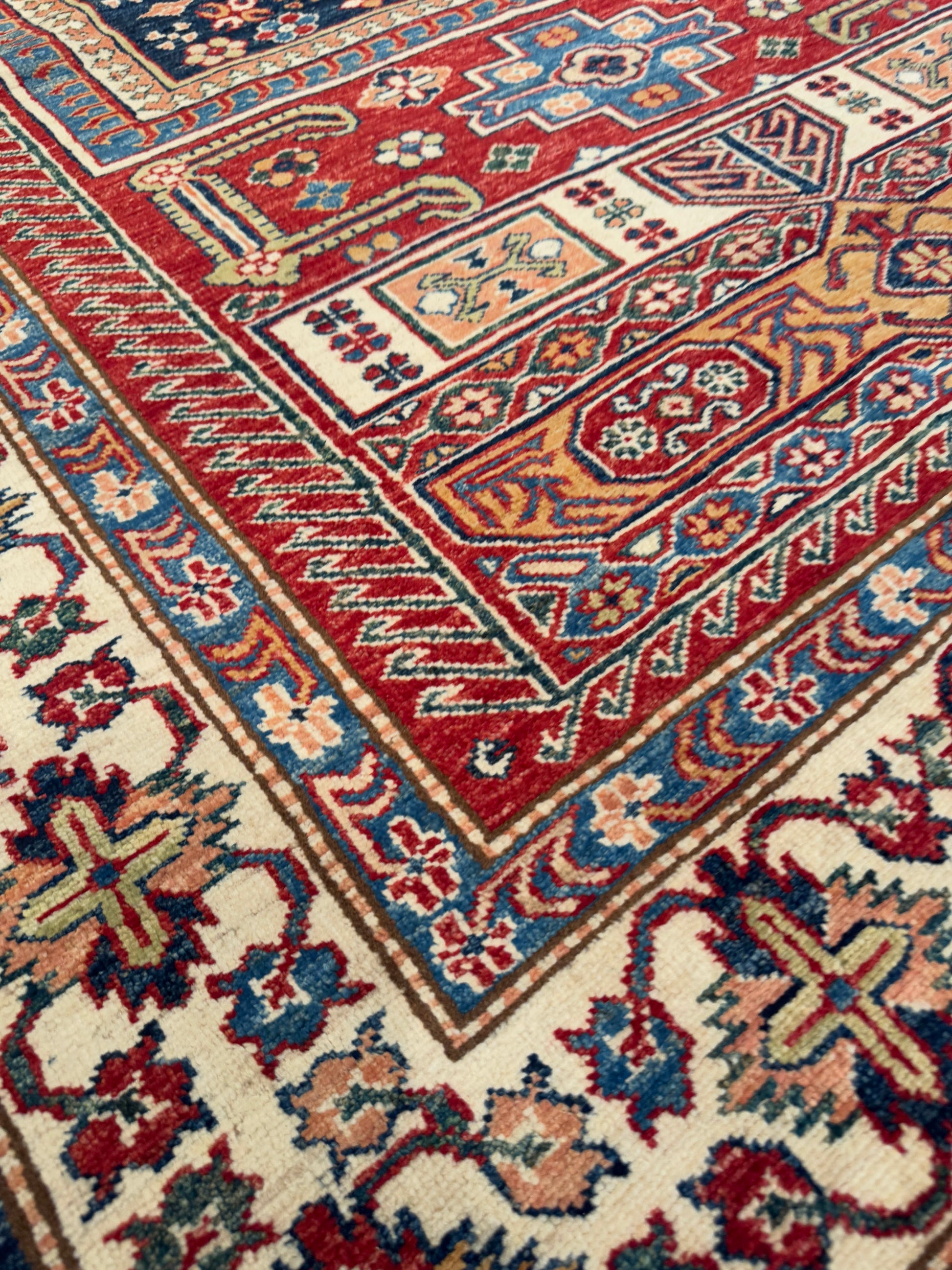 This rug features a richly detailed field of geometric panels, each decorated with intricate motifs that balance symmetry and artistry. The bold red ground contrasts beautifully with deep blue, ivory, and golden accents, framed by elaborate borders. Its refined craftsmanship and vibrant palette bring both structure and elegance to any space.
