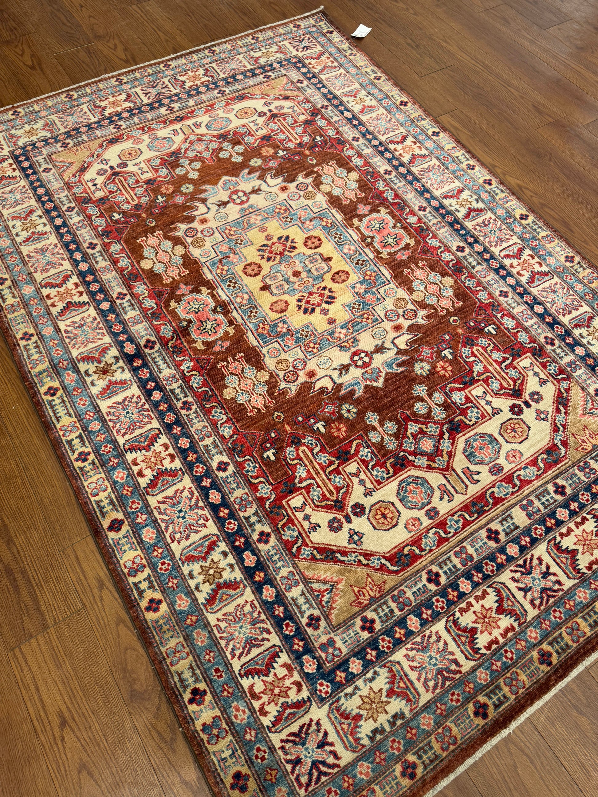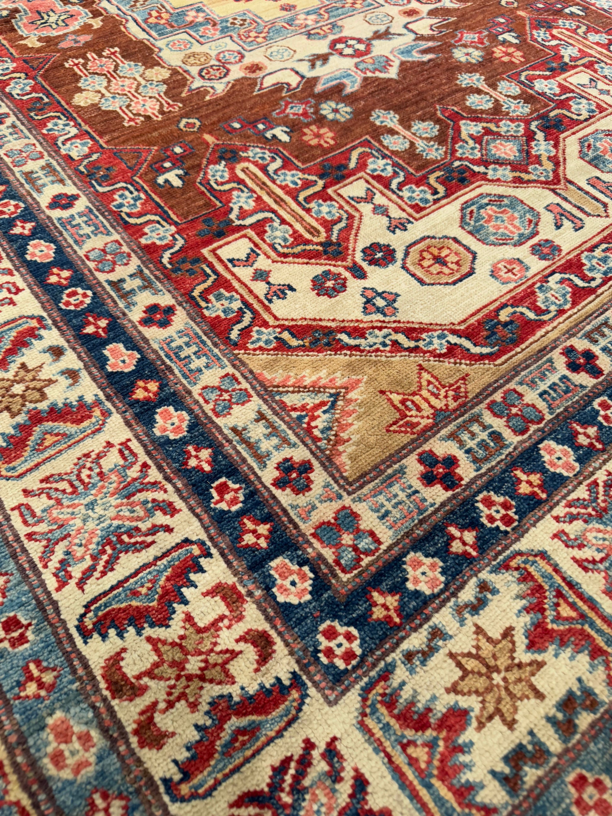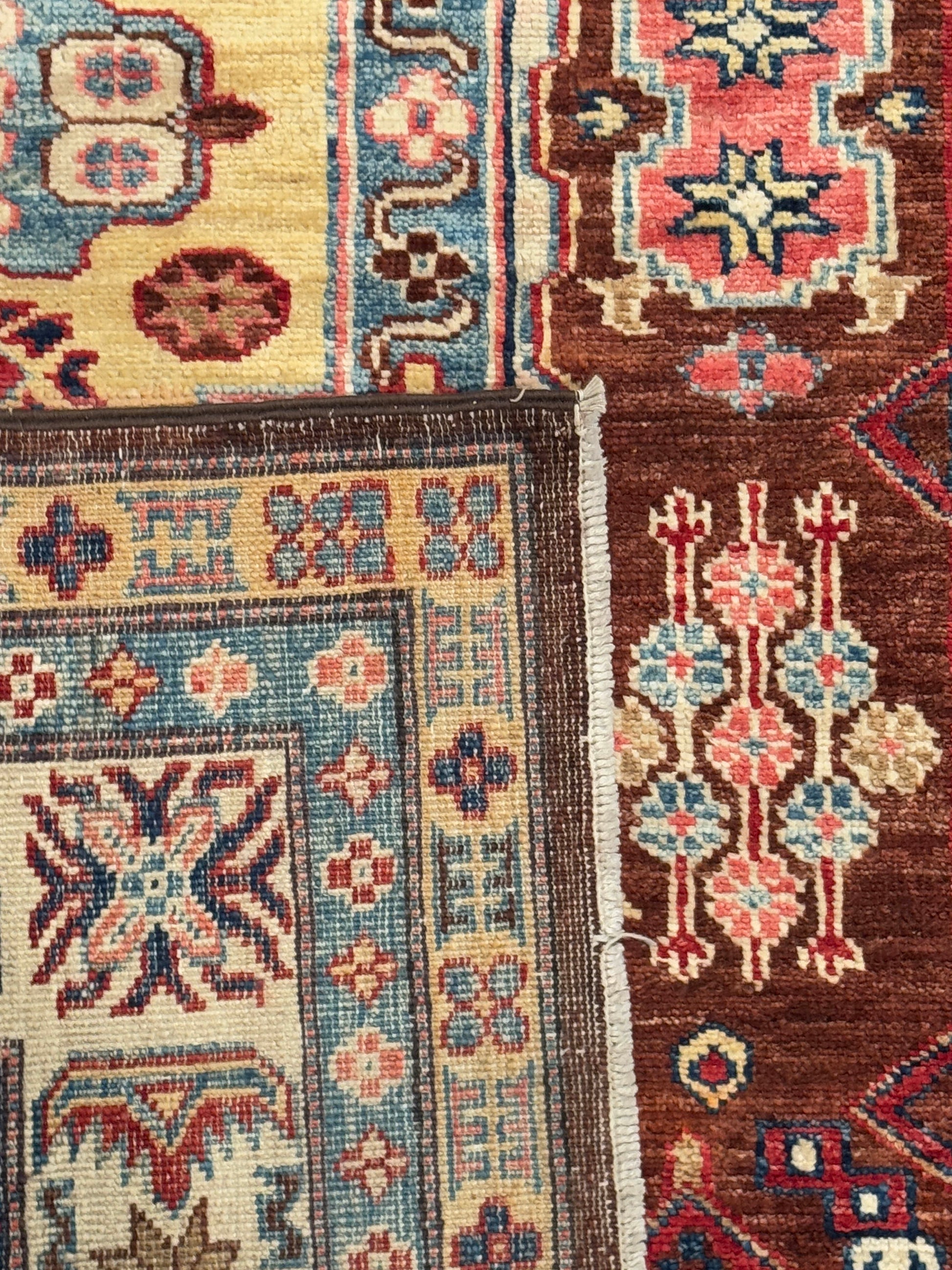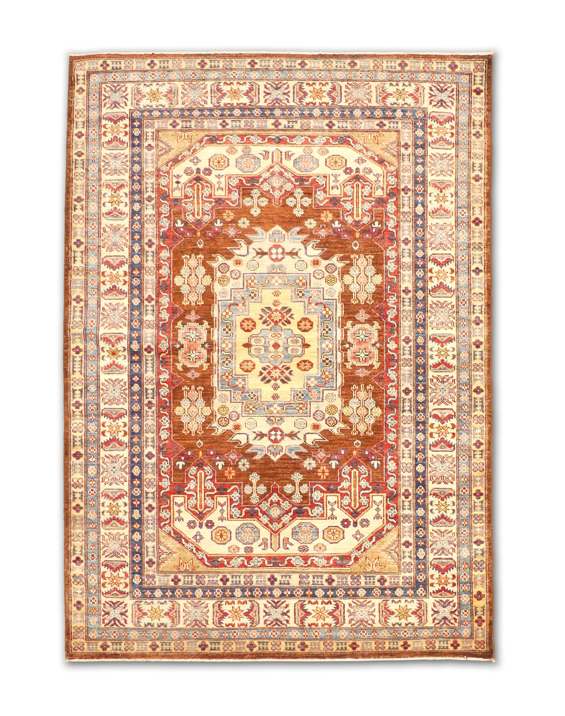 This handwoven rug showcases a central medallion design surrounded by rich geometric and floral motifs. The warm brown field is accented with ivory, red, and blue, giving it a grounding yet elegant character. Crafted with fine detail, it balances symmetry with artistic charm. A timeless piece that brings both history and refinement into modern spaces.