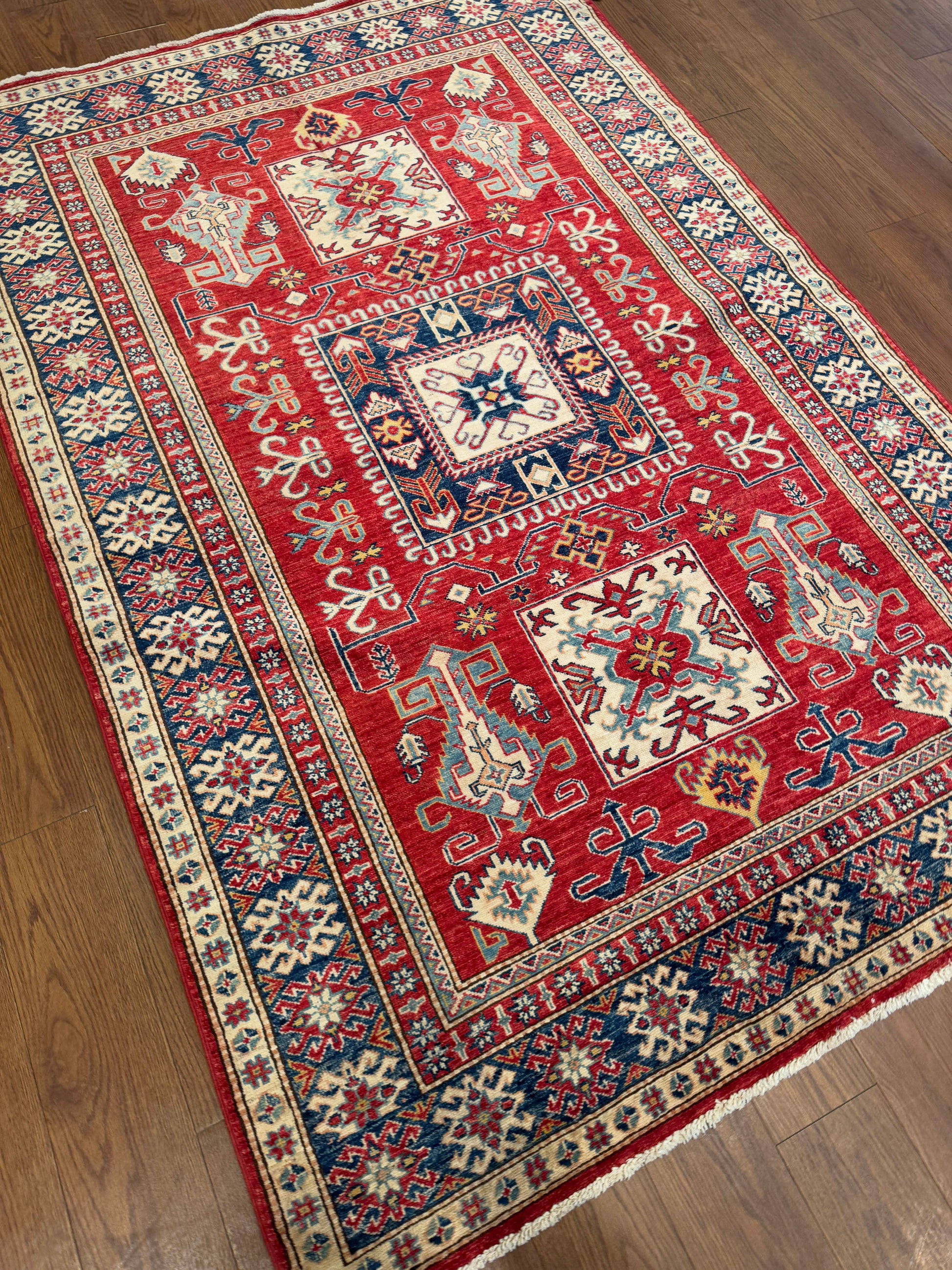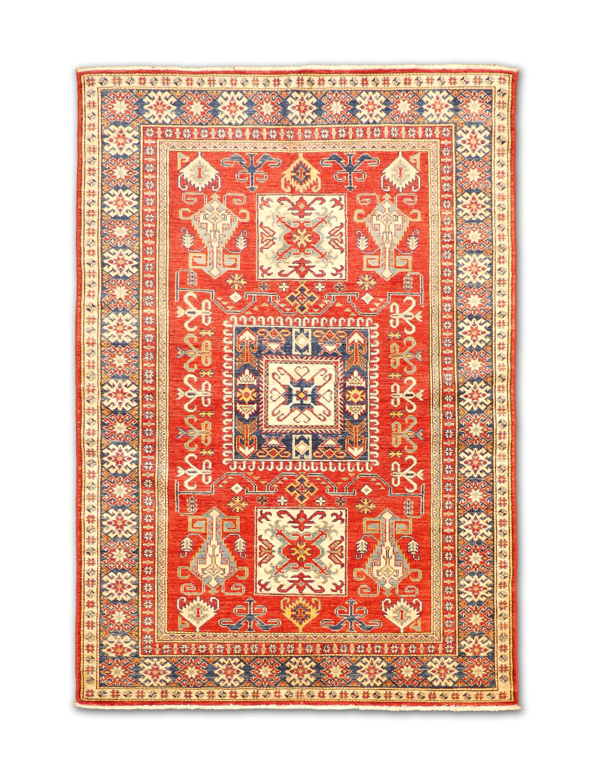 This striking handwoven rug features a bold red field enriched with square medallions and intricate geometric motifs. The central ivory and blue accents contrast beautifully with the deep red background, while the borders are filled with repeating star and floral patterns. The combination of vibrant tones and detailed craftsmanship gives the rug a dynamic yet balanced aesthetic. Its design reflects timeless tradition while adding warmth and sophistication to any interior.