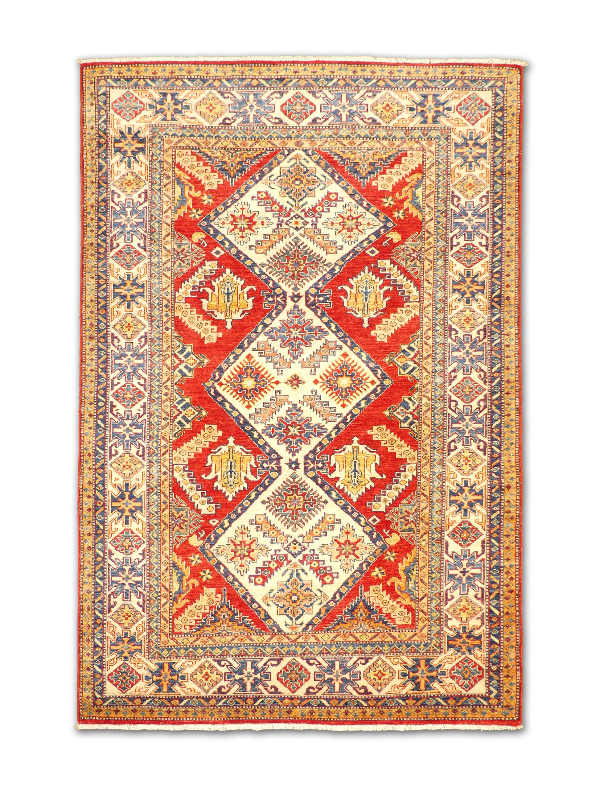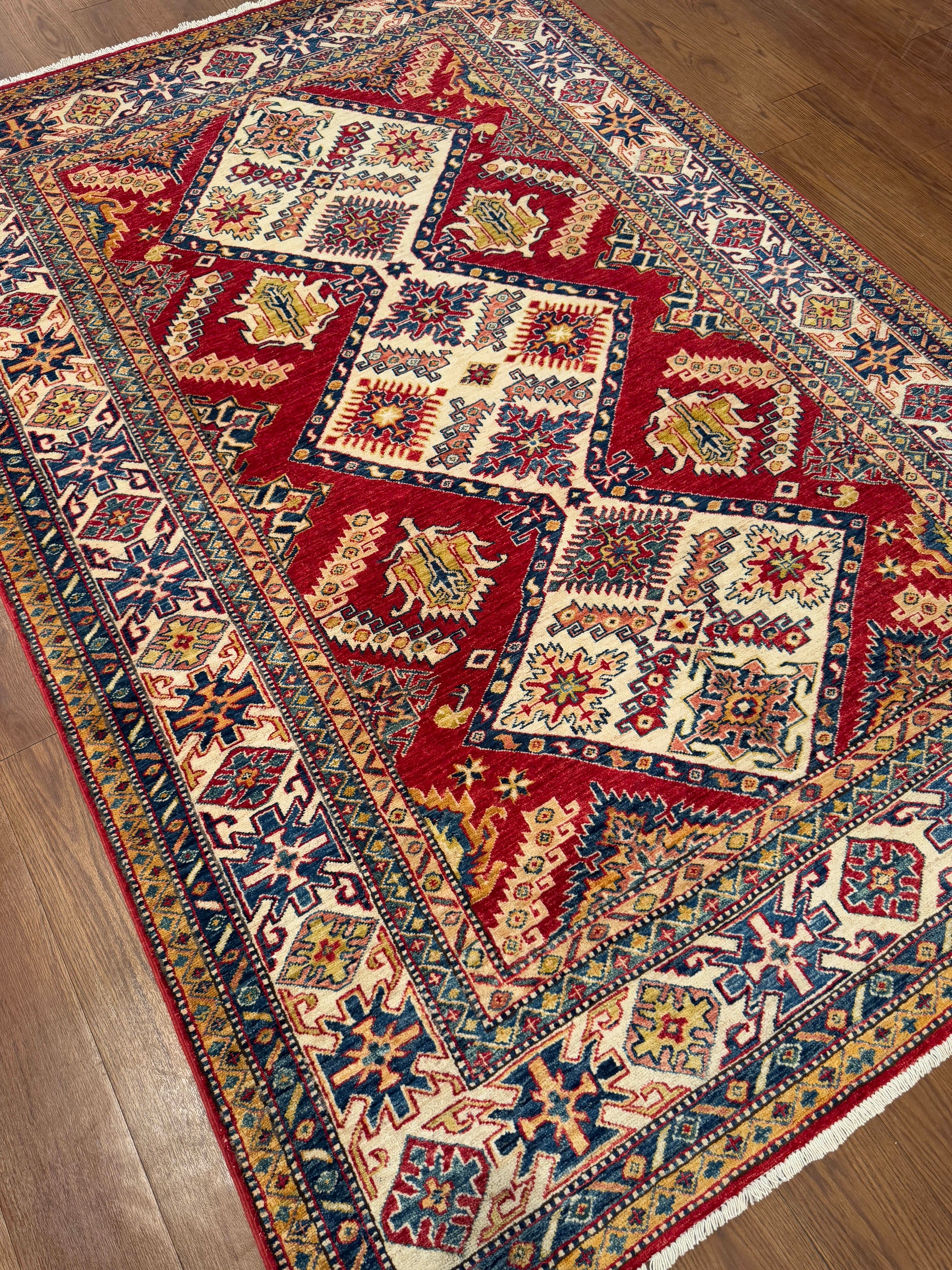 This vibrant handwoven rug showcases a bold diamond lattice design with alternating red and ivory medallions filled with intricate geometric and floral patterns. The strong red field sets a striking contrast to the ivory elements, while golden yellow, navy, and teal accents add depth and richness. Its detailed border in ivory and blue frames the interior with balance and precision, highlighting the rug’s traditional craftsmanship. With its dynamic pattern and vibrant tones, this piece is perfect for adding warmth and energy to any room.