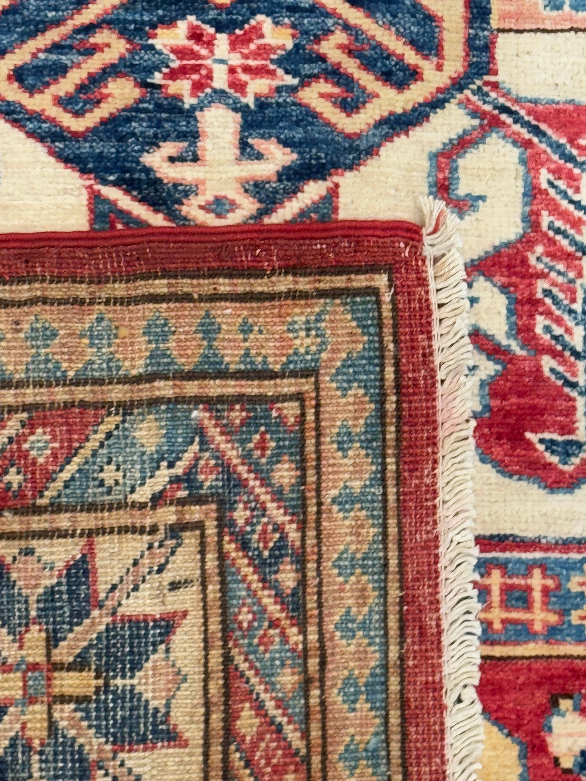 This handwoven rug showcases a striking central medallion with bold geometric motifs in ivory, navy, and red, accented by stylized tree-like figures and intricate tribal symbols. The vibrant red field is framed by a detailed ivory border filled with repeating floral star motifs, lending both balance and elegance. Its design reflects the traditional artistry of Caucasian weaving, making it a powerful statement piece with timeless charm.