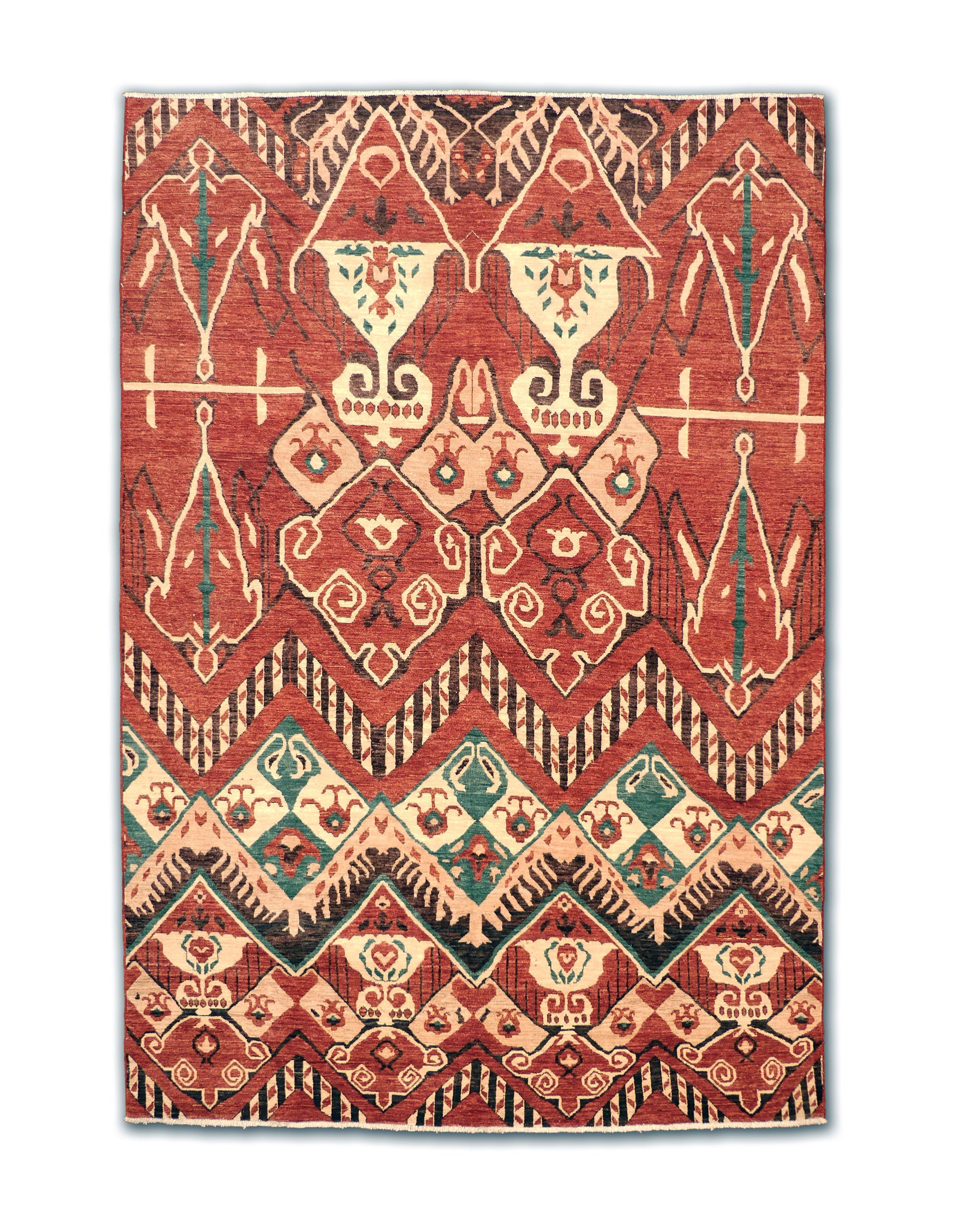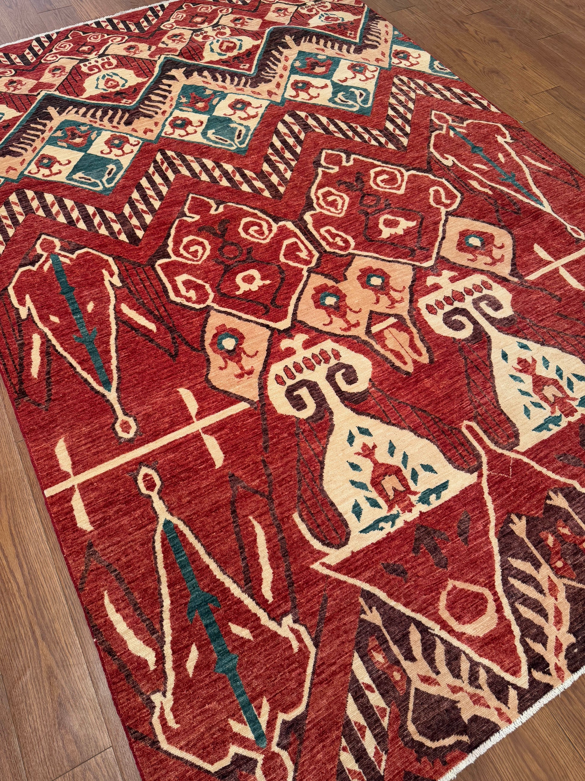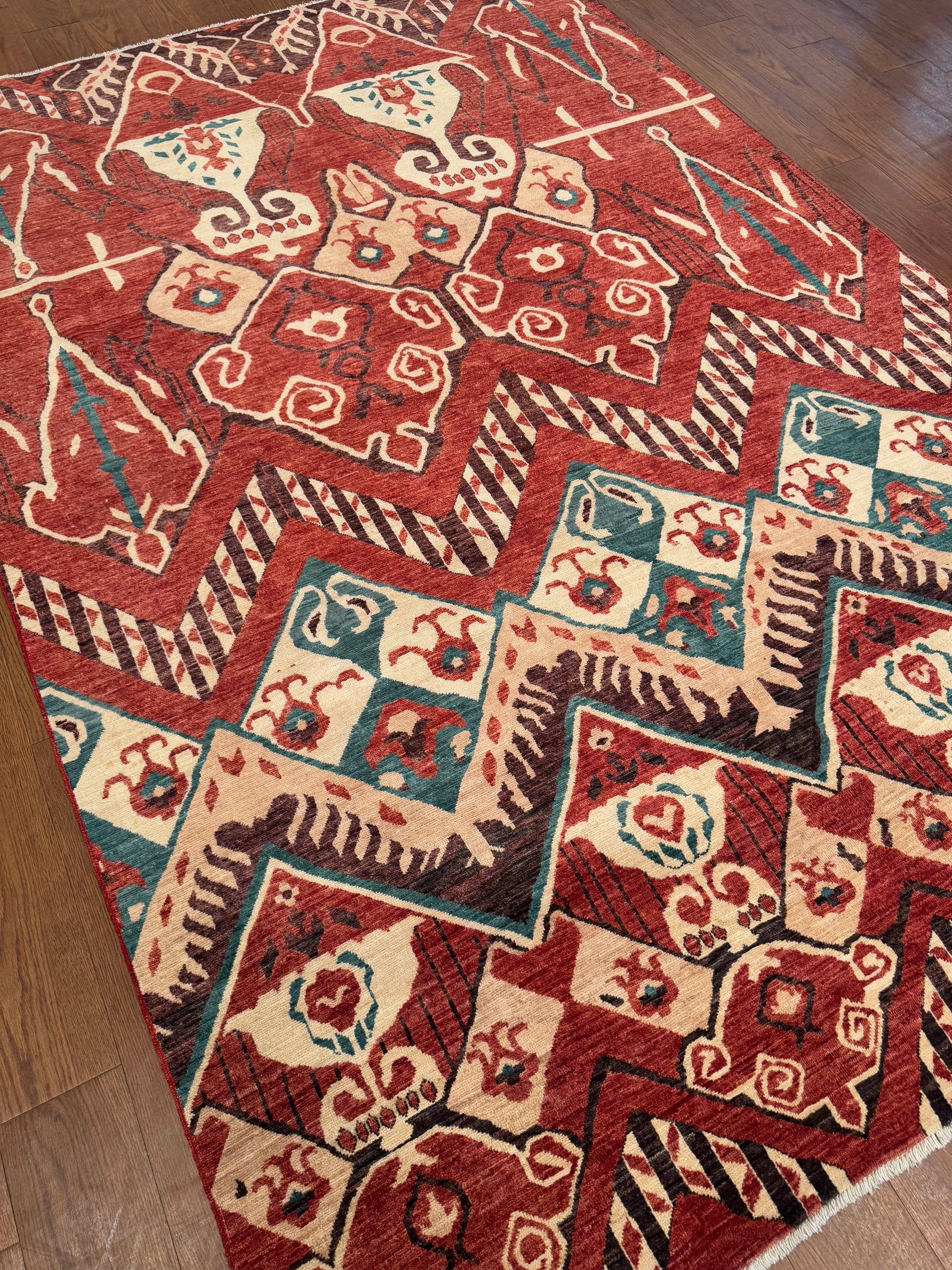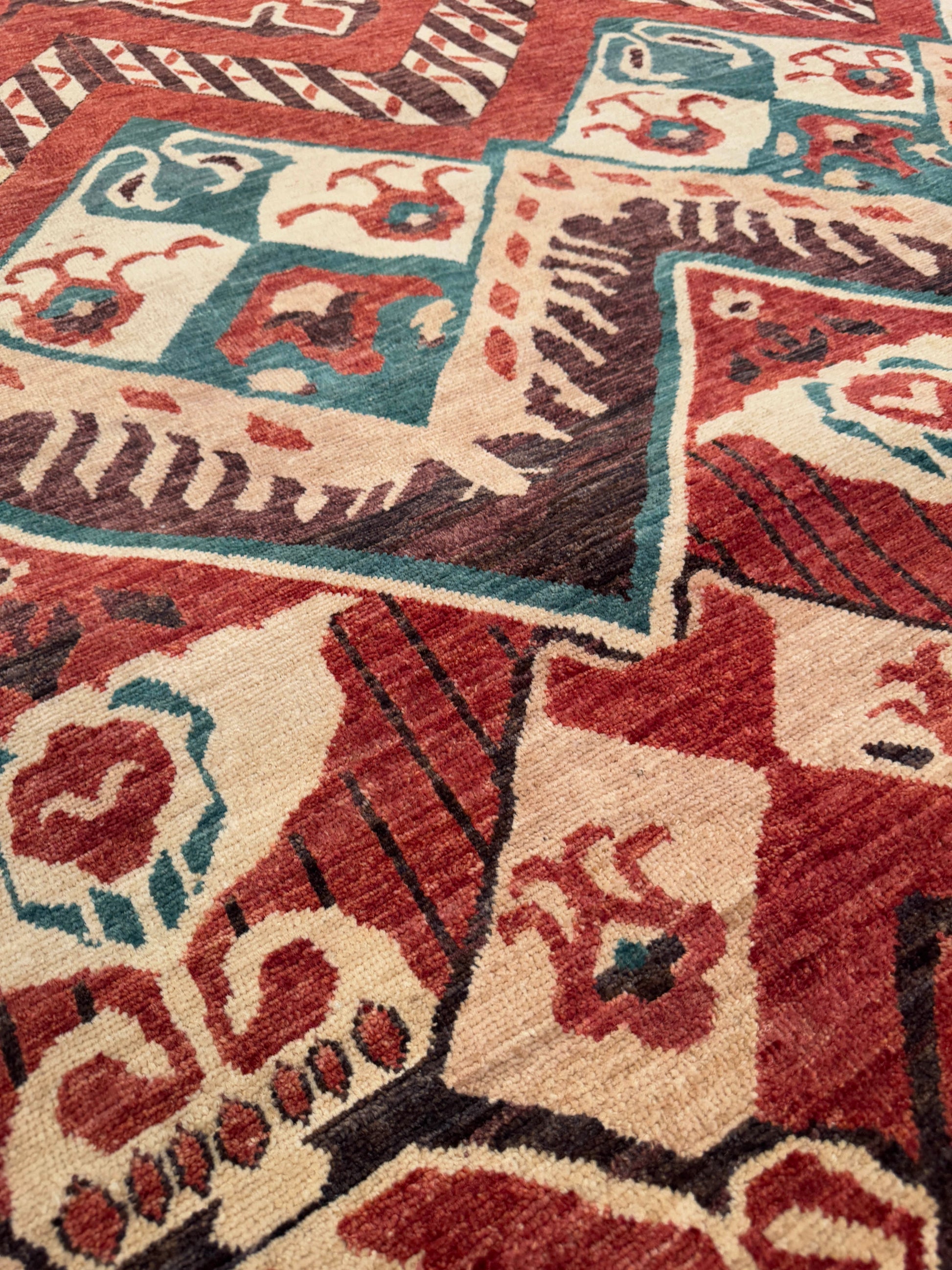 This striking handwoven wool rug commands attention with its vivid geometric layout and rich use of color. The dynamic red field is accented by ivory, teal, and chocolate brown motifs arranged in bold zigzag and diamond forms. Full of movement and energy, this rug adds a dramatic focal point while honoring traditional weaving artistry.