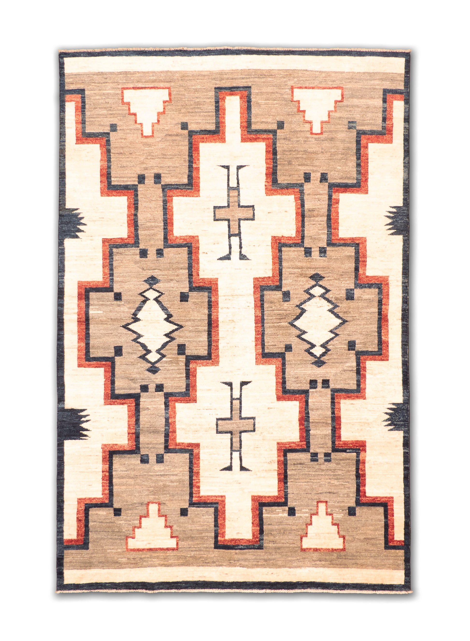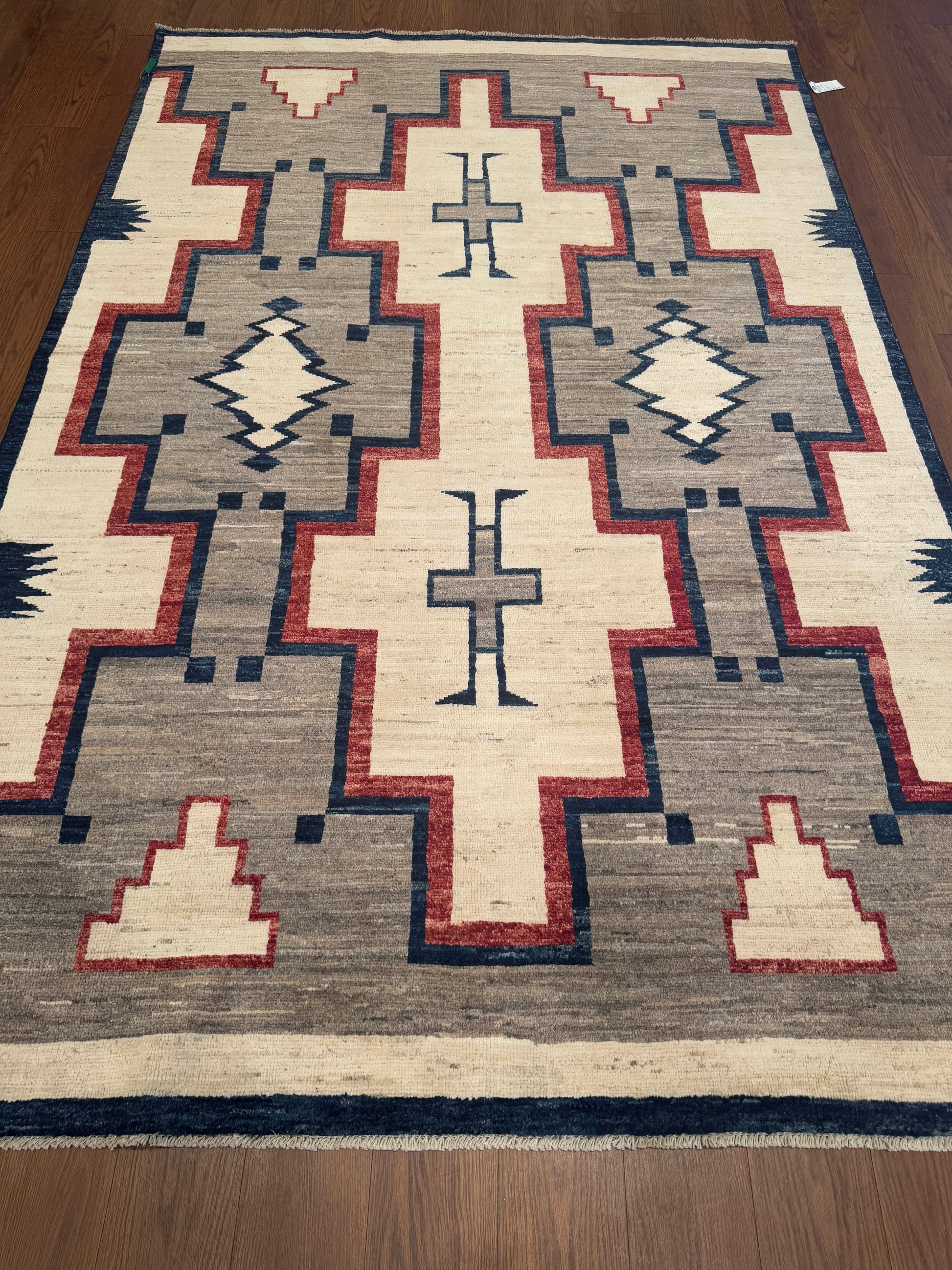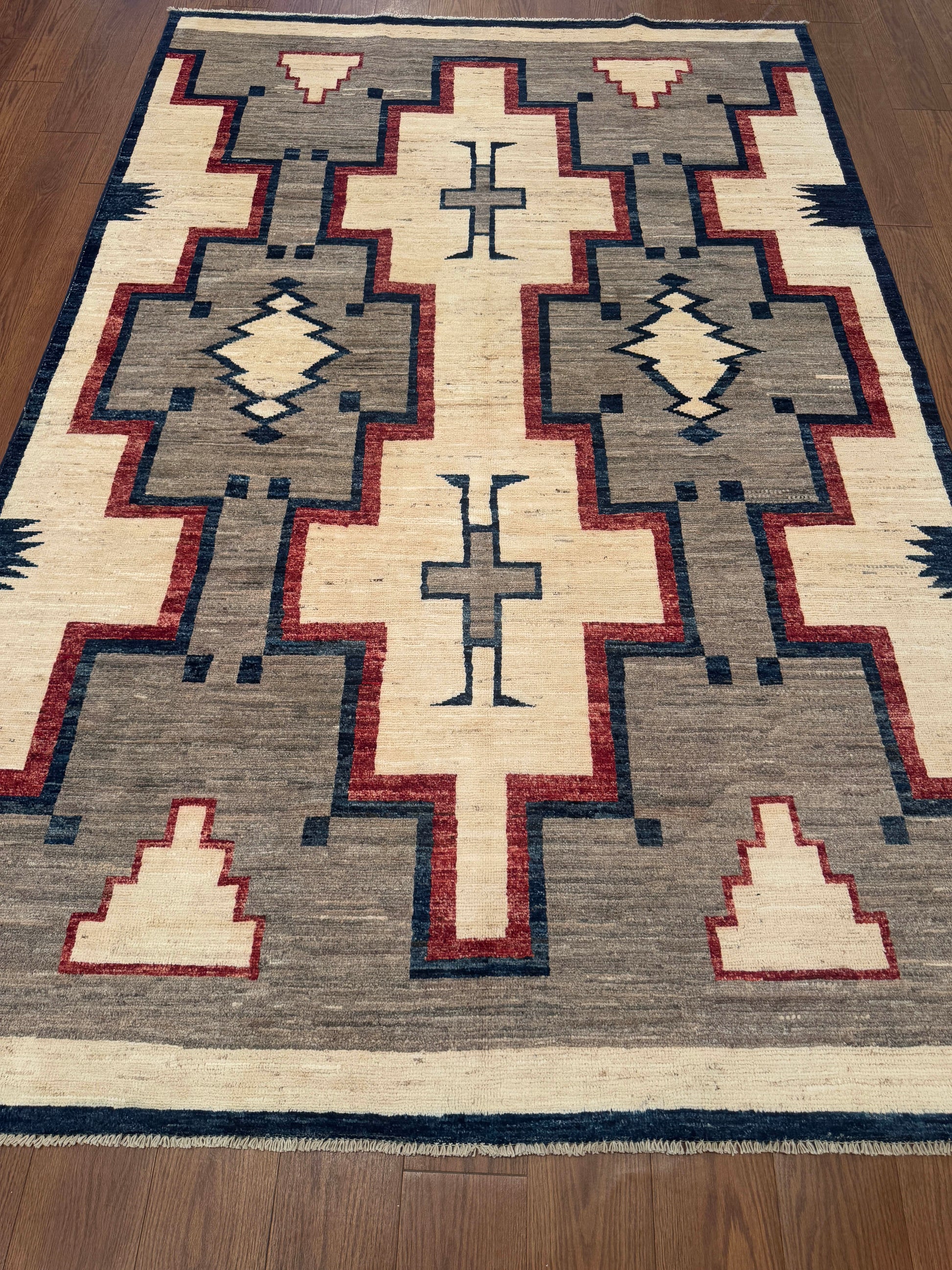 This striking handwoven wool rug showcases bold geometric motifs inspired by tribal patterns. The design features strong lines in red and navy set against soft beige and gray tones, creating a balanced yet dynamic visual impact. Its contemporary-meets-traditional aesthetic makes it a versatile statement piece.