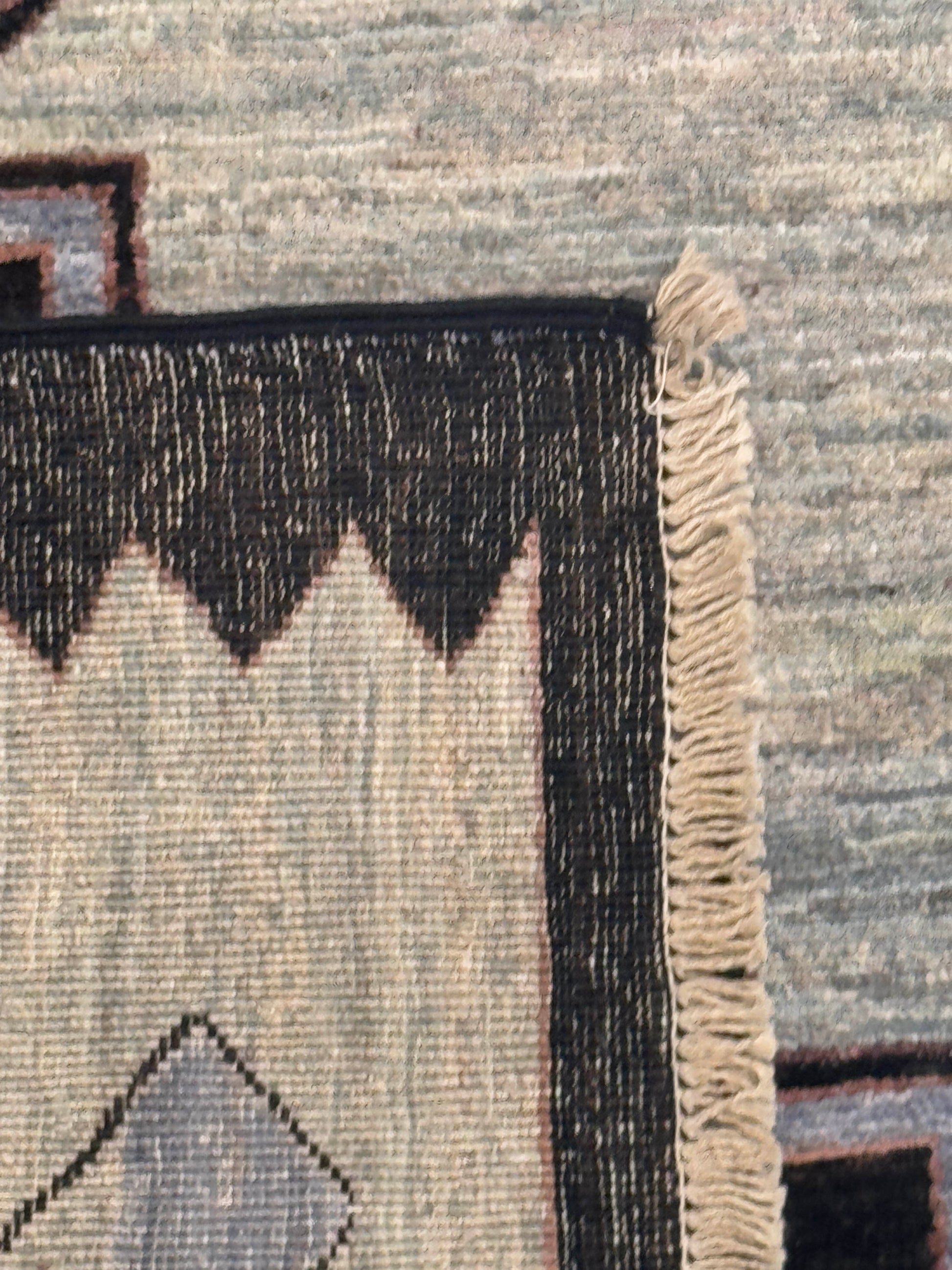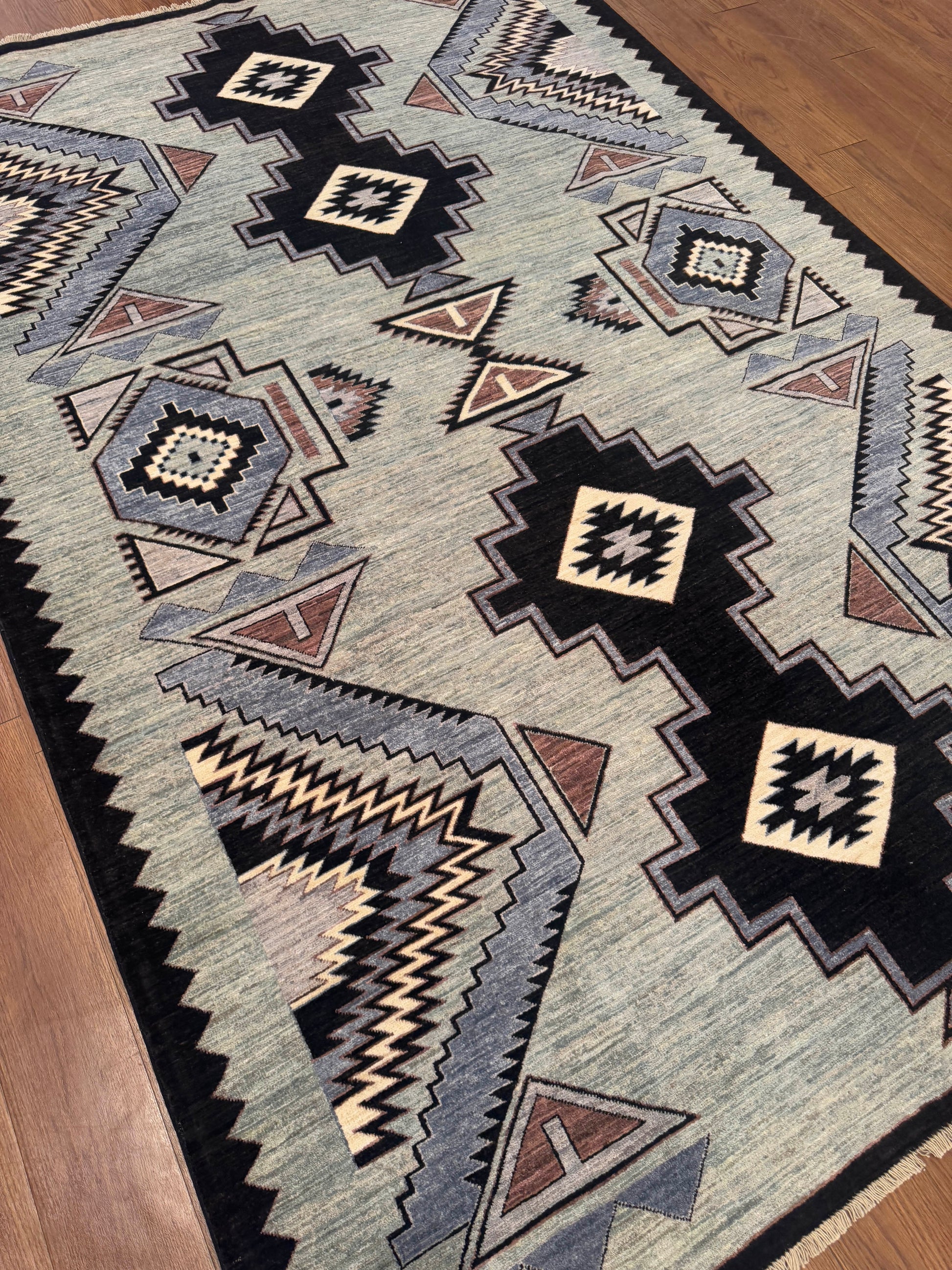 This bold handwoven wool rug highlights a striking Southwestern-inspired design. Large geometric medallions in black and ivory anchor the composition, while muted gray, taupe, and soft blue accents create depth and balance. A dramatic piece that fuses tradition with modern rustic charm.