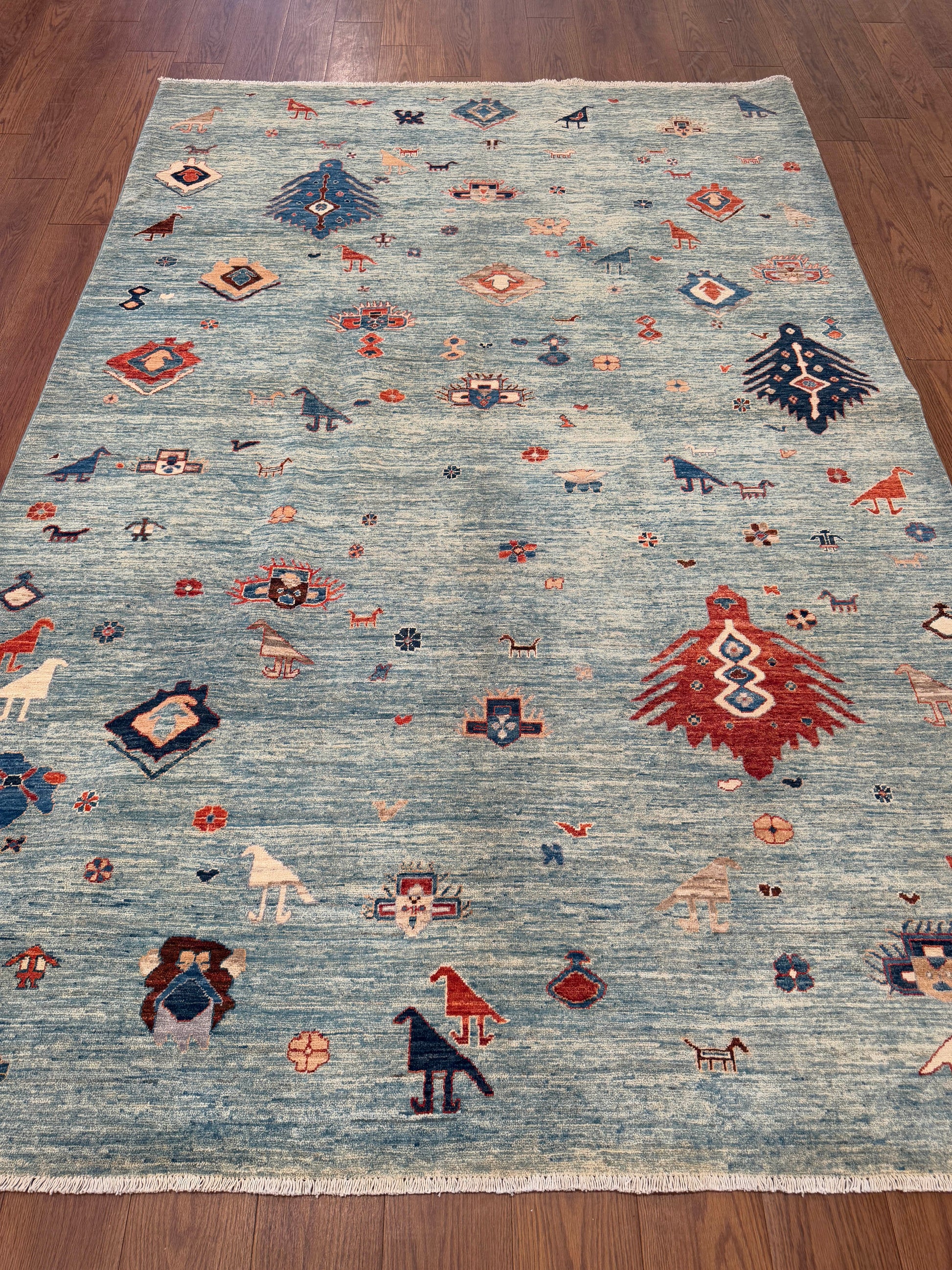 This unique hand-knotted rug features scattered tribal-inspired motifs across a soft blue field, giving it a playful yet timeless appeal. The abstract geometric and symbolic patterns are woven in shades of navy, rust, ivory, and coral, adding depth and character to the design. Its free-form layout and rich colors make it a versatile piece for eclectic, bohemian, or transitional interiors.
