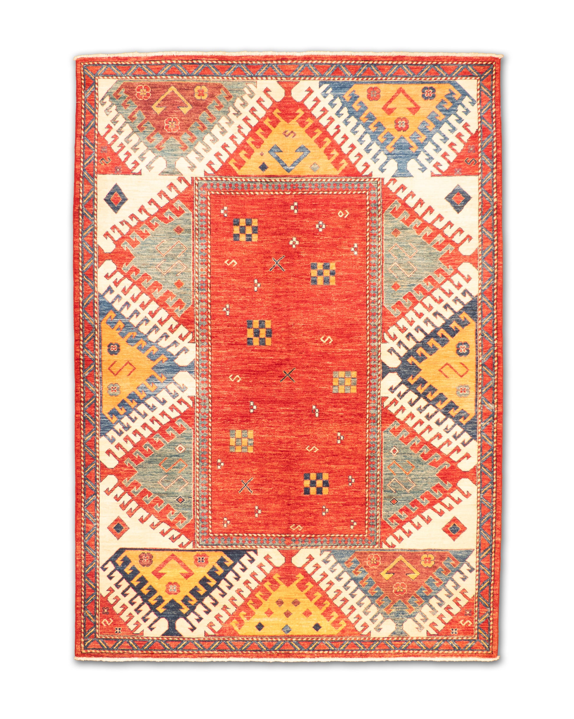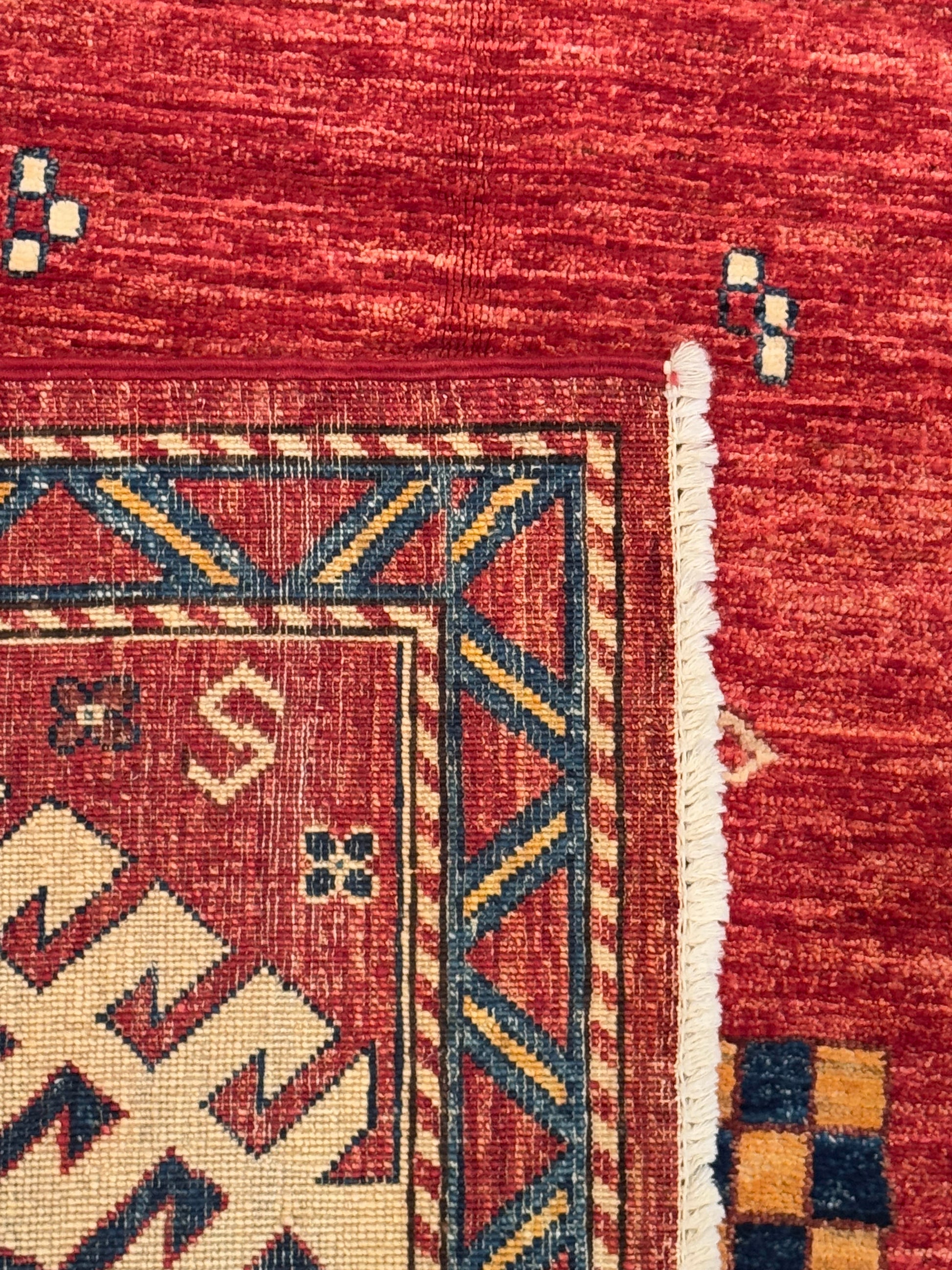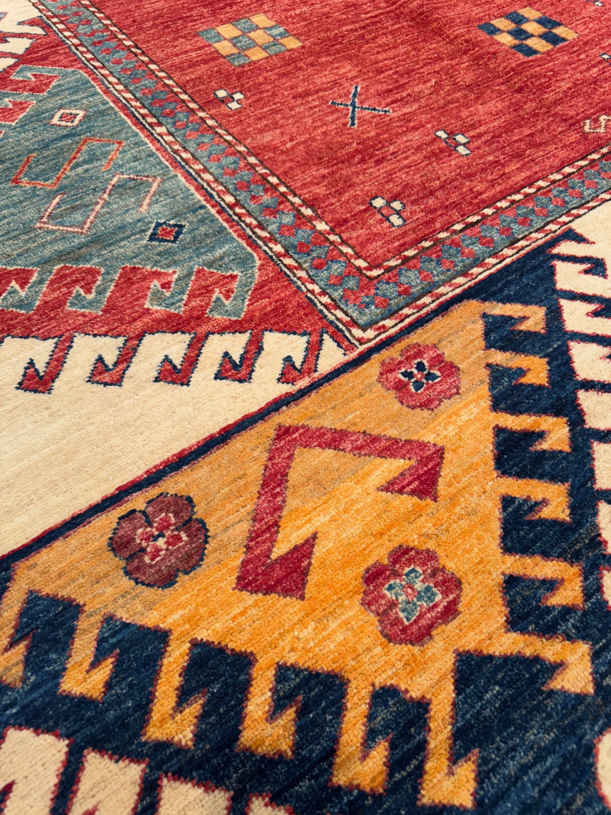 This striking hand-knotted rug features a bold geometric field framed by richly patterned borders. The vibrant palette of crimson red, deep blue, warm gold, ivory, and teal creates a lively and authentic tribal aesthetic. Its crisp angular motifs and checker accents highlight traditional artistry while making it a versatile centerpiece for both eclectic and classic interiors.