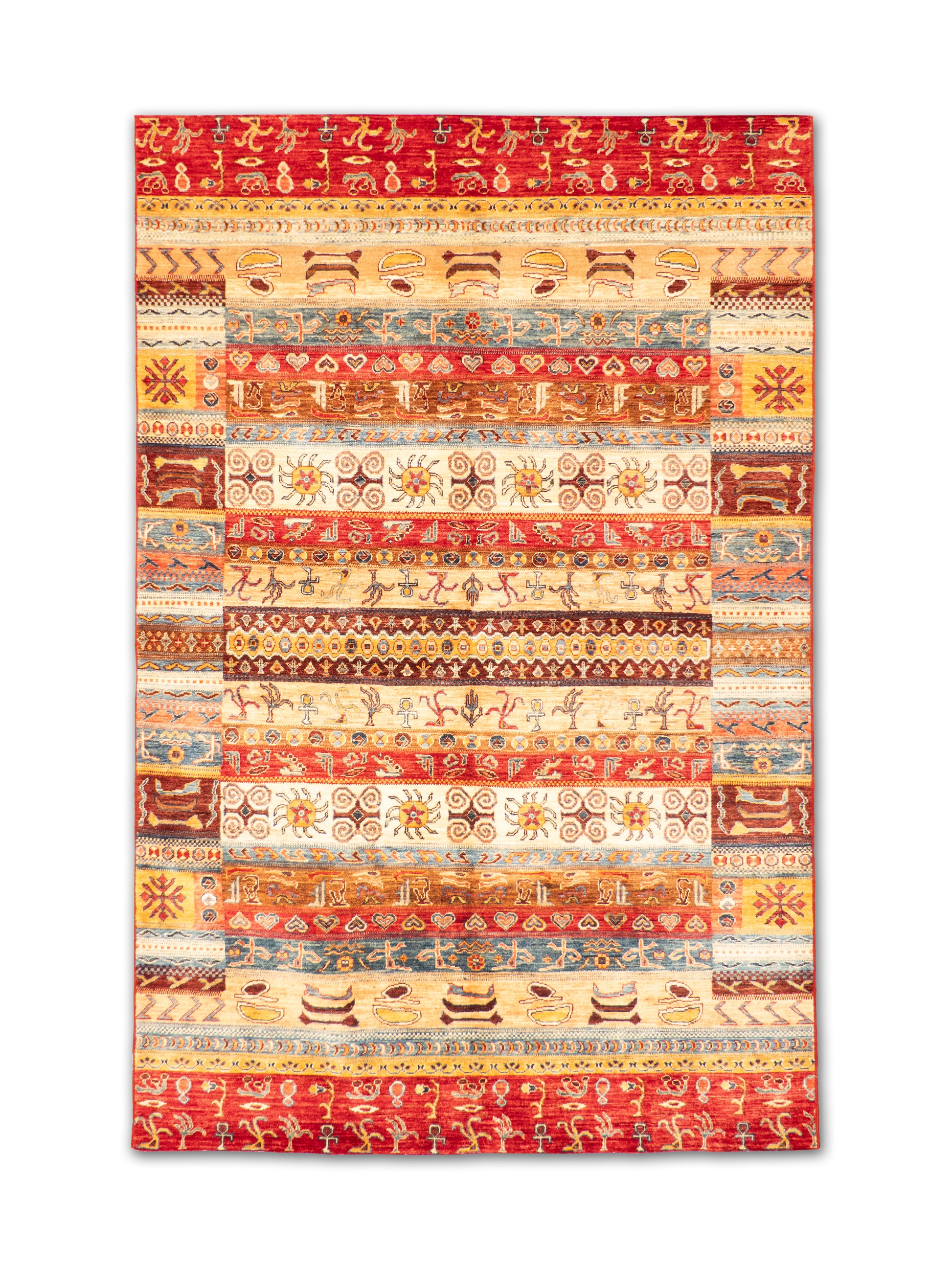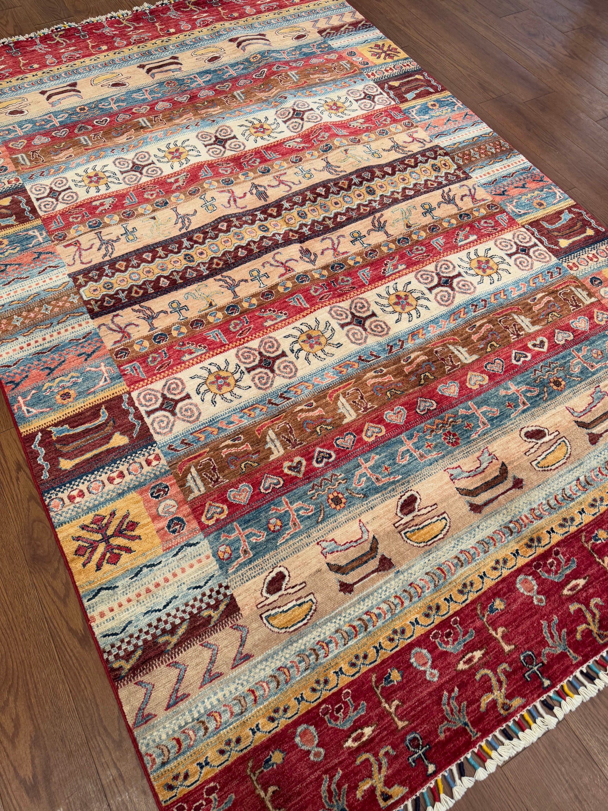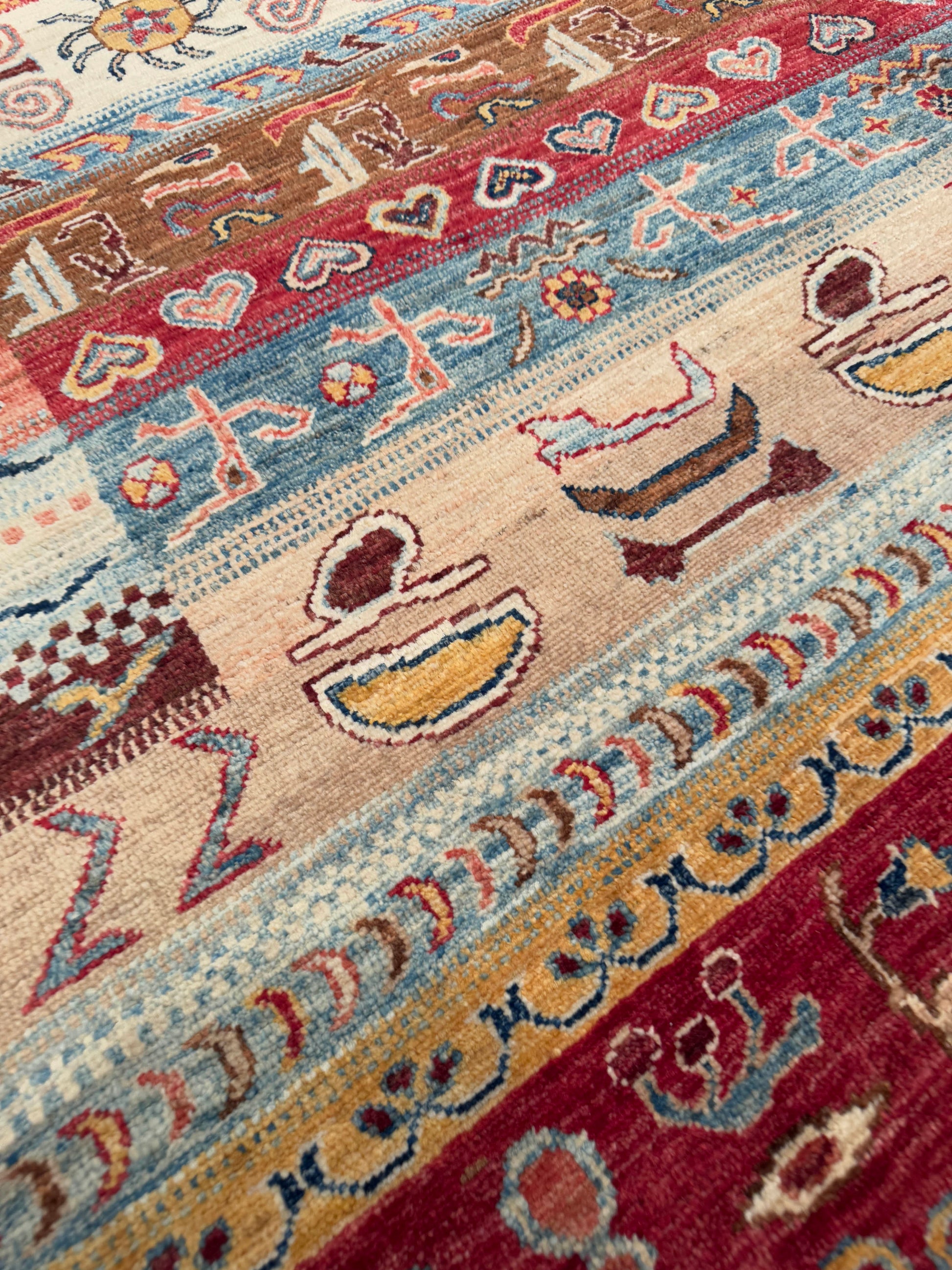 This vibrant hand-knotted rug showcases a series of horizontal bands filled with whimsical and symbolic motifs. Stylized figures, suns, animals, hearts, and abstract patterns create a joyful narrative across the field, all framed by colorful borders. The rich palette of red, ivory, blue, yellow, and earthy tones enhances its playful yet artistic character, making it a unique statement piece for eclectic interiors.