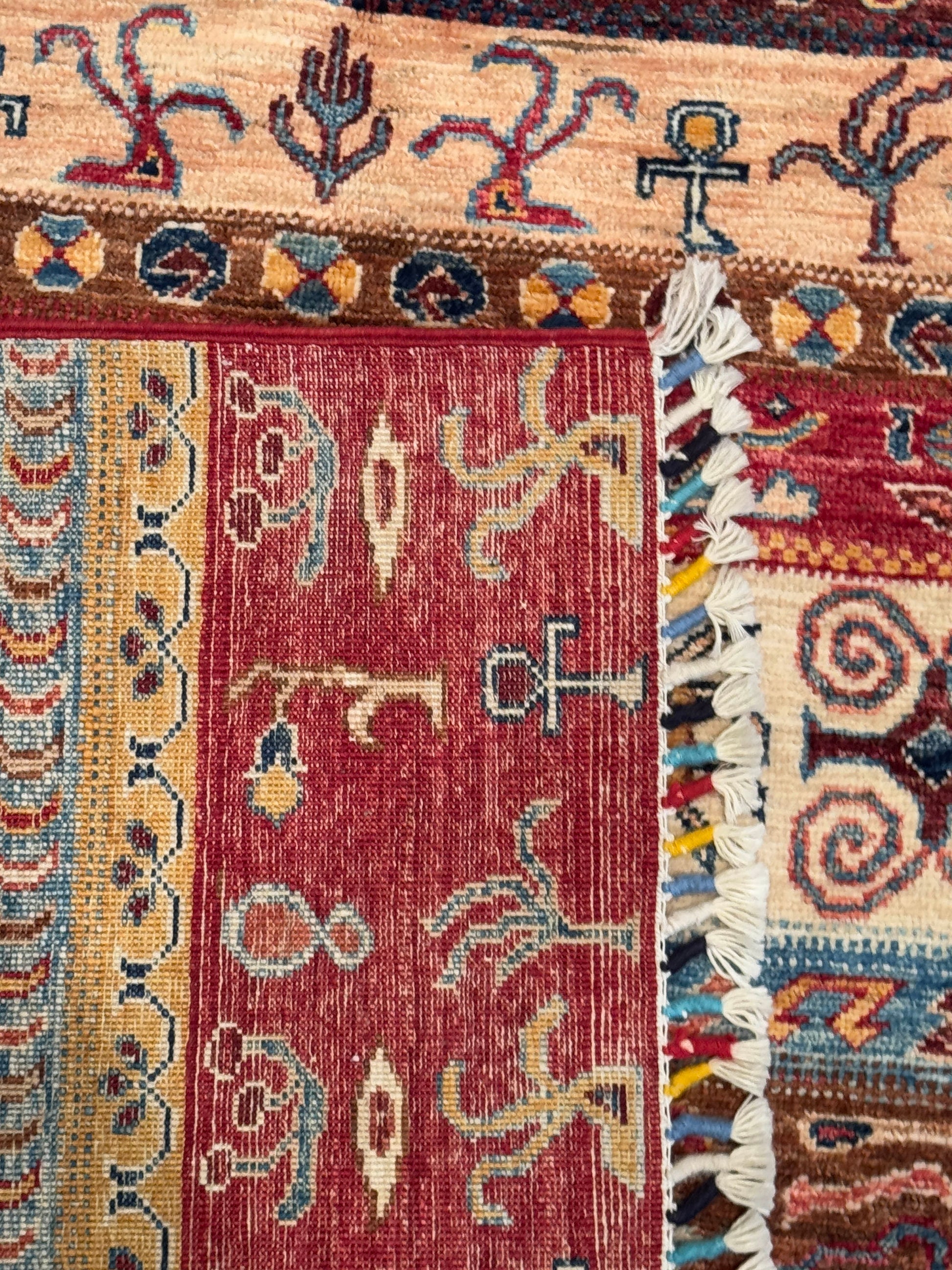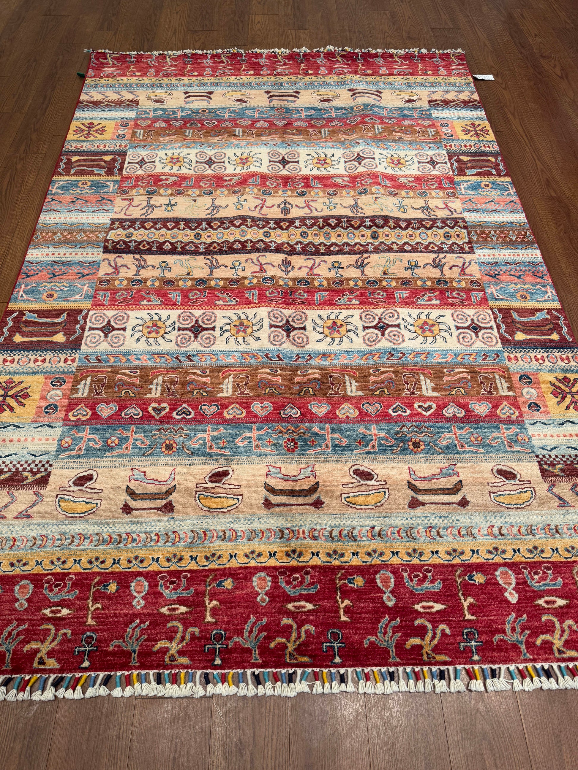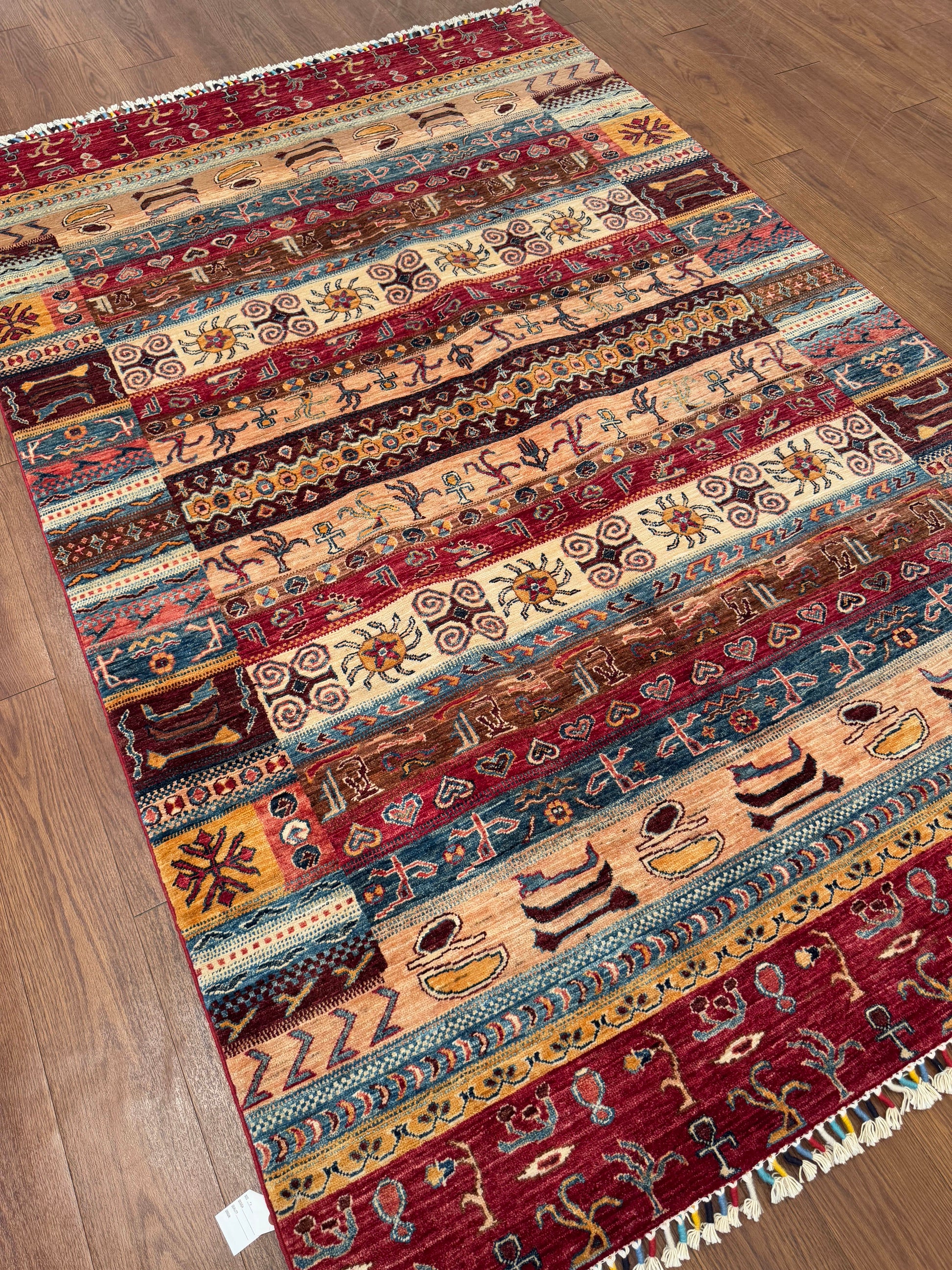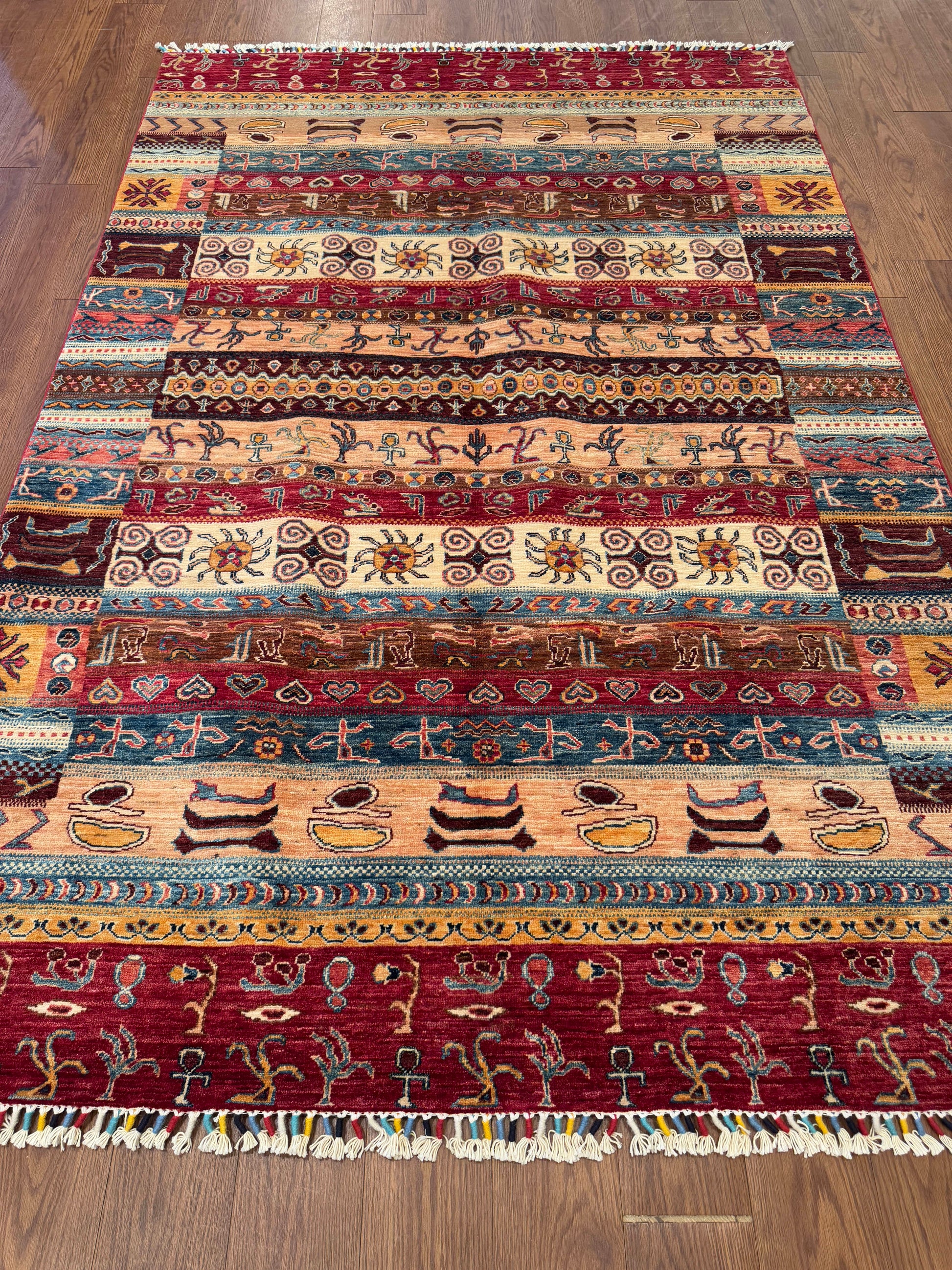 This vibrant hand-knotted rug showcases a series of horizontal bands filled with whimsical and symbolic motifs. Stylized figures, suns, animals, hearts, and abstract patterns create a joyful narrative across the field, all framed by colorful borders. The rich palette of red, ivory, blue, yellow, and earthy tones enhances its playful yet artistic character, making it a unique statement piece for eclectic interiors.
