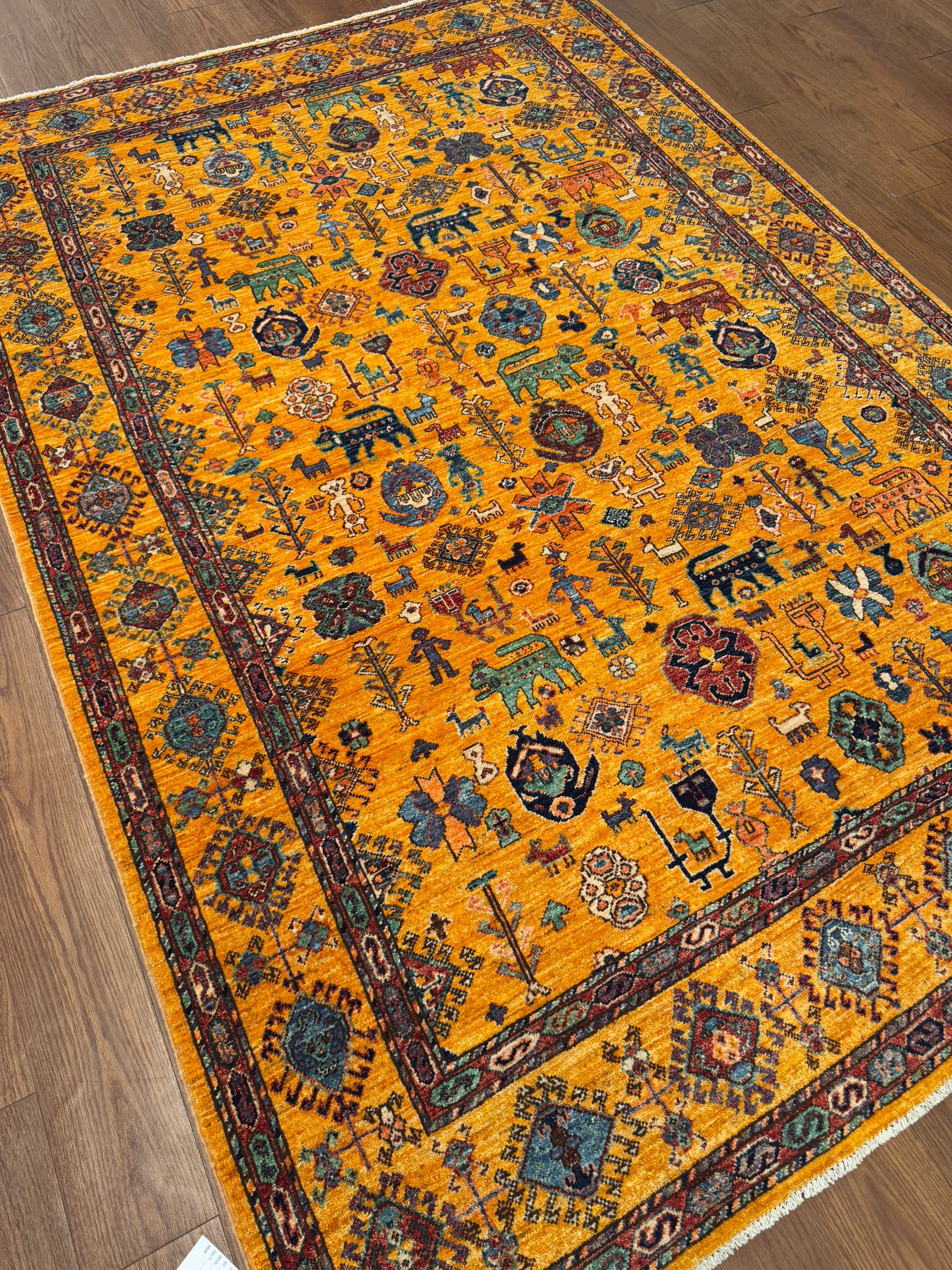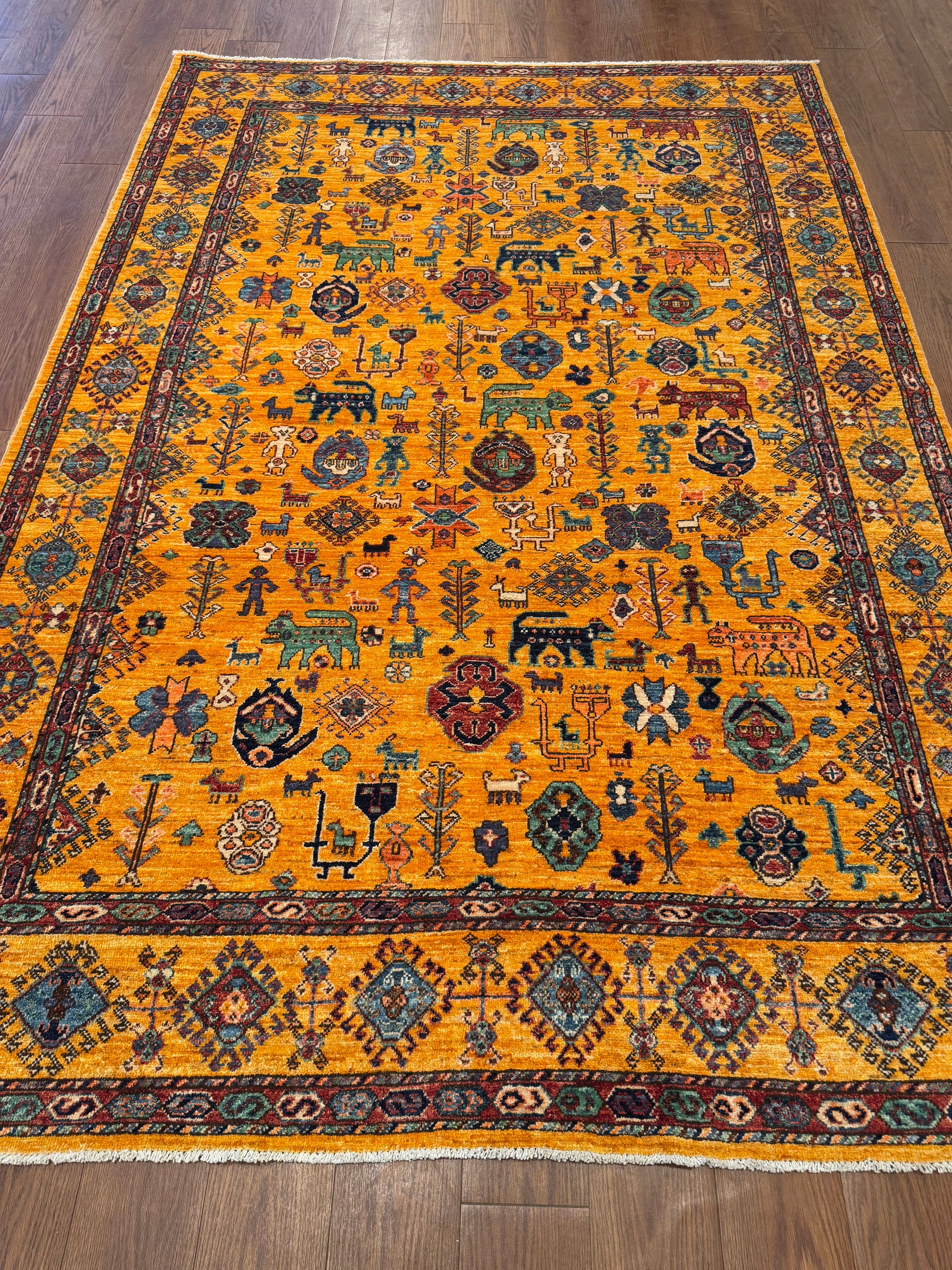 This vibrant hand-knotted rug showcases a bold golden-yellow field filled with whimsical motifs, including geometric medallions, abstract figures, and symbolic elements. Accented with shades of teal, navy, ivory, and rust, the design exudes a lively tribal character. Its playful detailing and energetic palette make it an eye-catching piece for eclectic and contemporary interiors alike.
