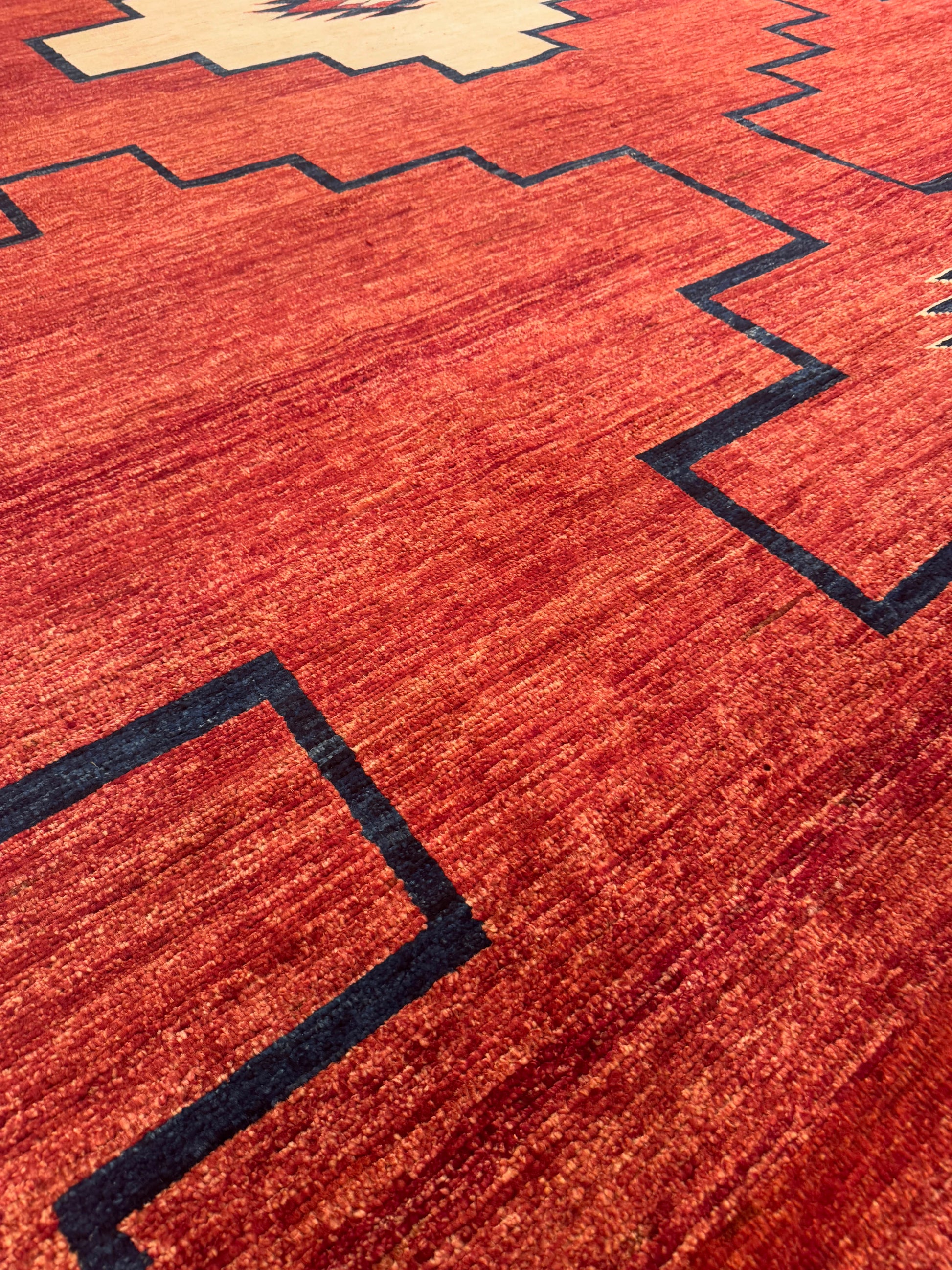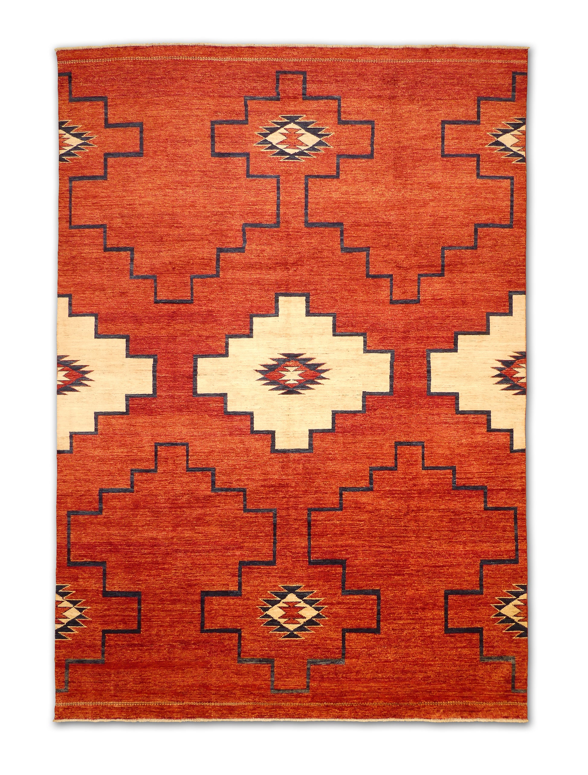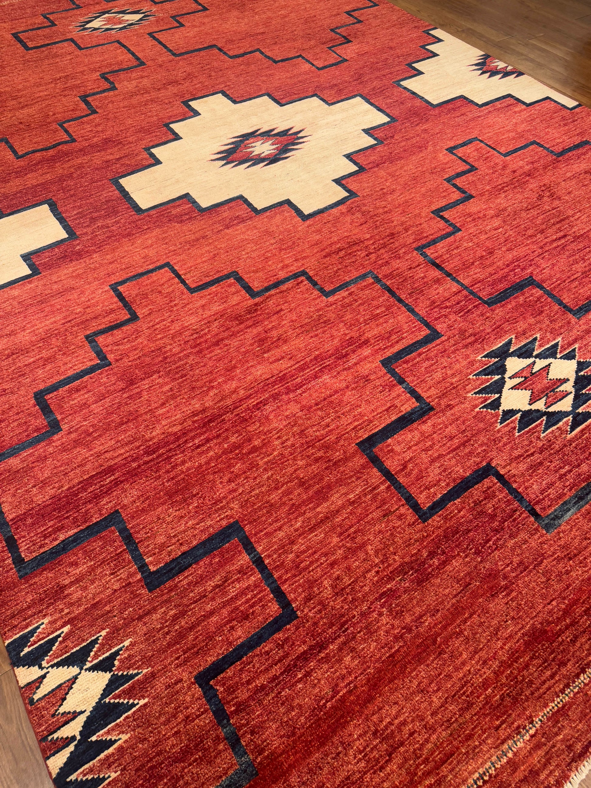 This handwoven rug showcases a bold geometric design with large stepped medallions arranged symmetrically across a deep terracotta-red field. Cream and navy accents highlight the tribal-inspired pattern, giving the piece a refined yet rustic balance. Crafted from fine wool, this rug offers texture, warmth, and timeless piece is perfect for modern or bohemian interiors alike.