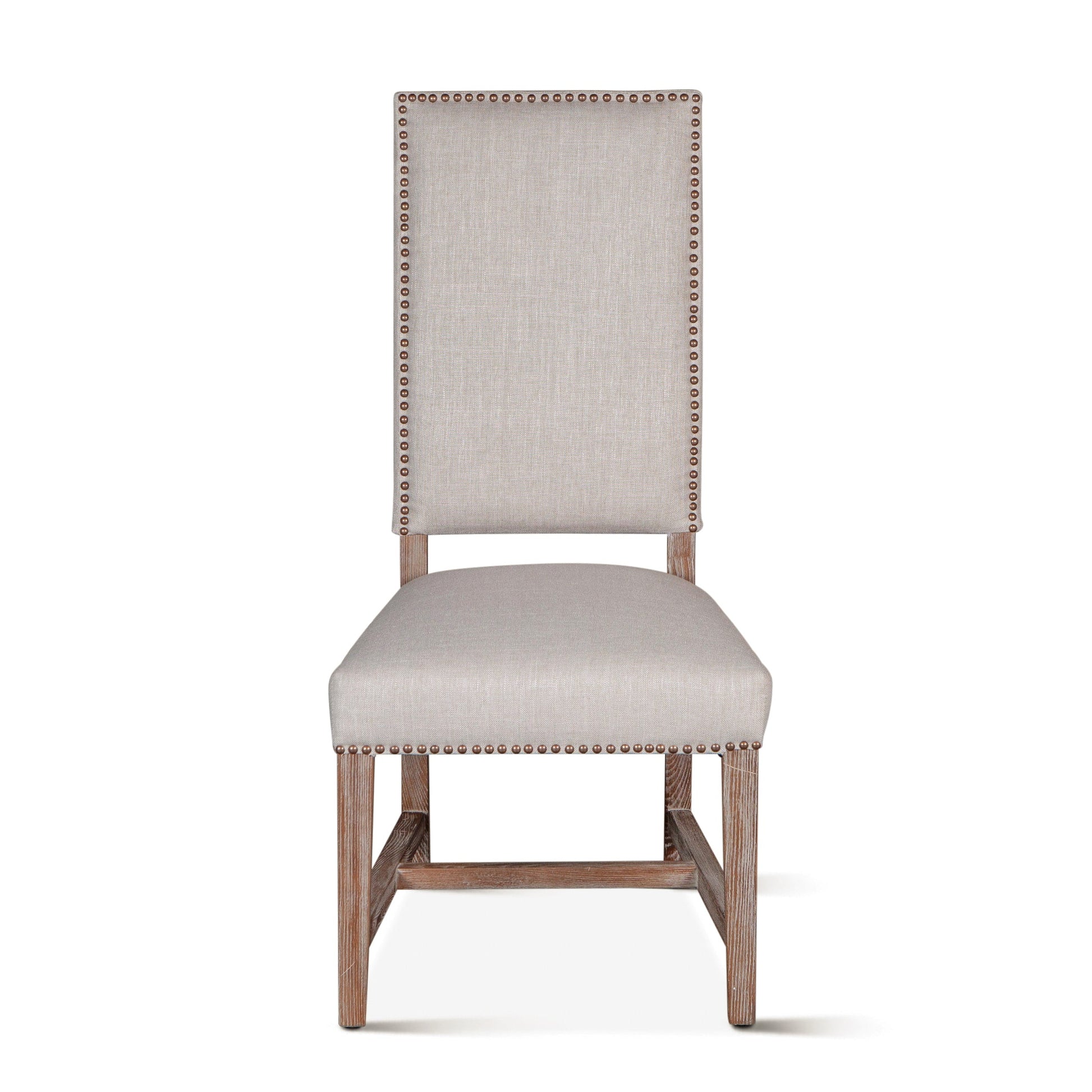 This upholstered dining chair offers a perfect balance of classic form and modern comfort. Wrapped in a soft greige linen-blend fabric, it features a high back accented with antique brass nailhead trim for a touch of sophistication. The solid birch wood legs in a driftwood finish provide natural warmth and contrast, enhancing its timeless aesthetic. Ideal for dining rooms or refined hospitality interiors, it delivers elegance, support, and enduring quality.