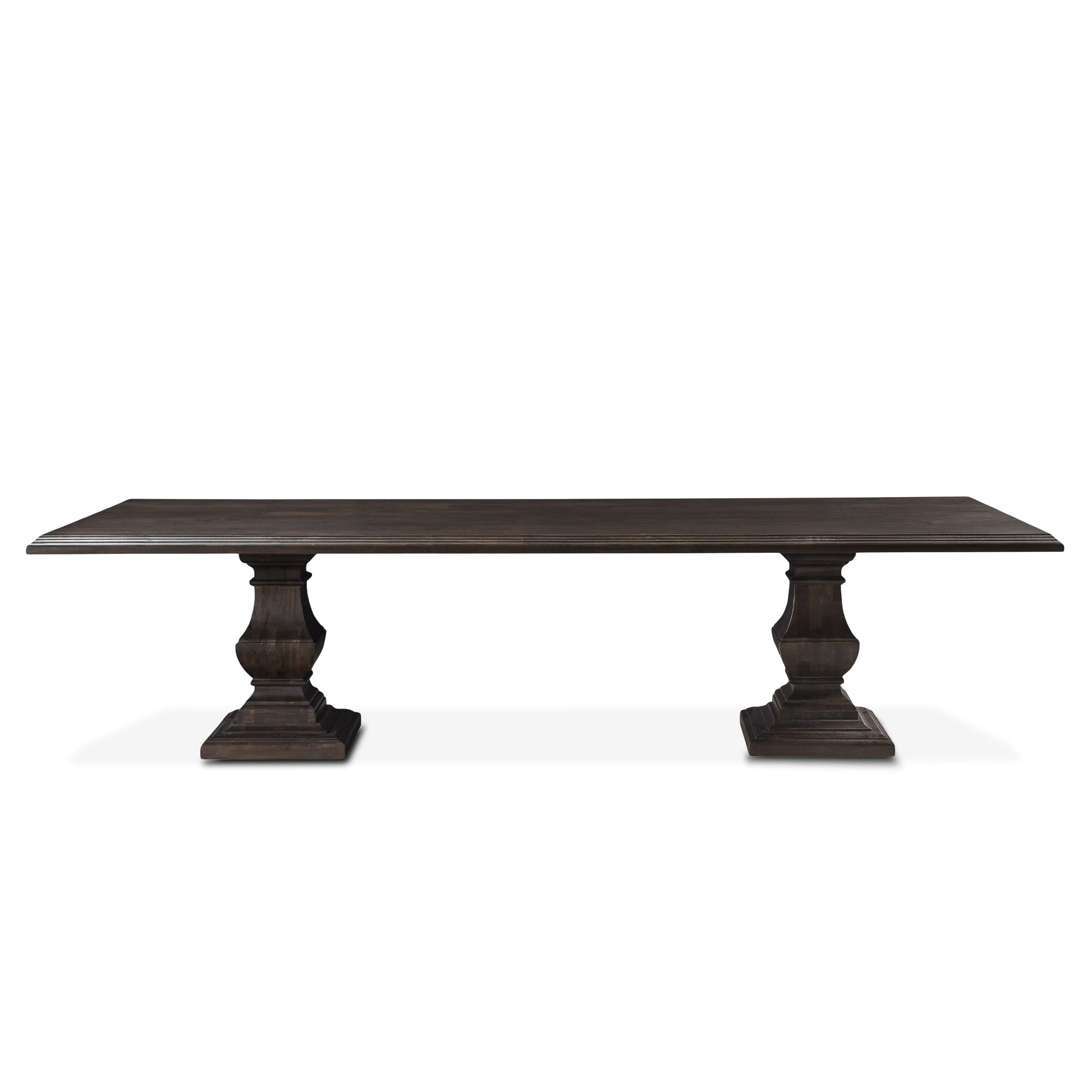 This grand dining table captures timeless craftsmanship through scale, proportion, and intricate detailing. Handcrafted from solid mango wood, it features a rich vintage brown finish that accentuates the natural depth of the grain. The triple-beveled waterfall edge and dual pedestal bases create an architectural silhouette that balances strength with elegance. Designed for expansive dining spaces, it embodies heirloom quality and enduring sophistication, making it a centerpiece for both residential and professional interiors.