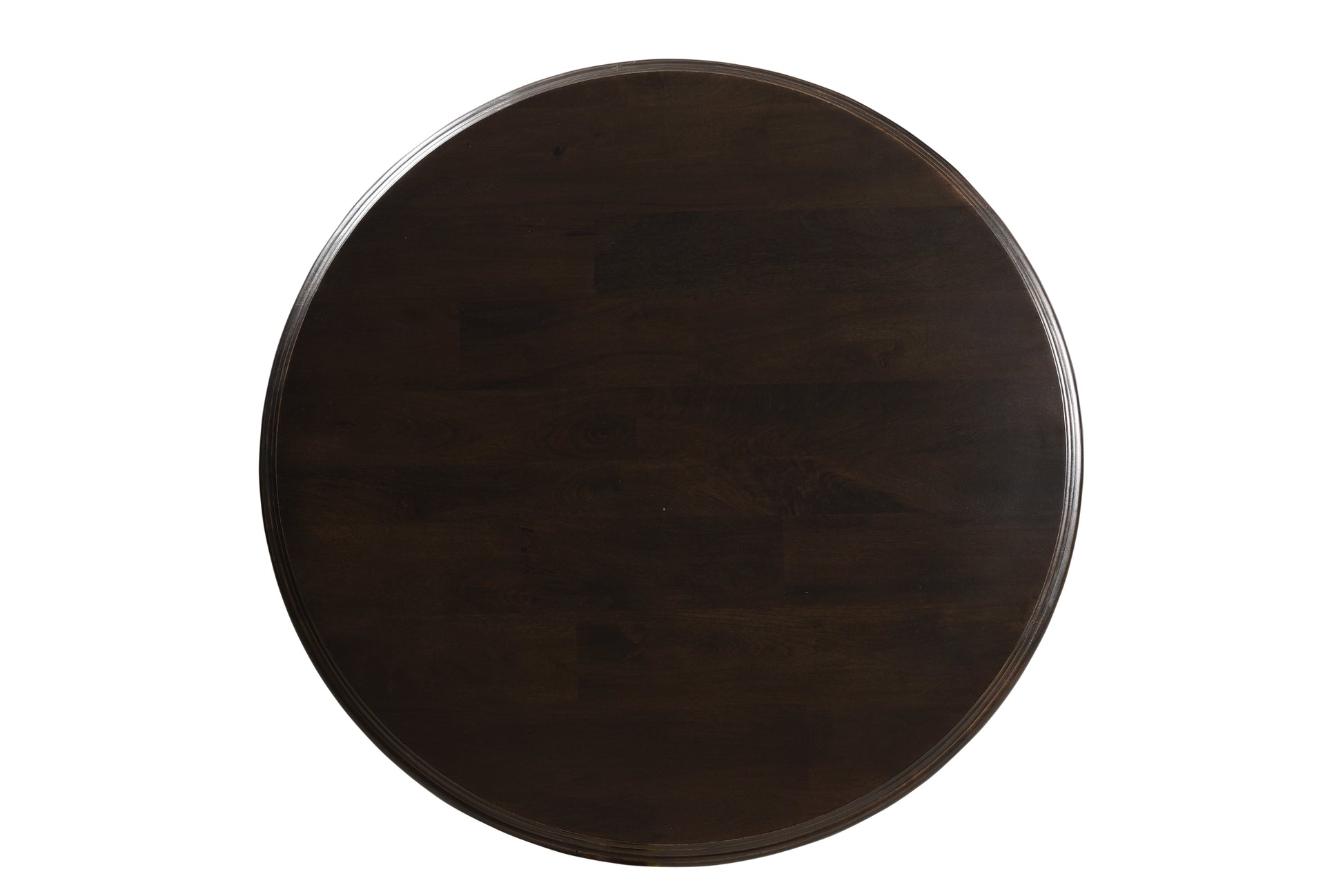 This round dining table embodies timeless craftsmanship and sculptural balance. Made from solid mango wood, it features a triple-beveled edge and a gracefully contoured pedestal base that showcase artisanal precision. The hand-applied vintage brown finish enhances the natural grain and depth of the wood, adding warmth and richness to any interior. Compact yet substantial, it serves as an elegant focal point for intimate dining spaces or refined hospitality settings.