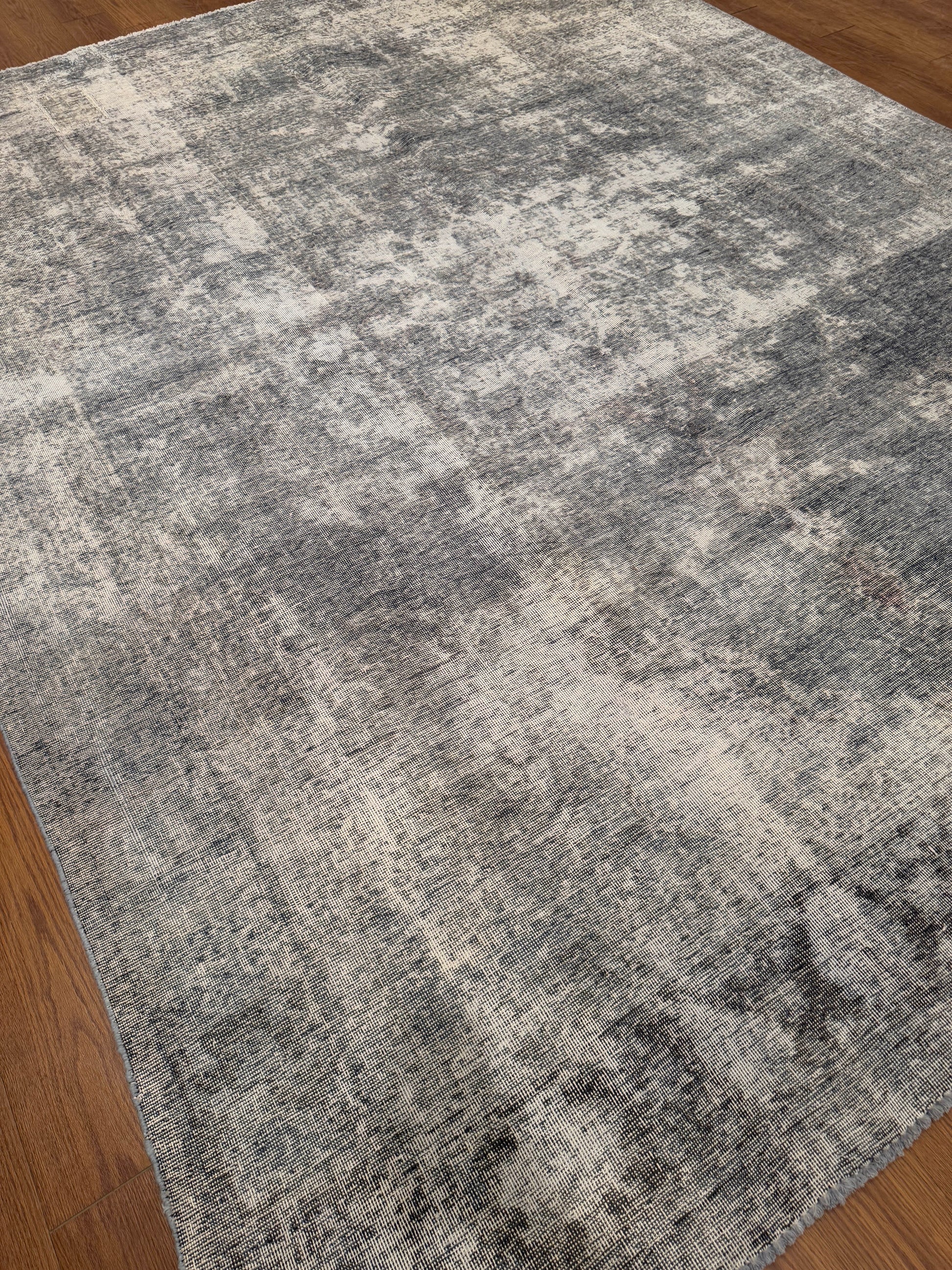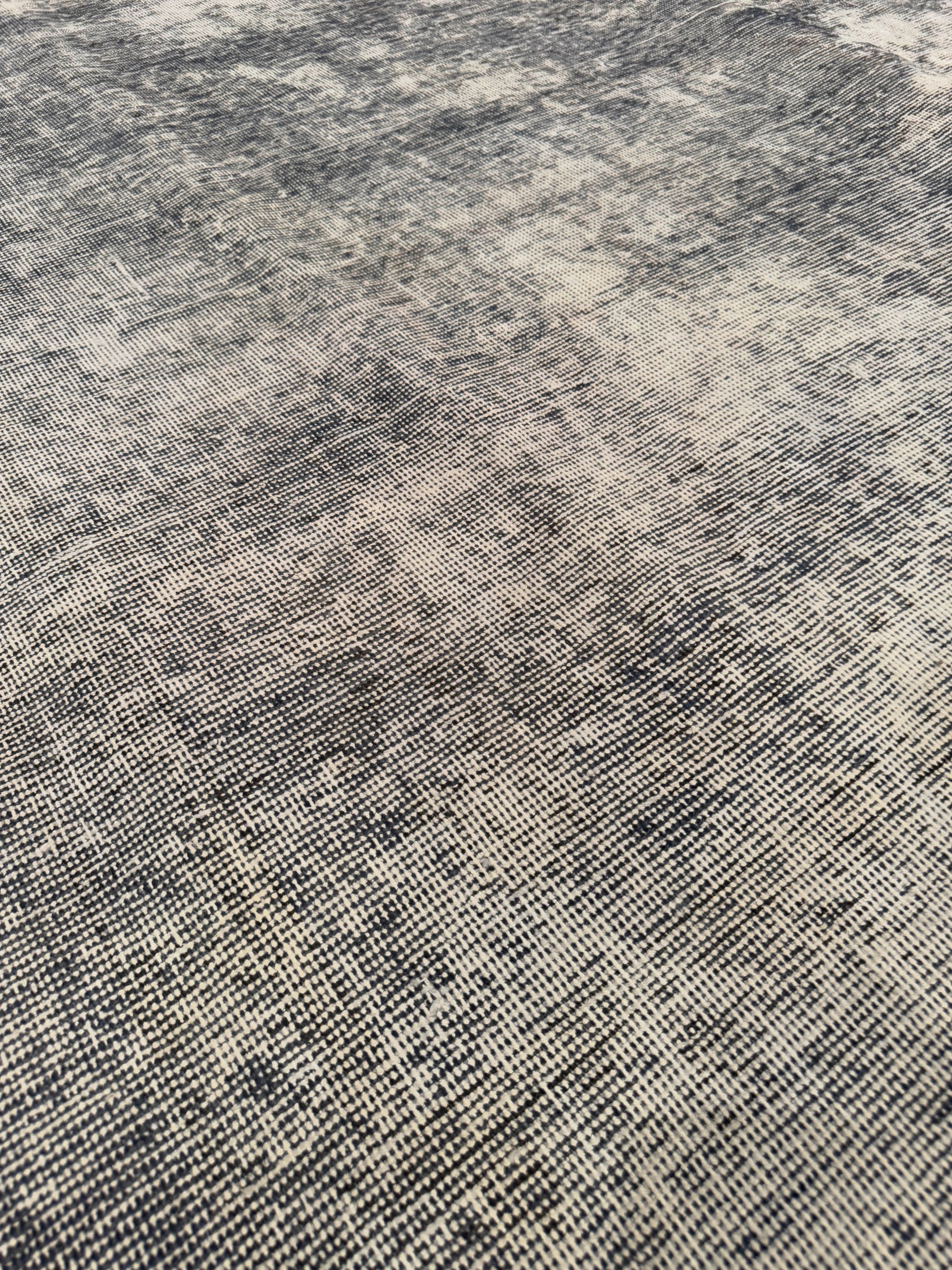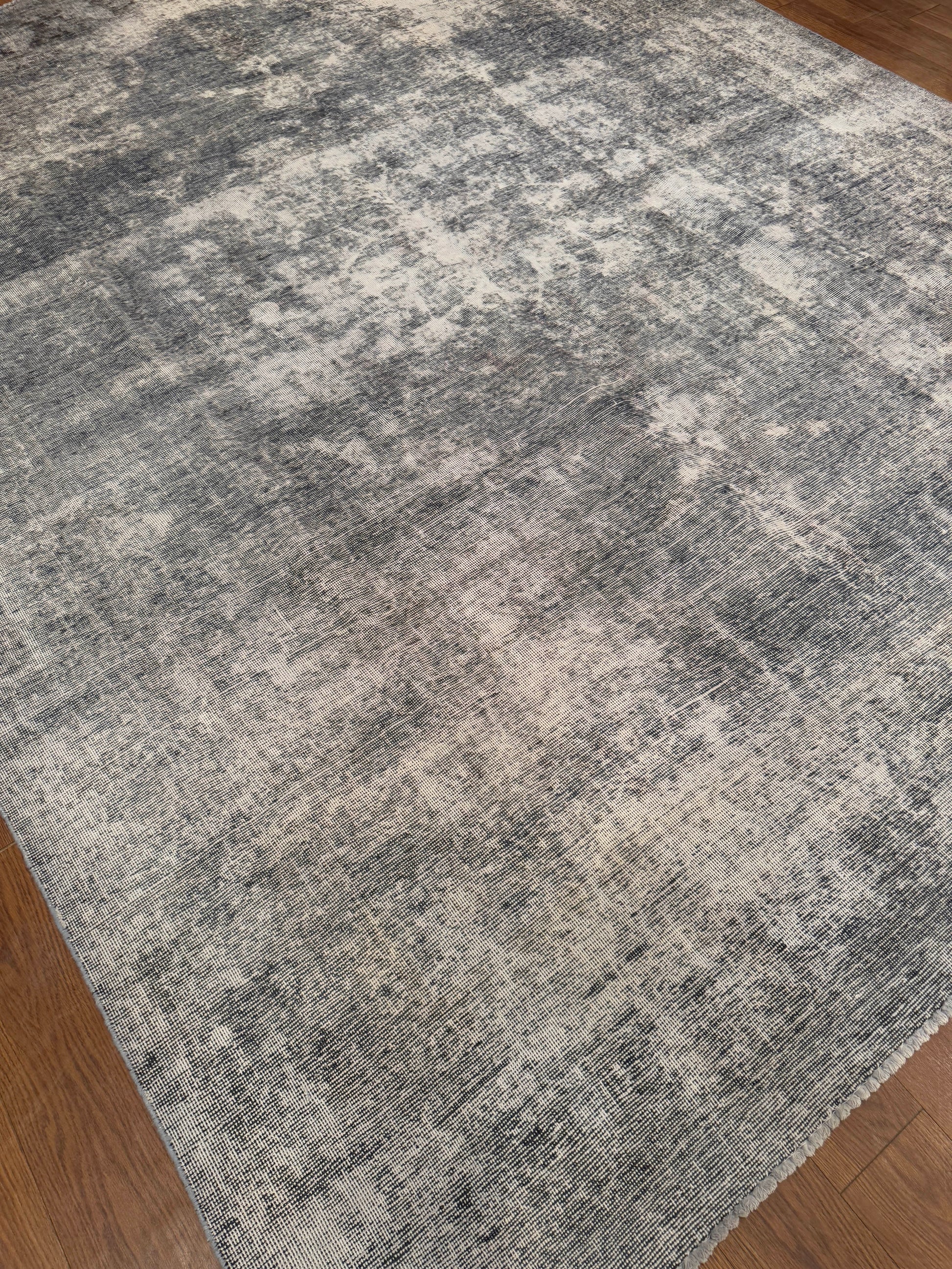 This handmade rug features a beautifully timeworn abstract design with a soft interplay of charcoal, gray, and ivory tones. Its distressed finish creates a vintage, weathered aesthetic that feels both refined and effortlessly modern. The minimalist palette allows it to blend seamlessly into contemporary, transitional, or industrial interiors while maintaining an artisanal touch.