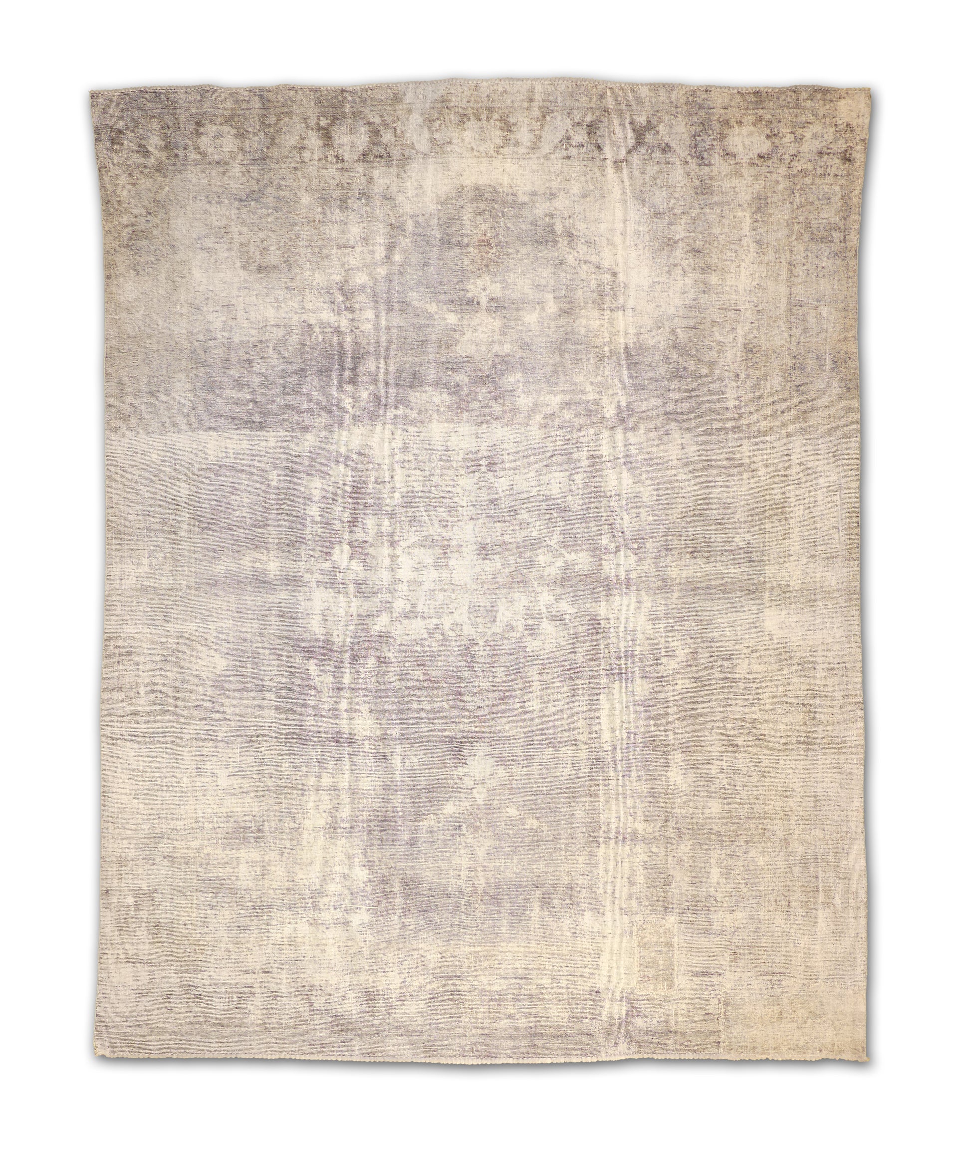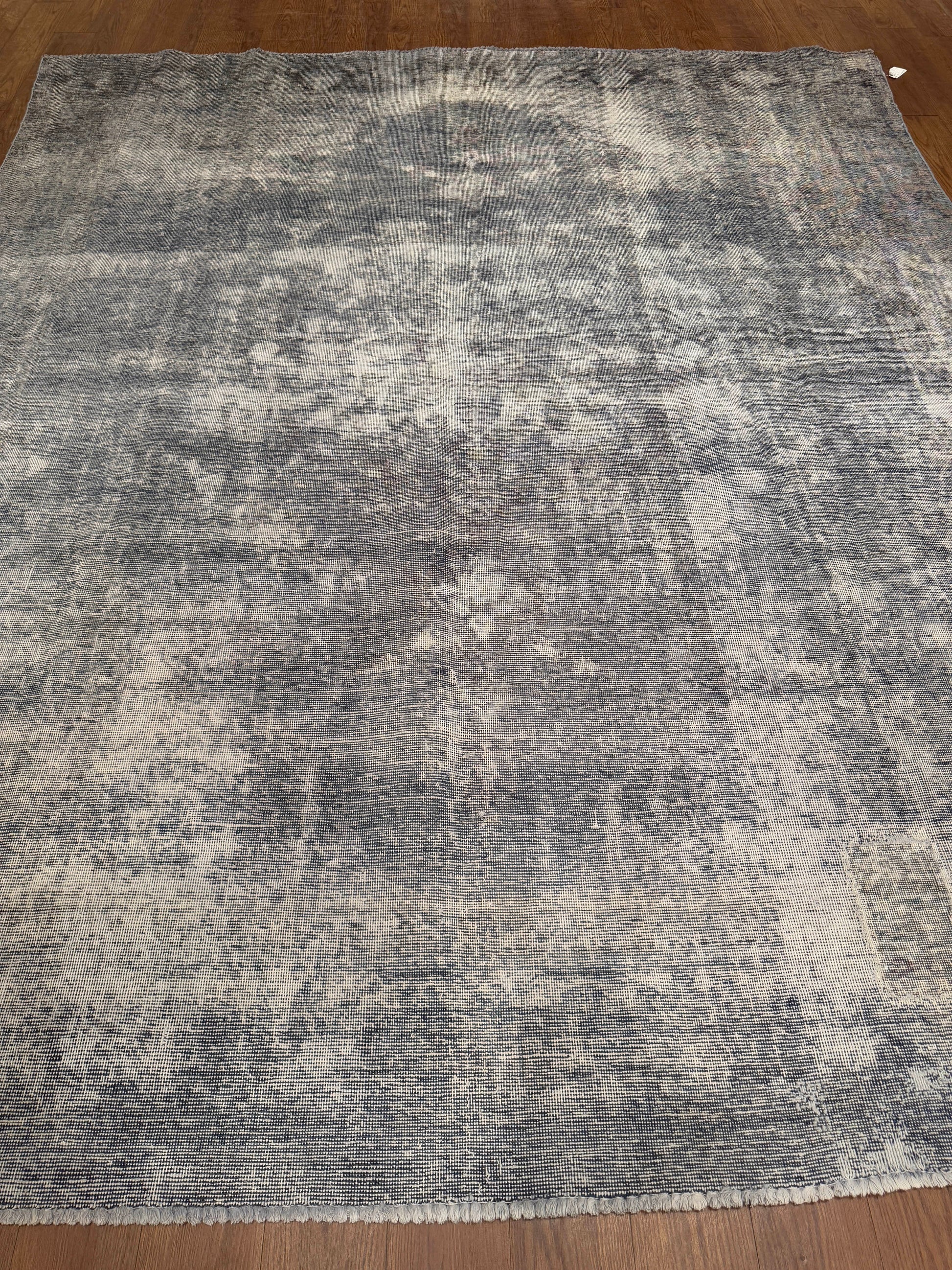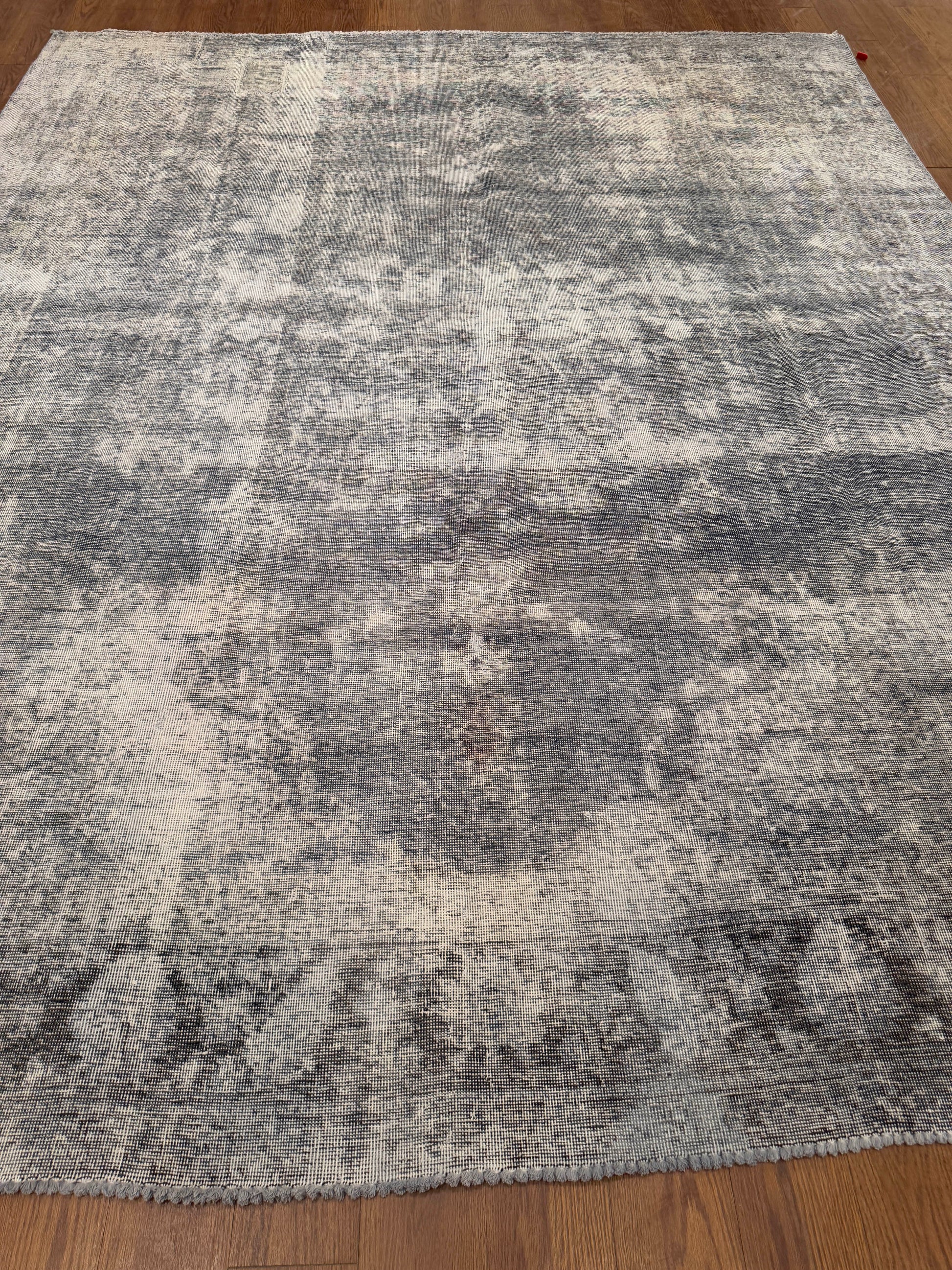 This handmade rug features a beautifully timeworn abstract design with a soft interplay of charcoal, gray, and ivory tones. Its distressed finish creates a vintage, weathered aesthetic that feels both refined and effortlessly modern. The minimalist palette allows it to blend seamlessly into contemporary, transitional, or industrial interiors while maintaining an artisanal touch.