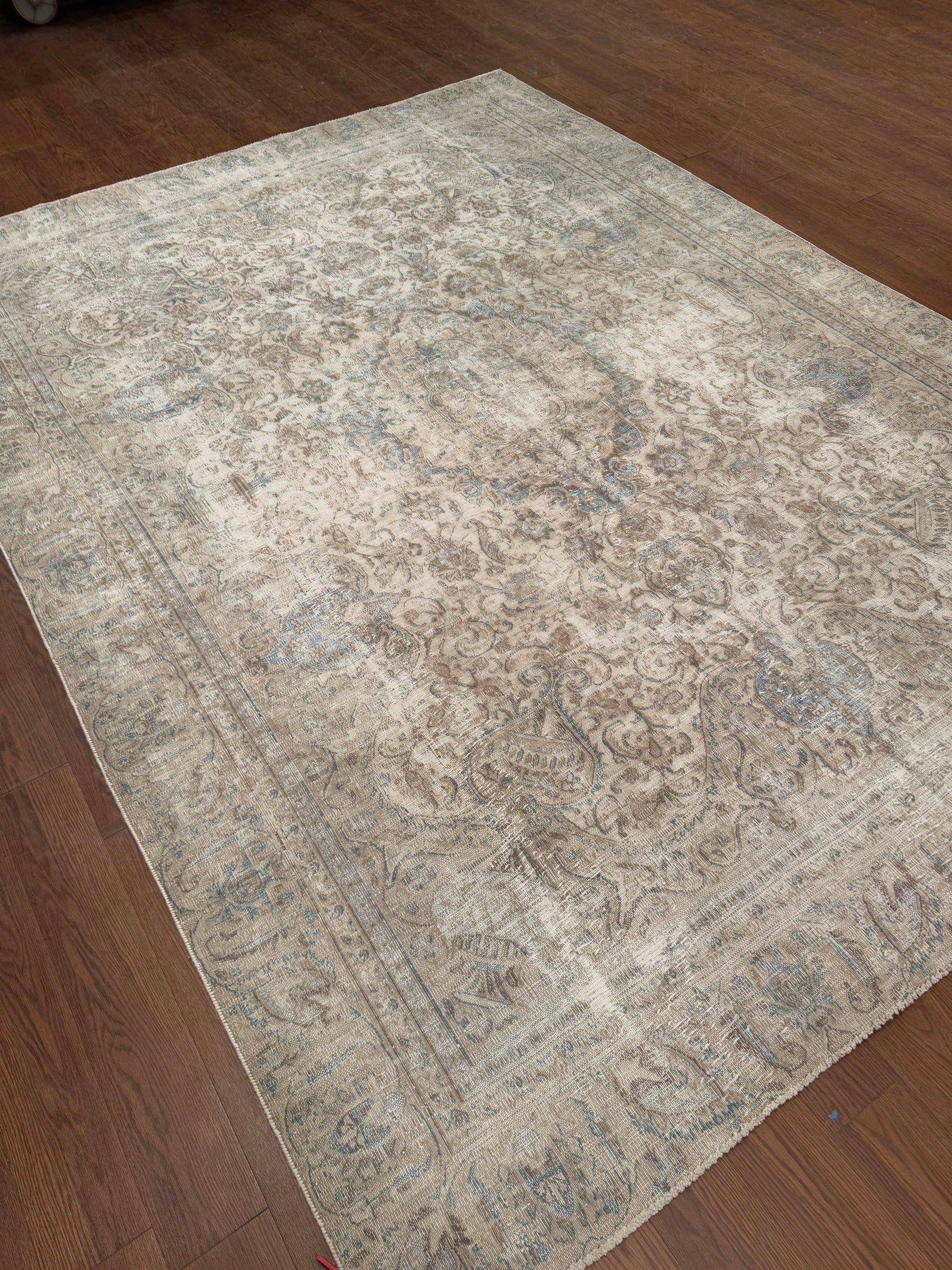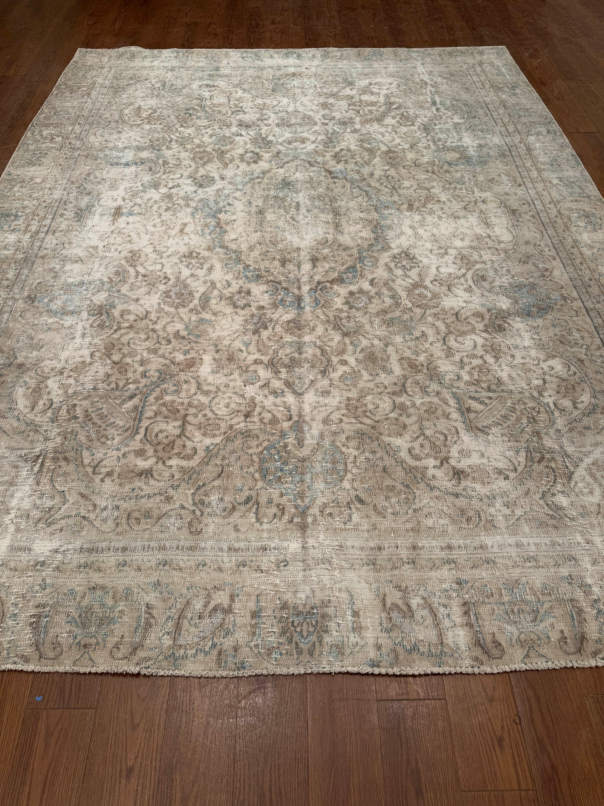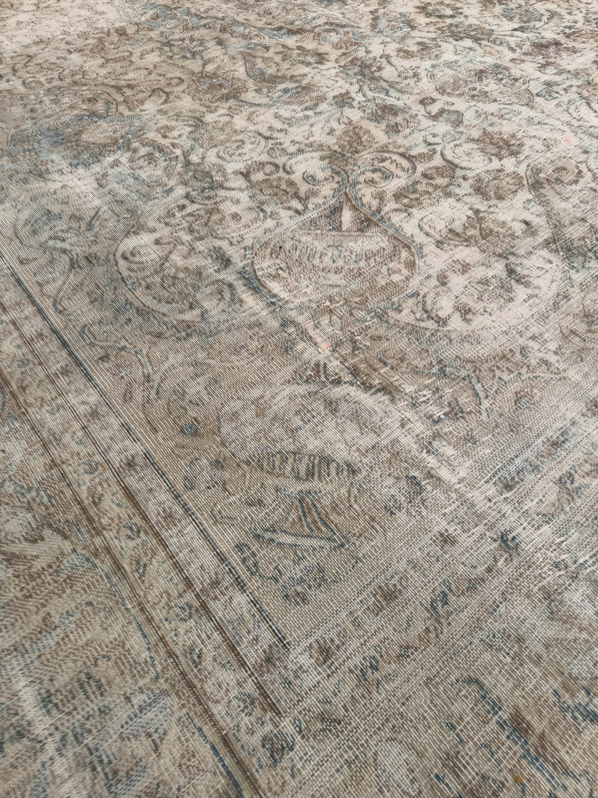 This handmade rug features a graceful allover medallion design with intricate floral detailing and soft, time-faded elegance. The palette of beige, taupe, and misty blue lends a serene sophistication, while the distressed finish enhances its antique-inspired character. Its gentle tones and refined texture make it a perfect foundation for elegant, calming interiors.