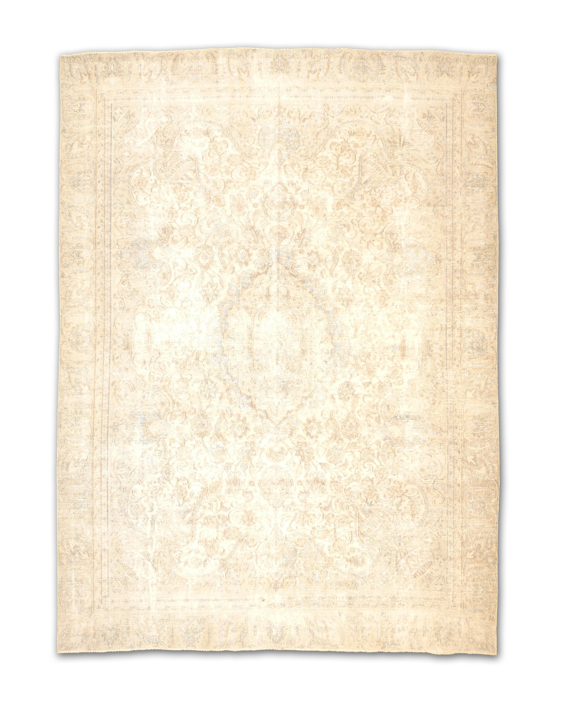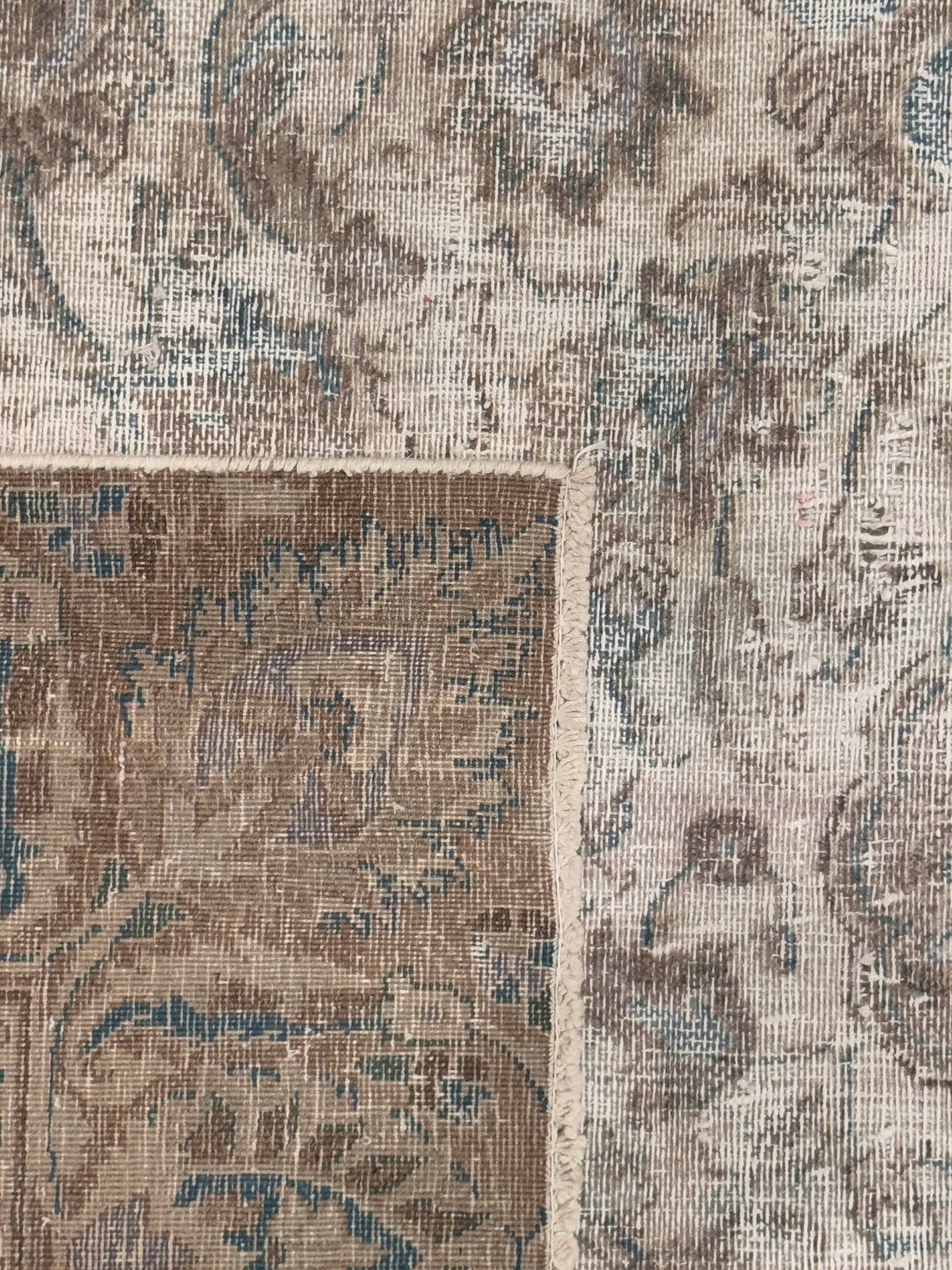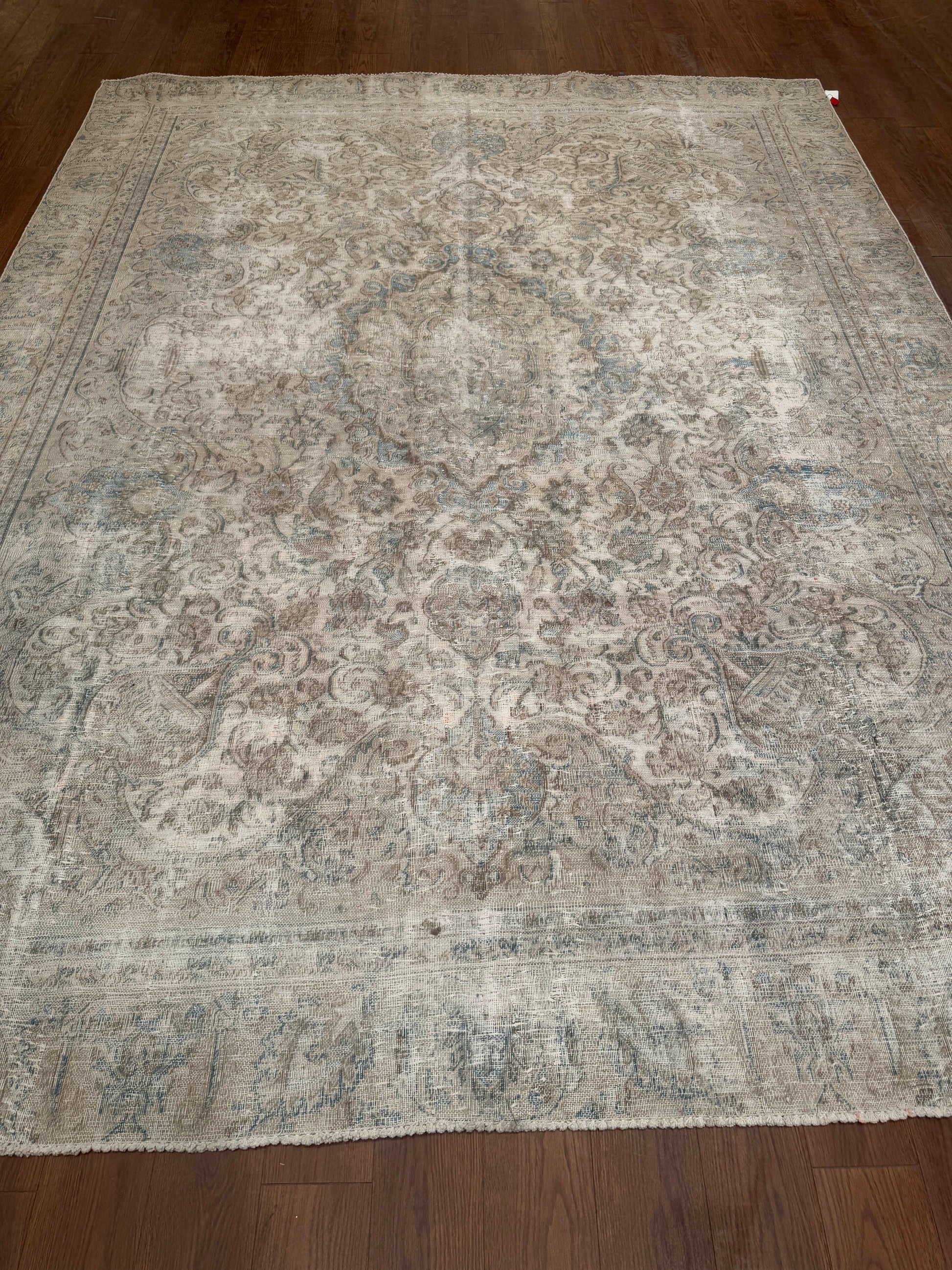 This handmade rug features a graceful allover medallion design with intricate floral detailing and soft, time-faded elegance. The palette of beige, taupe, and misty blue lends a serene sophistication, while the distressed finish enhances its antique-inspired character. Its gentle tones and refined texture make it a perfect foundation for elegant, calming interiors.