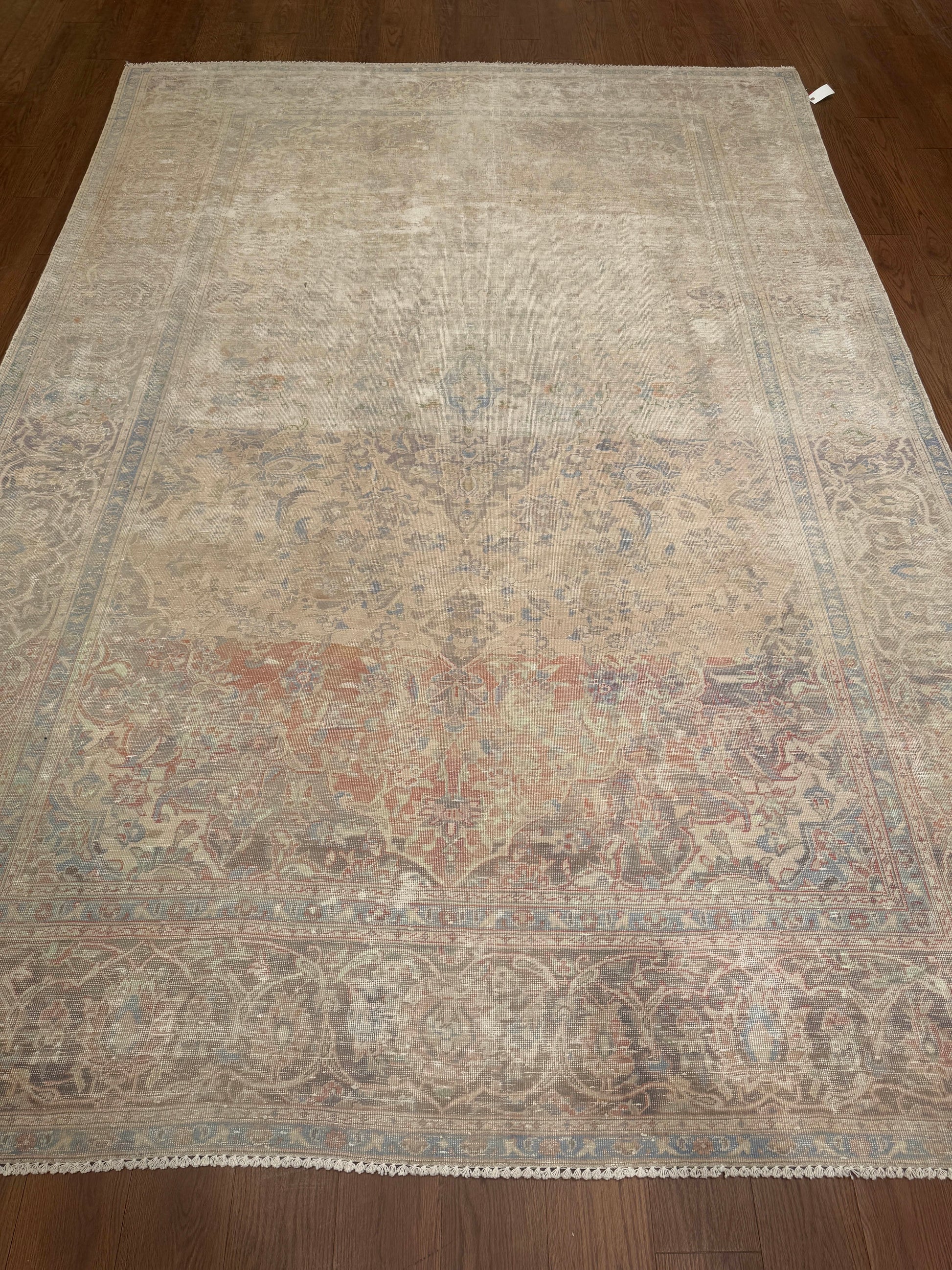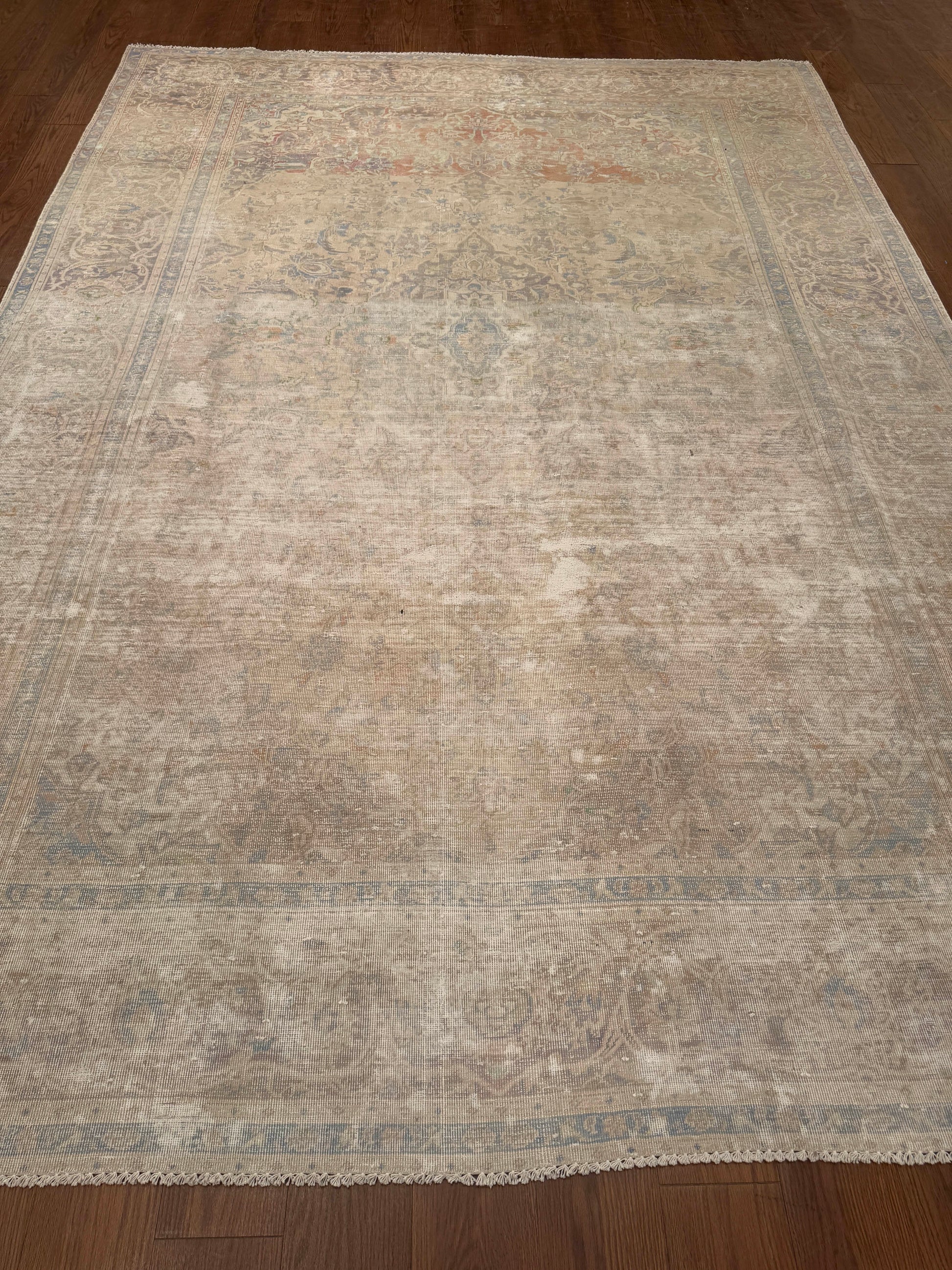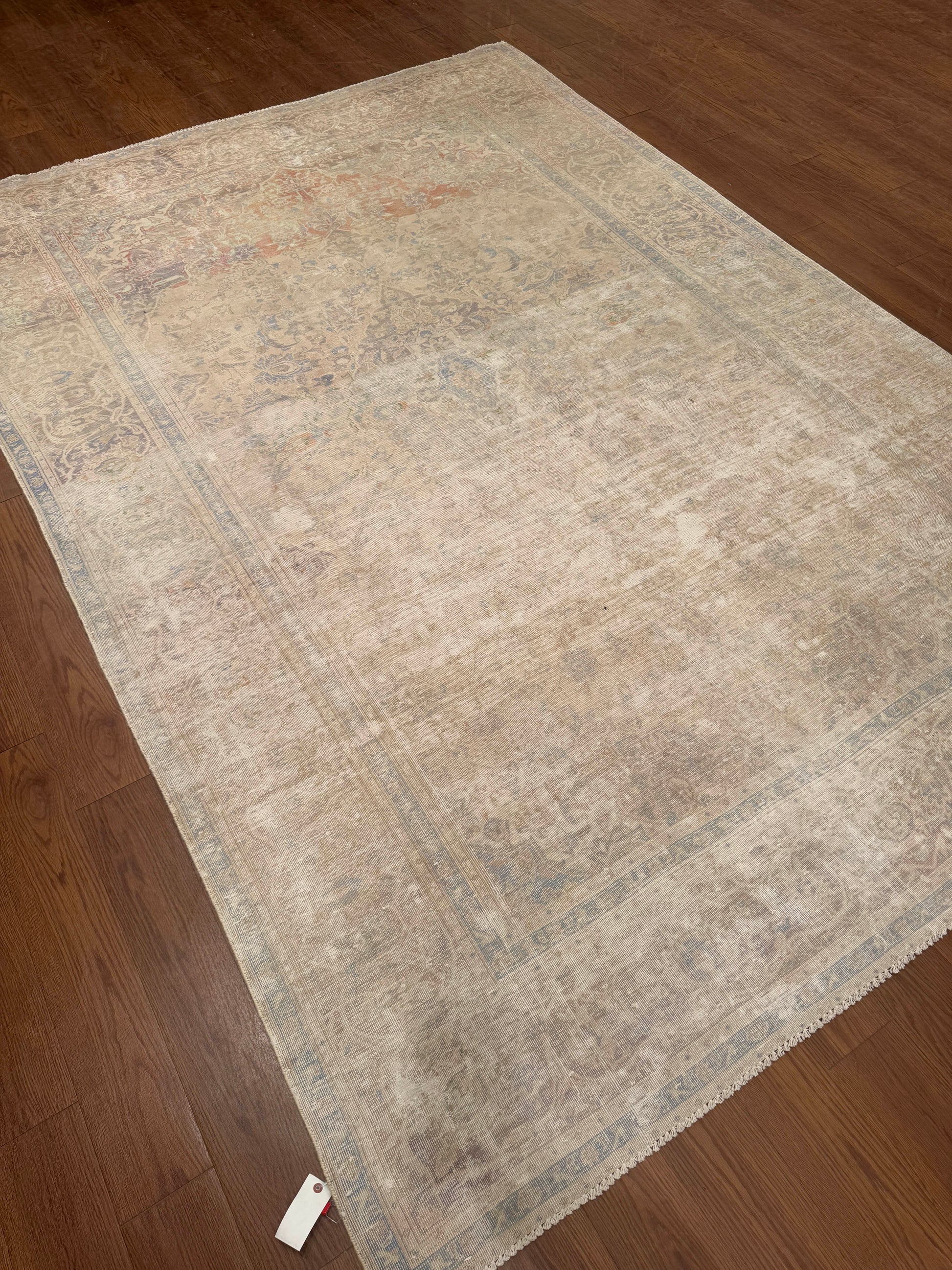 This handmade rug showcases a beautifully aged medallion design with softly blurred floral patterns and gentle abrash variations. Muted shades of beige, peach, slate blue, and taupe give it a refined, antique aesthetic with a calm and inviting presence. The distressed patina enhances its character, making it ideal for interiors that balance sophistication and comfort.