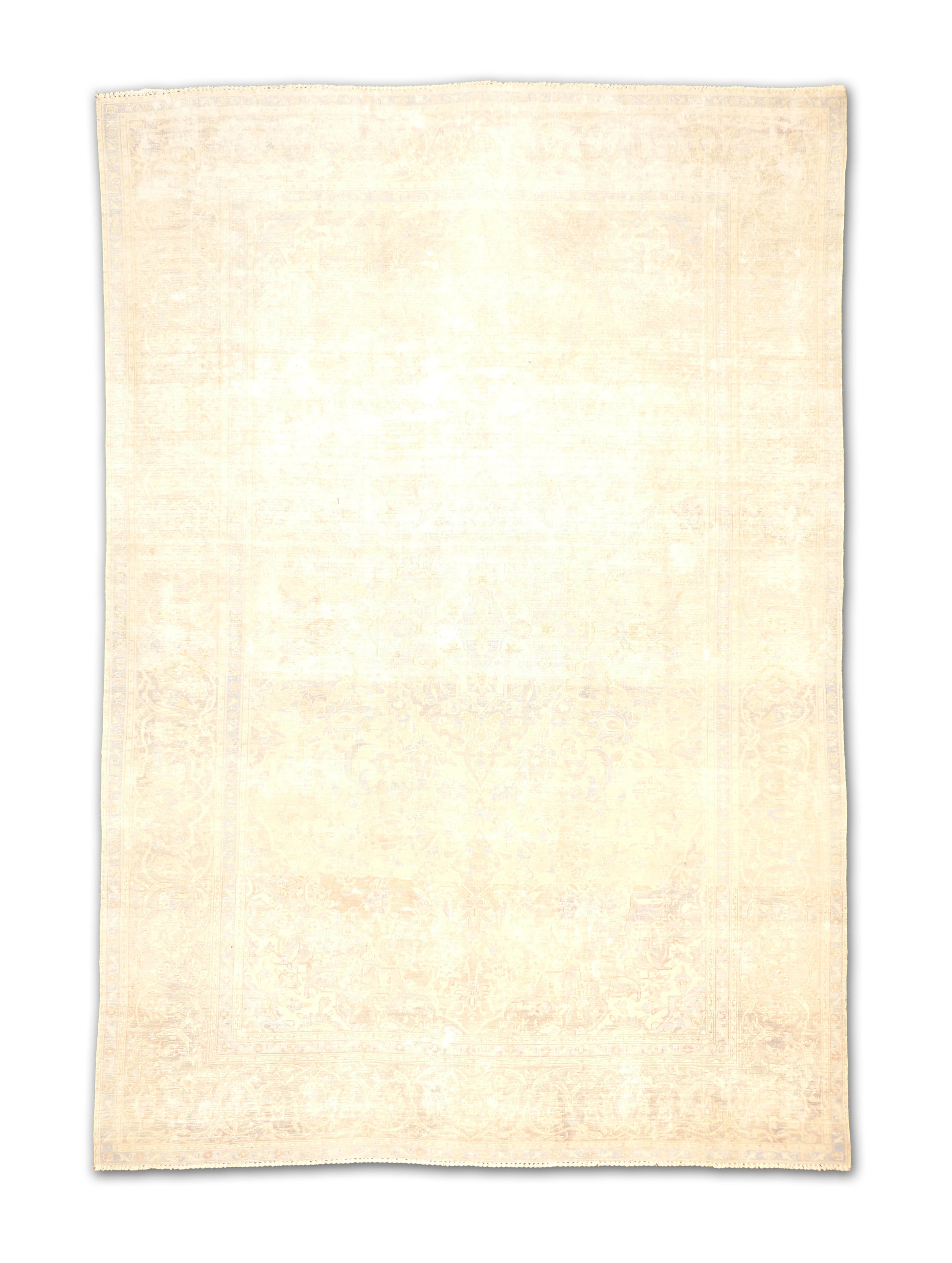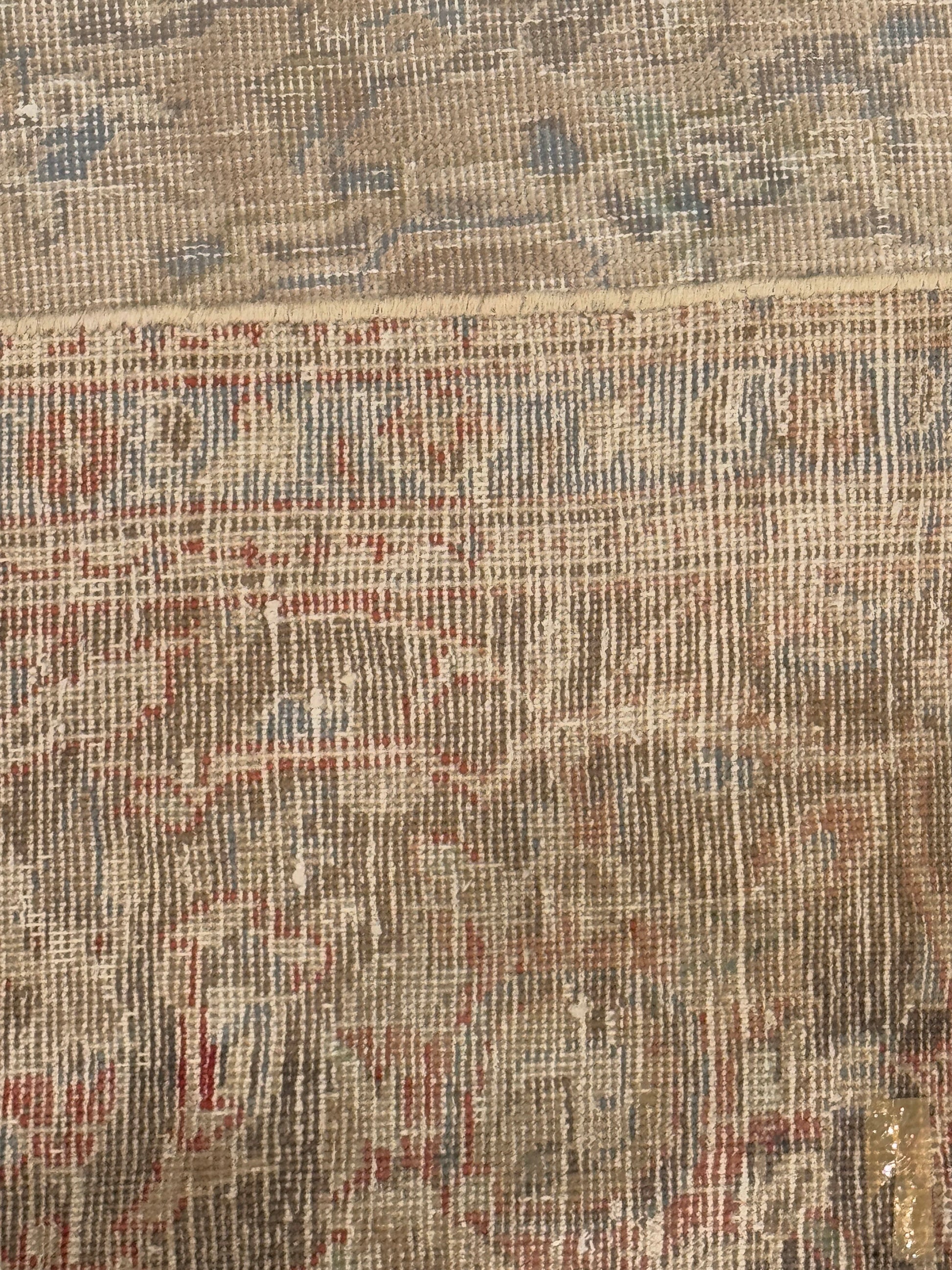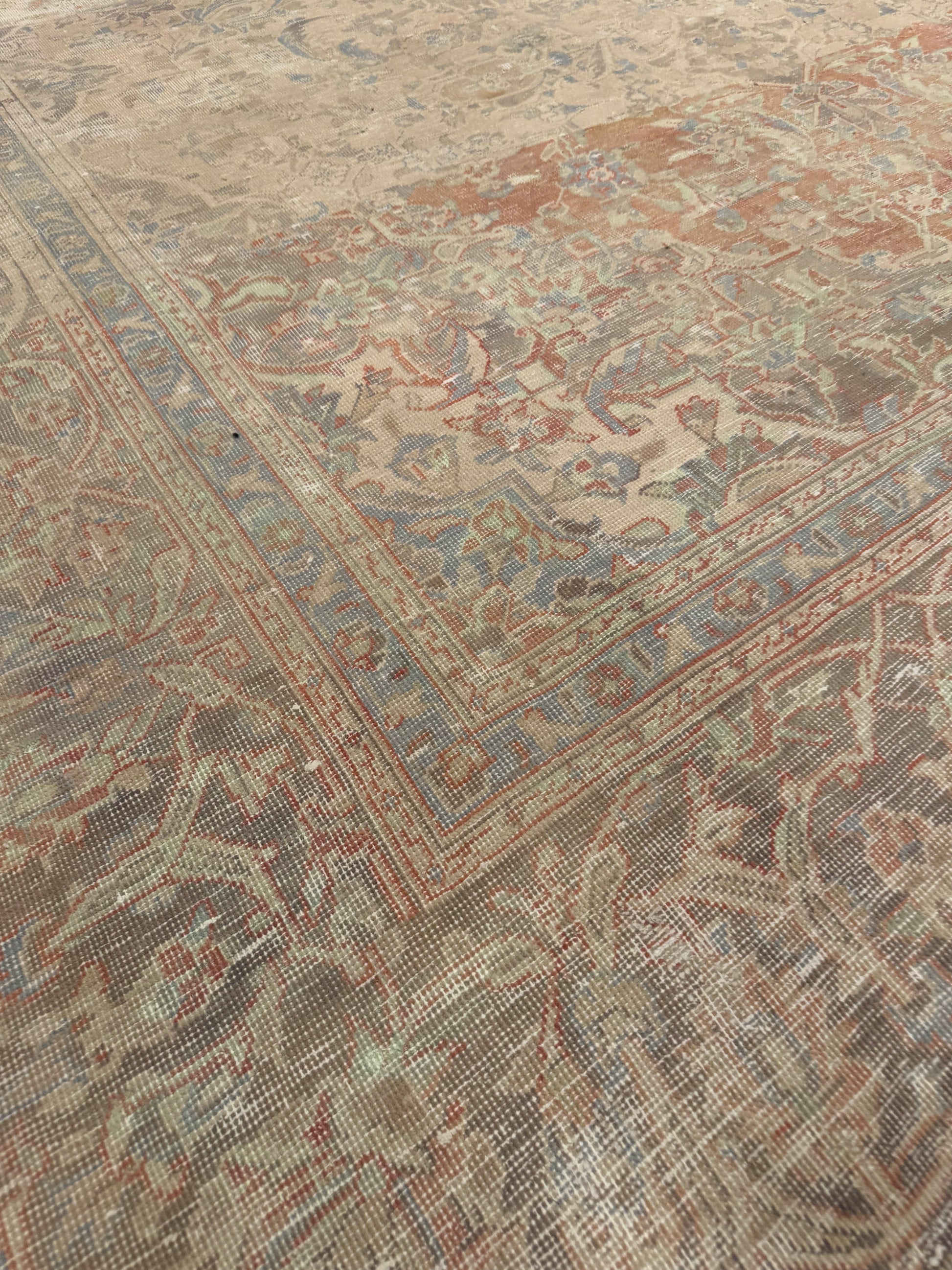 This handmade rug showcases a beautifully aged medallion design with softly blurred floral patterns and gentle abrash variations. Muted shades of beige, peach, slate blue, and taupe give it a refined, antique aesthetic with a calm and inviting presence. The distressed patina enhances its character, making it ideal for interiors that balance sophistication and comfort.