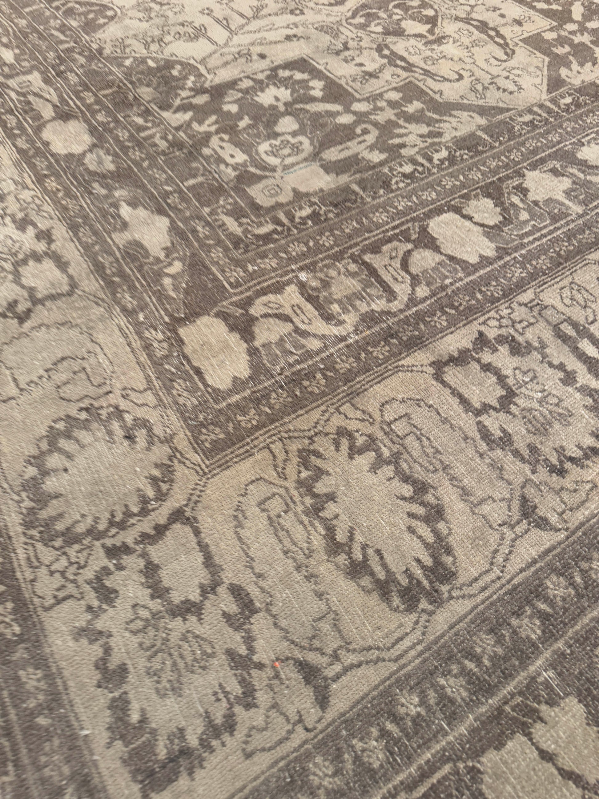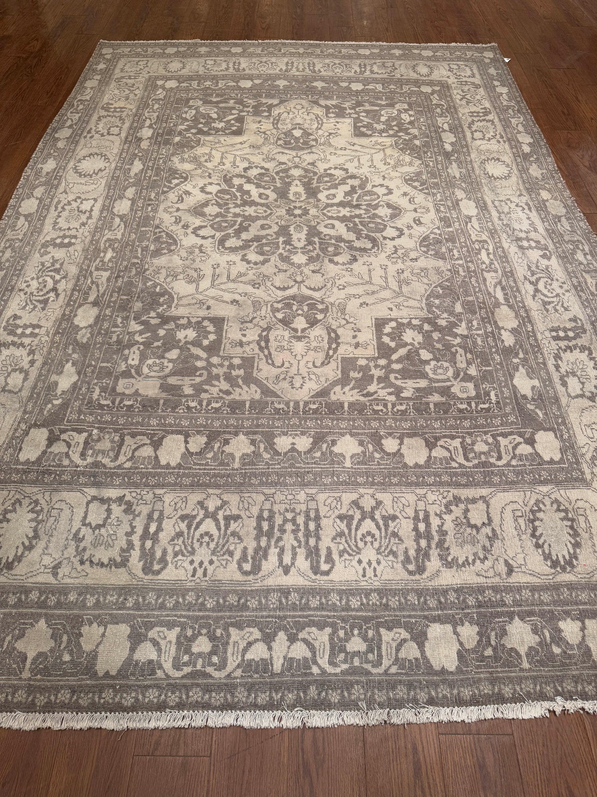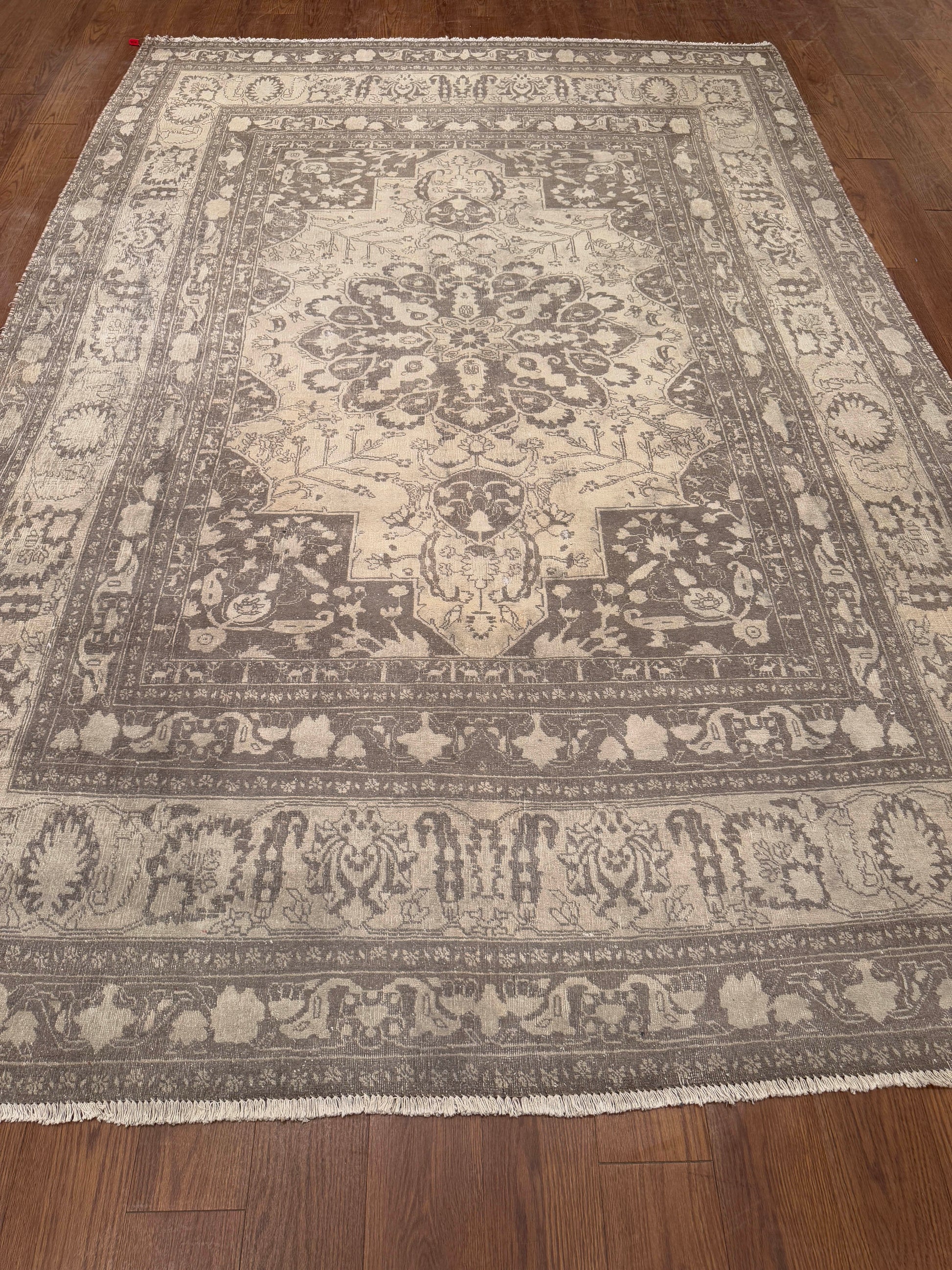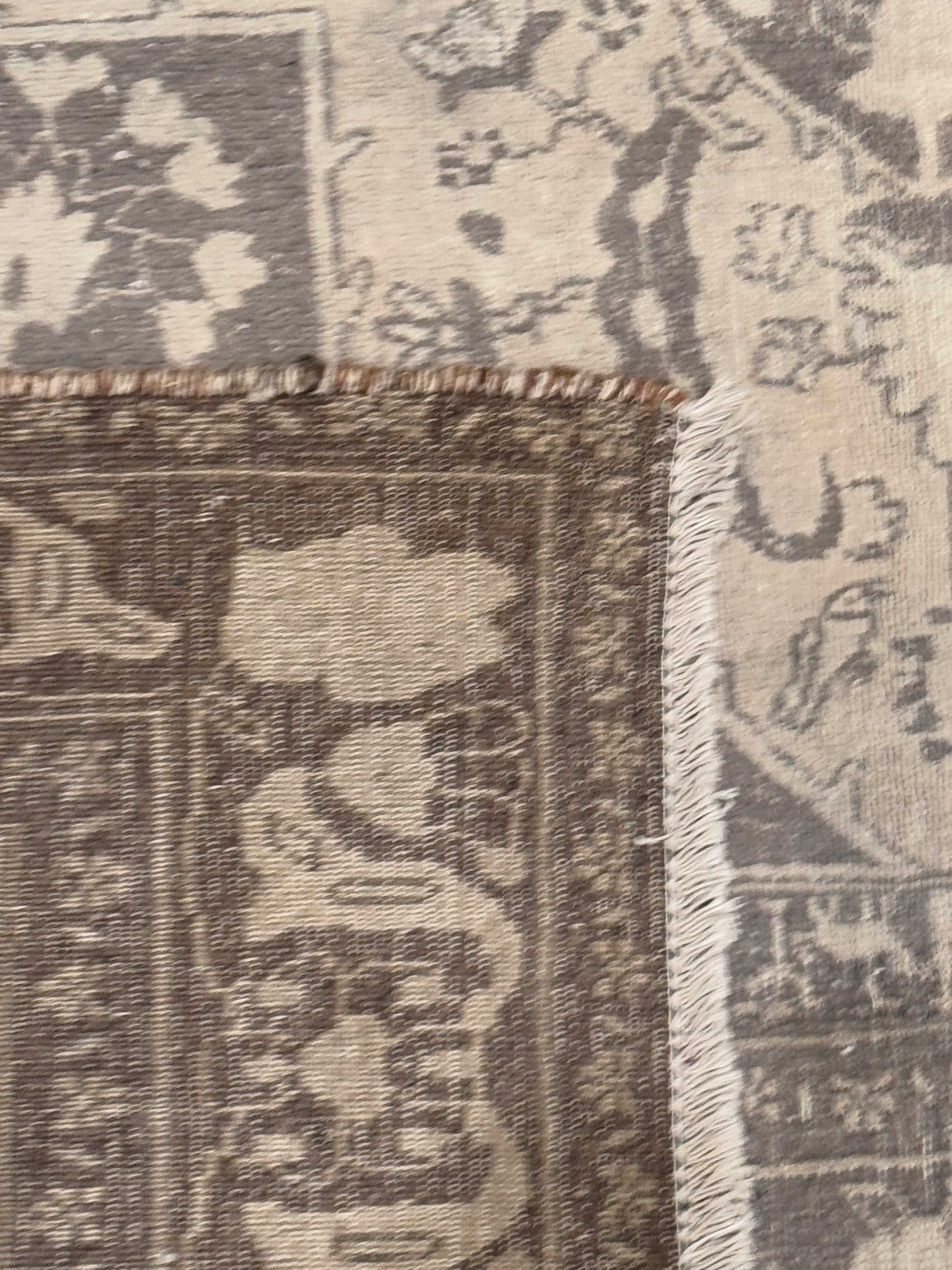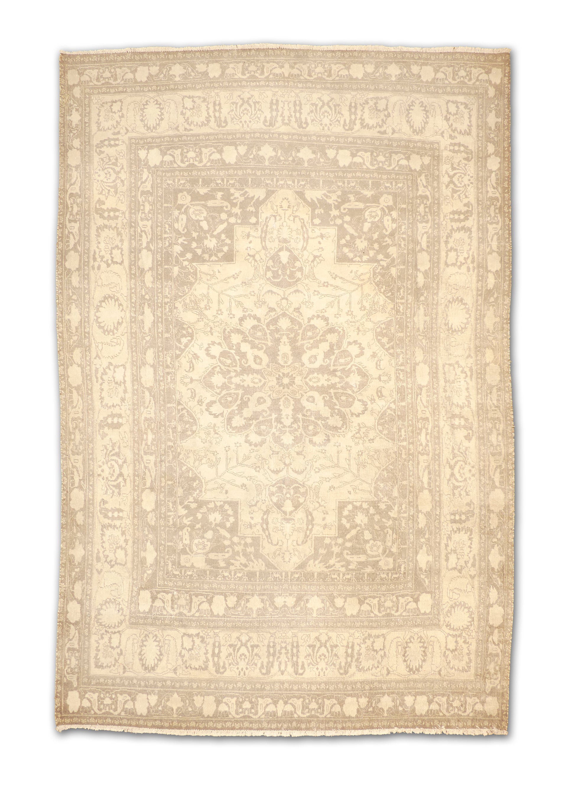 This handwoven rug features a graceful medallion design framed by intricate floral and vine motifs, rendered in a soothing neutral palette. The soft interplay of beige, ivory, and taupe creates a refined and timeless look, while the distressed texture adds depth and antique charm. Perfect for creating a calm and elegant foundation in both modern and traditional interiors.