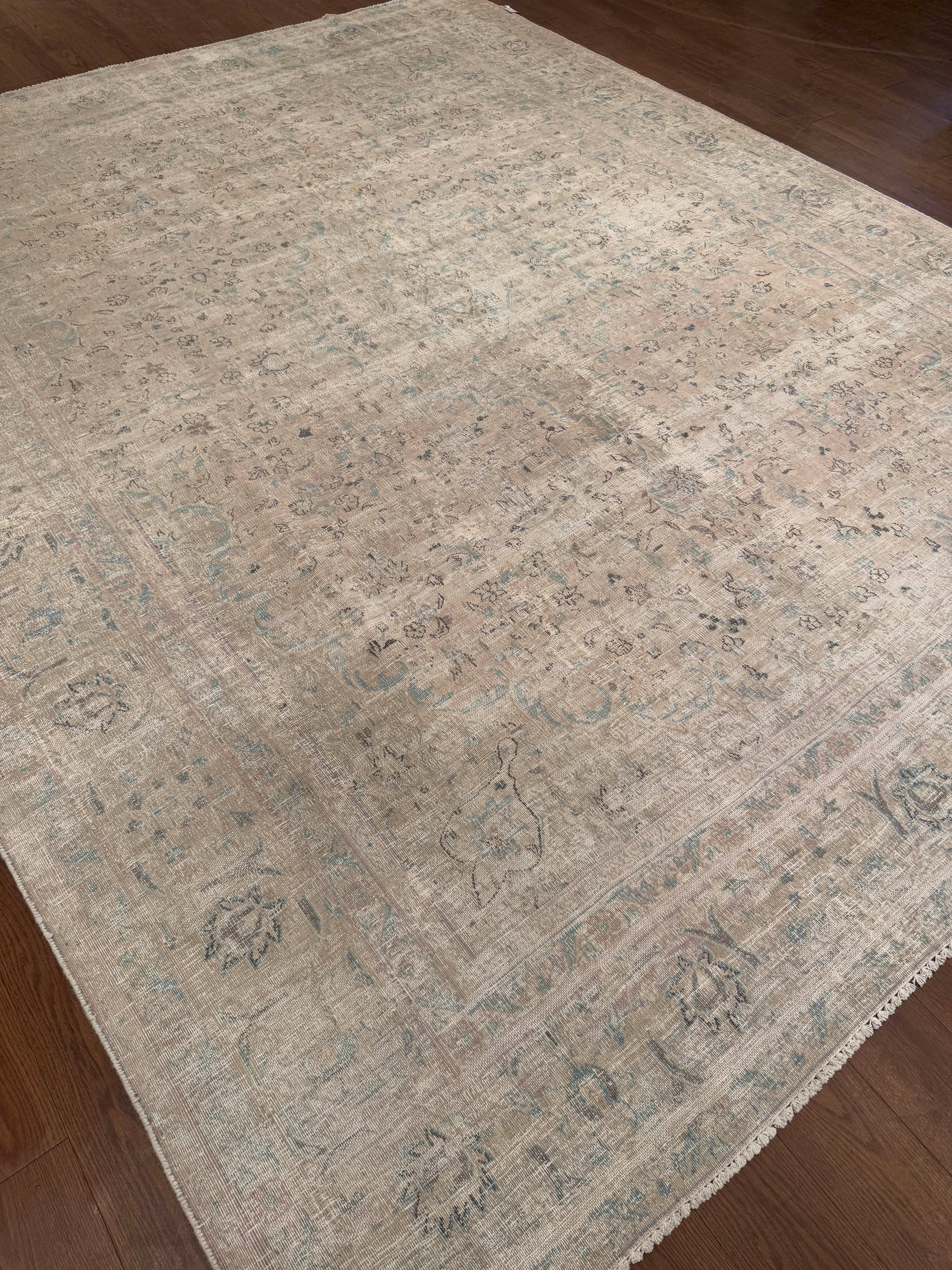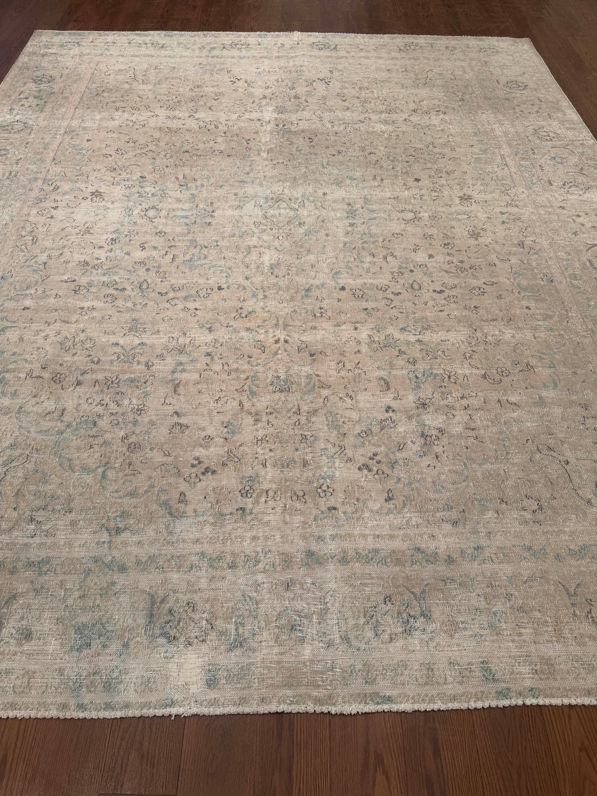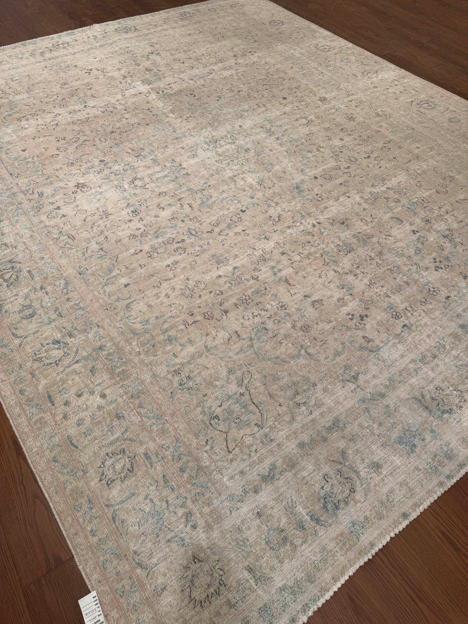 This handwoven rug features an all-over floral and vine design with a subtly faded aesthetic that lends it a vintage, time-worn charm. The muted beige ground is accented with soft blue and taupe tones, creating a calm, understated palette. Its distressed look makes it versatile for both traditional and modern interiors seeking a refined yet relaxed character.