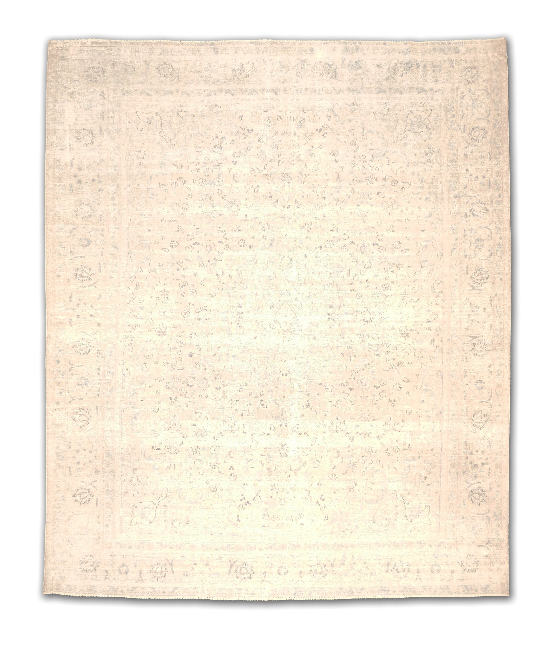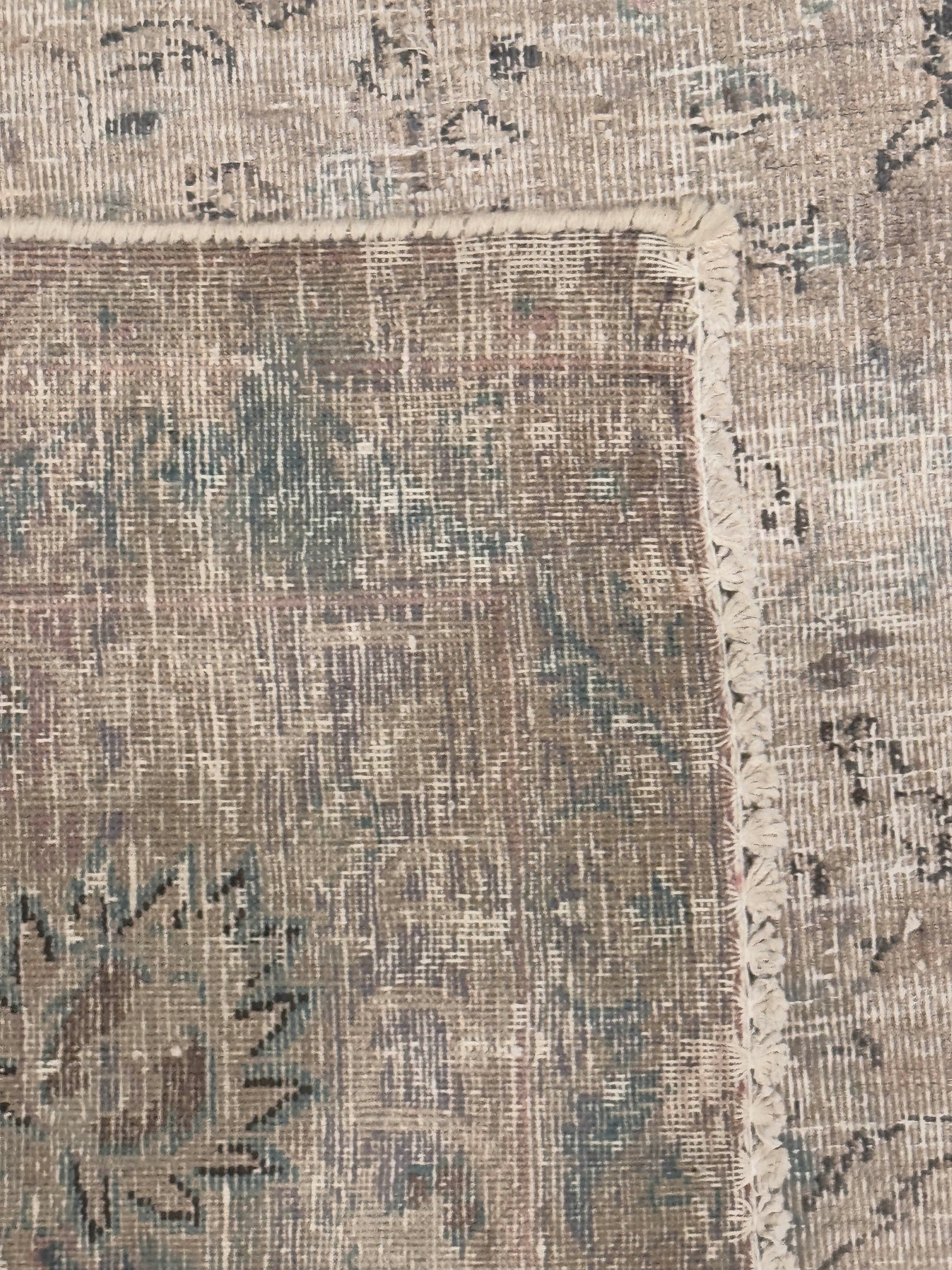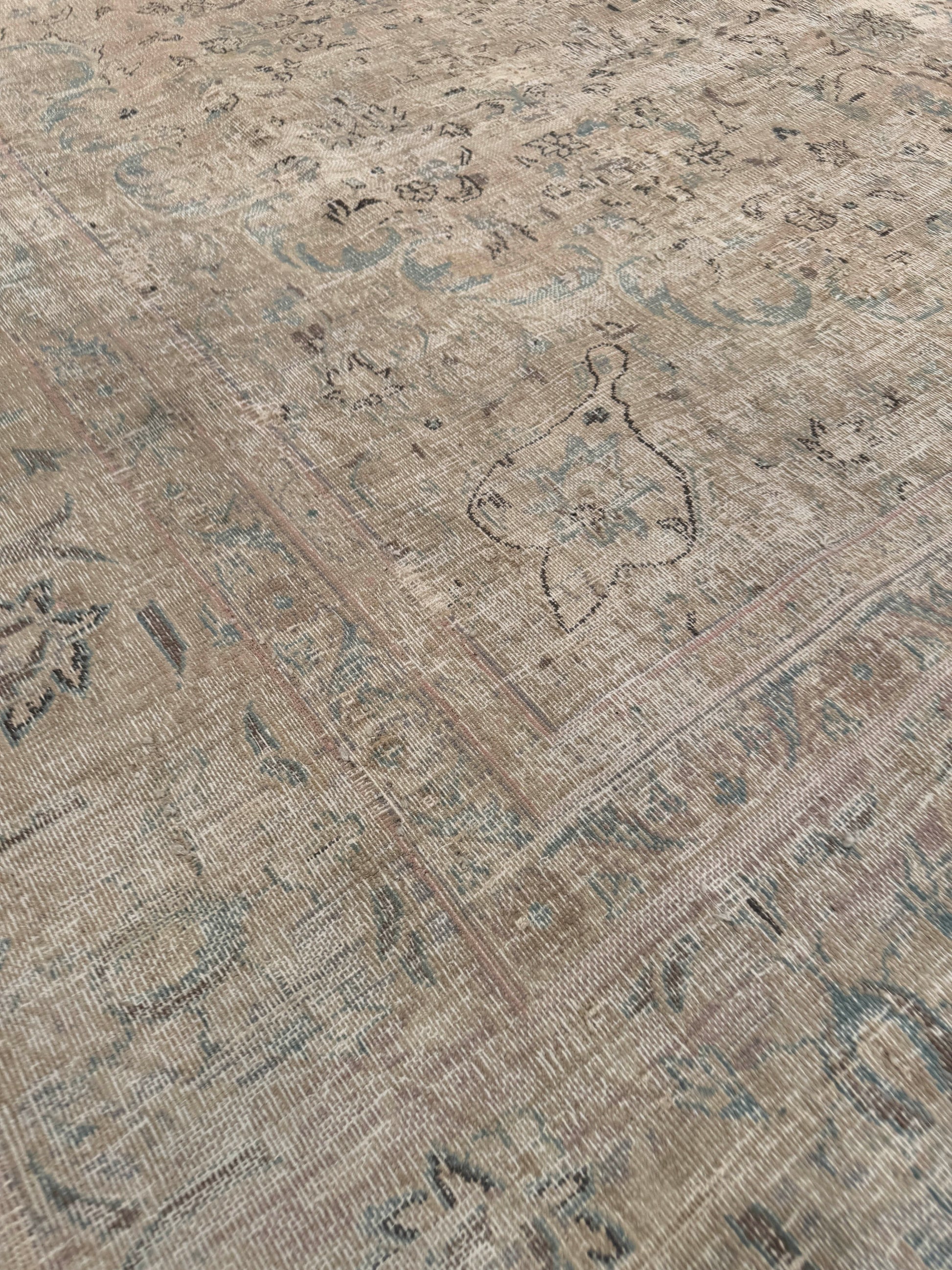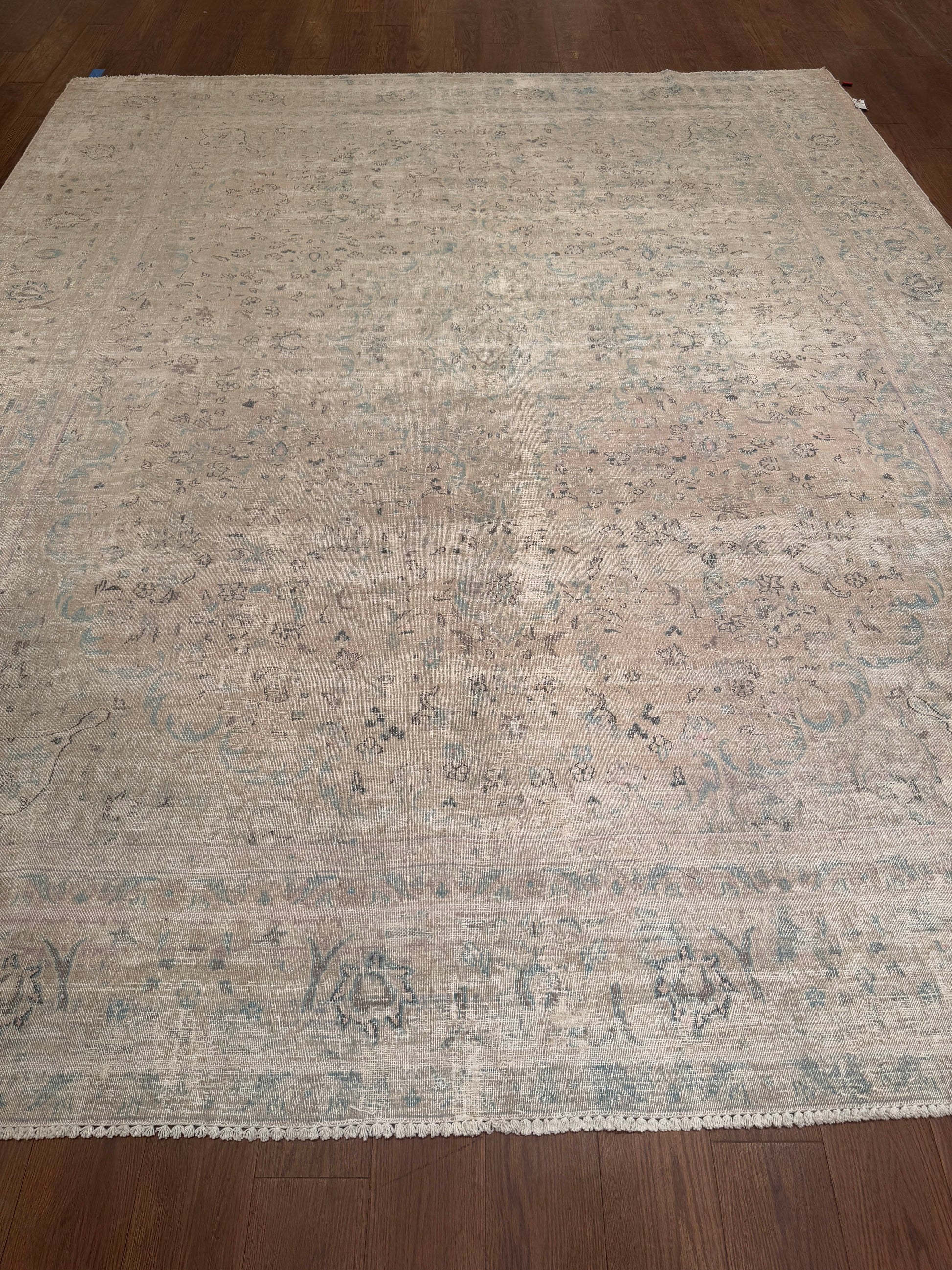 This handwoven rug features an all-over floral and vine design with a subtly faded aesthetic that lends it a vintage, time-worn charm. The muted beige ground is accented with soft blue and taupe tones, creating a calm, understated palette. Its distressed look makes it versatile for both traditional and modern interiors seeking a refined yet relaxed character.