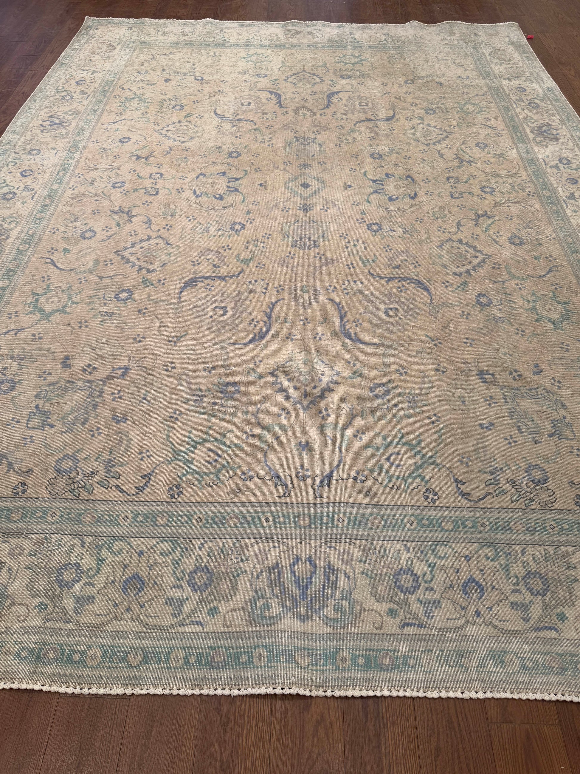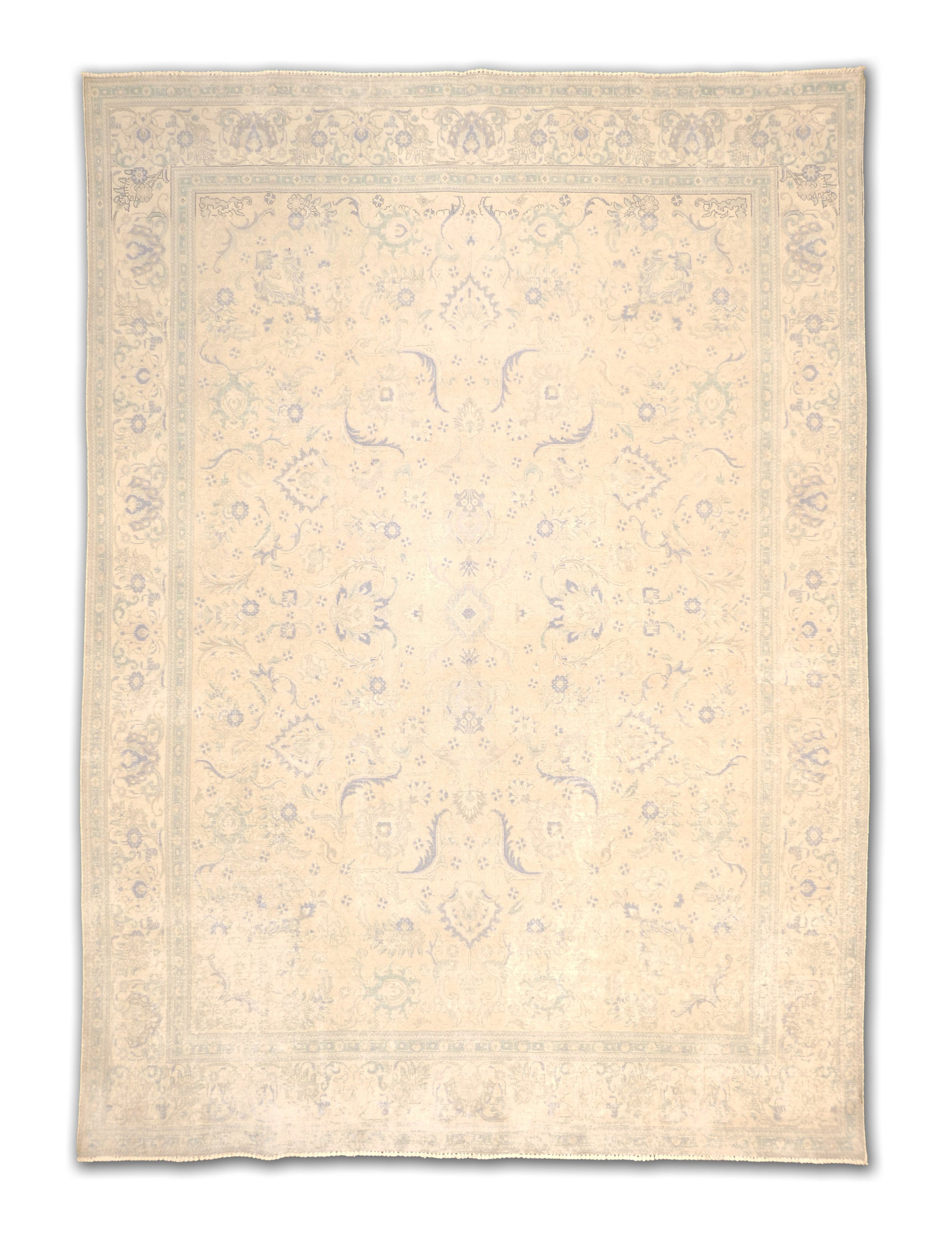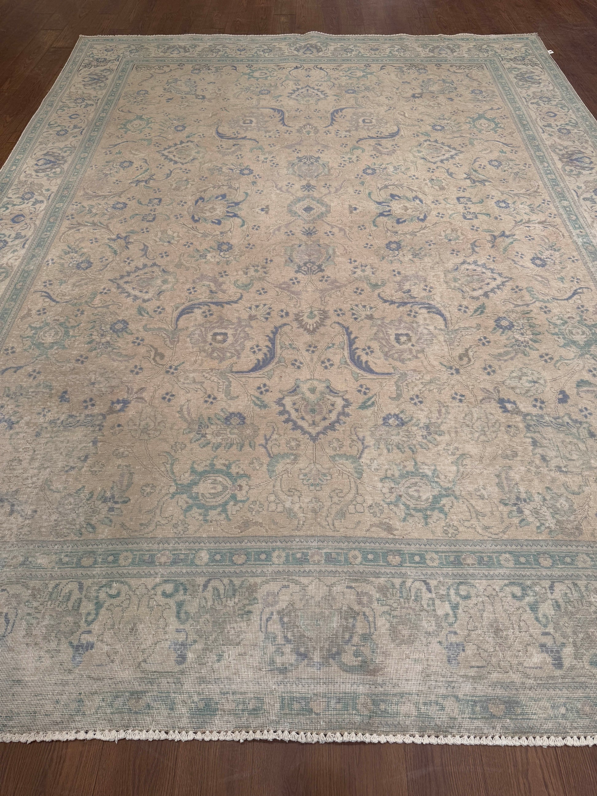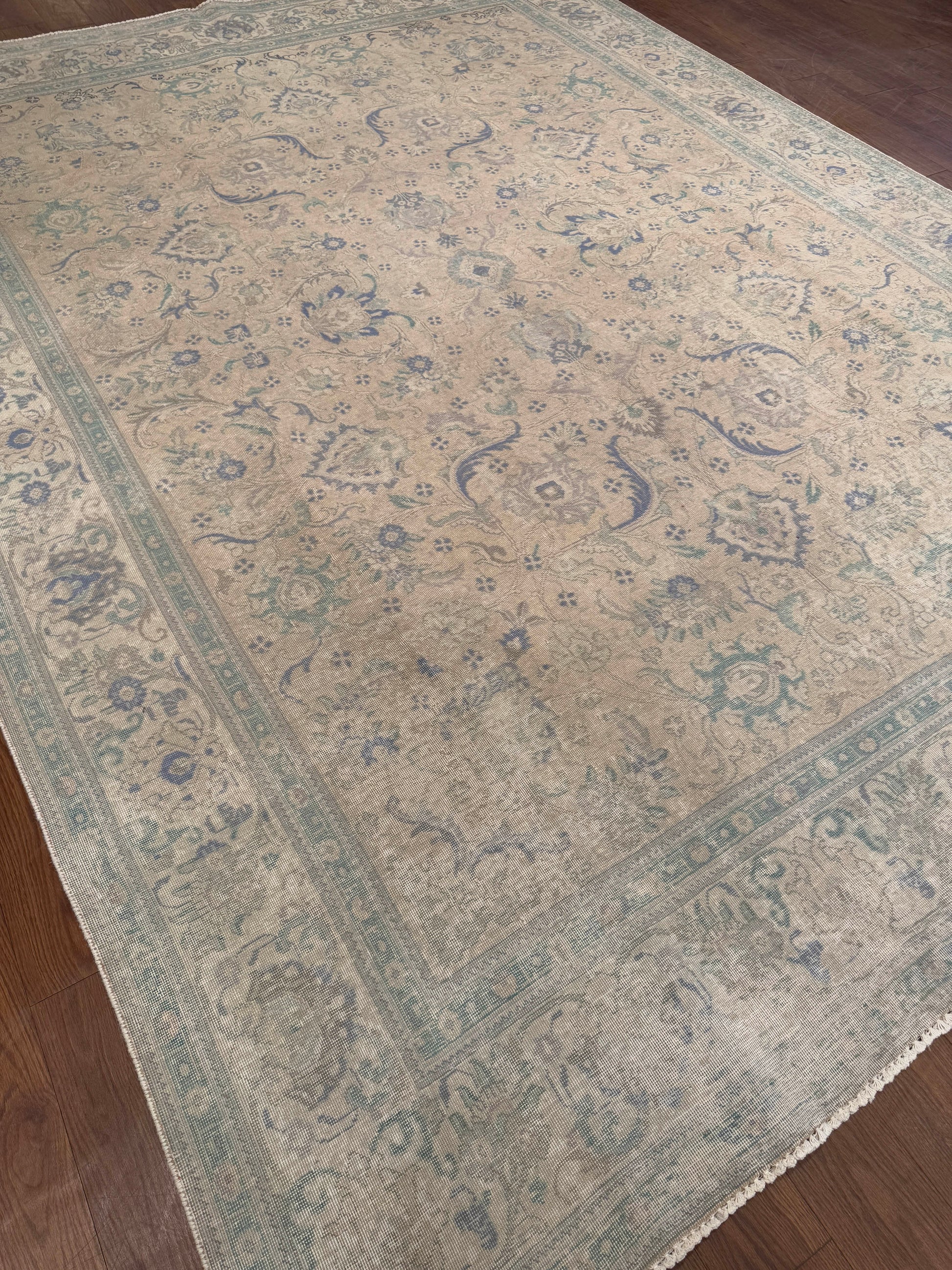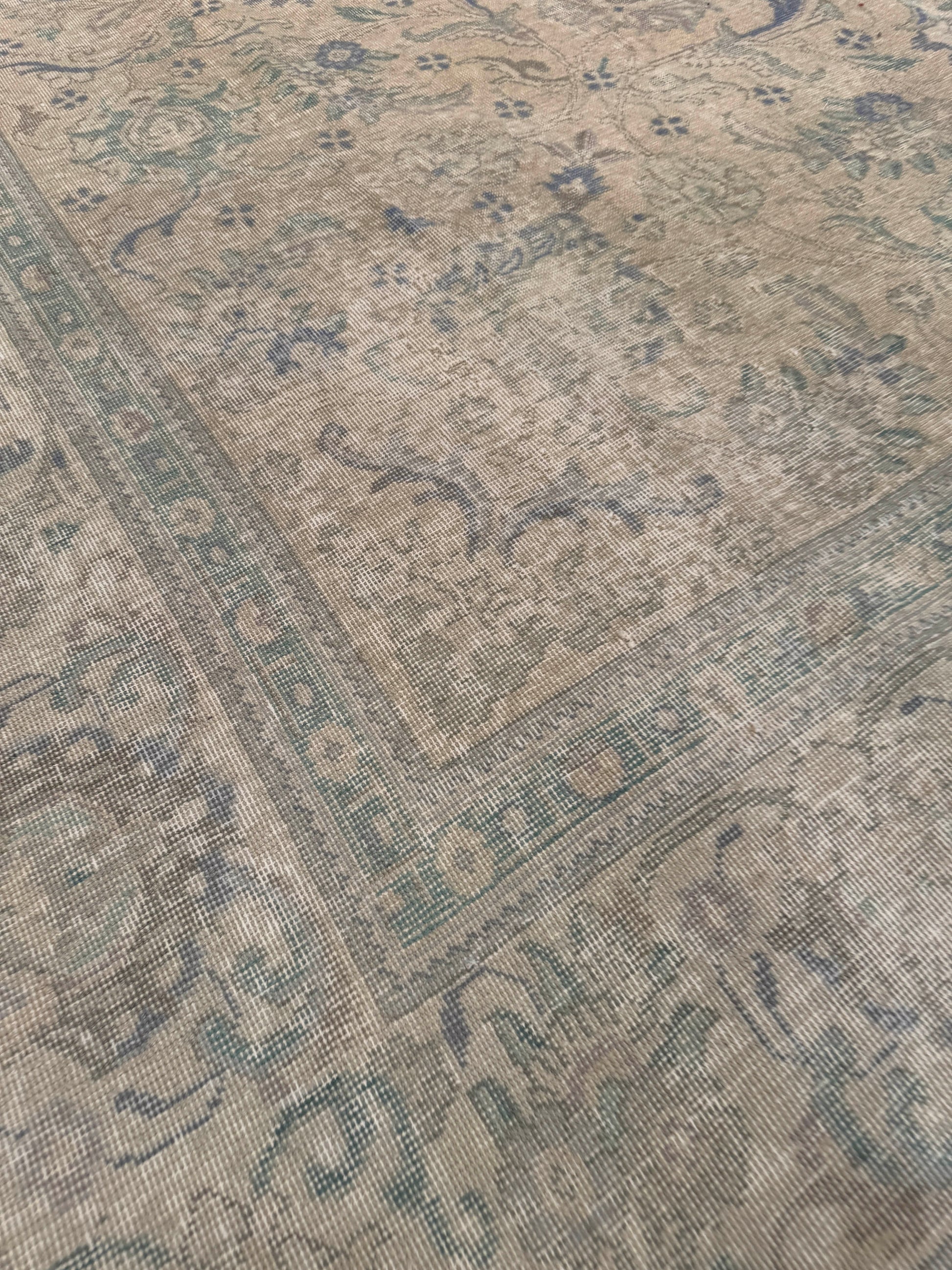 This refined handwoven rug features an all-over floral design with scrolling vines and stylized blossoms, framed by an elegant border of botanical motifs. The palette of beige, muted teal, and soft blue is softened with a distressed finish, giving the piece a vintage, timeworn beauty. Its understated elegance makes it a versatile addition to both traditional and transitional interiors.