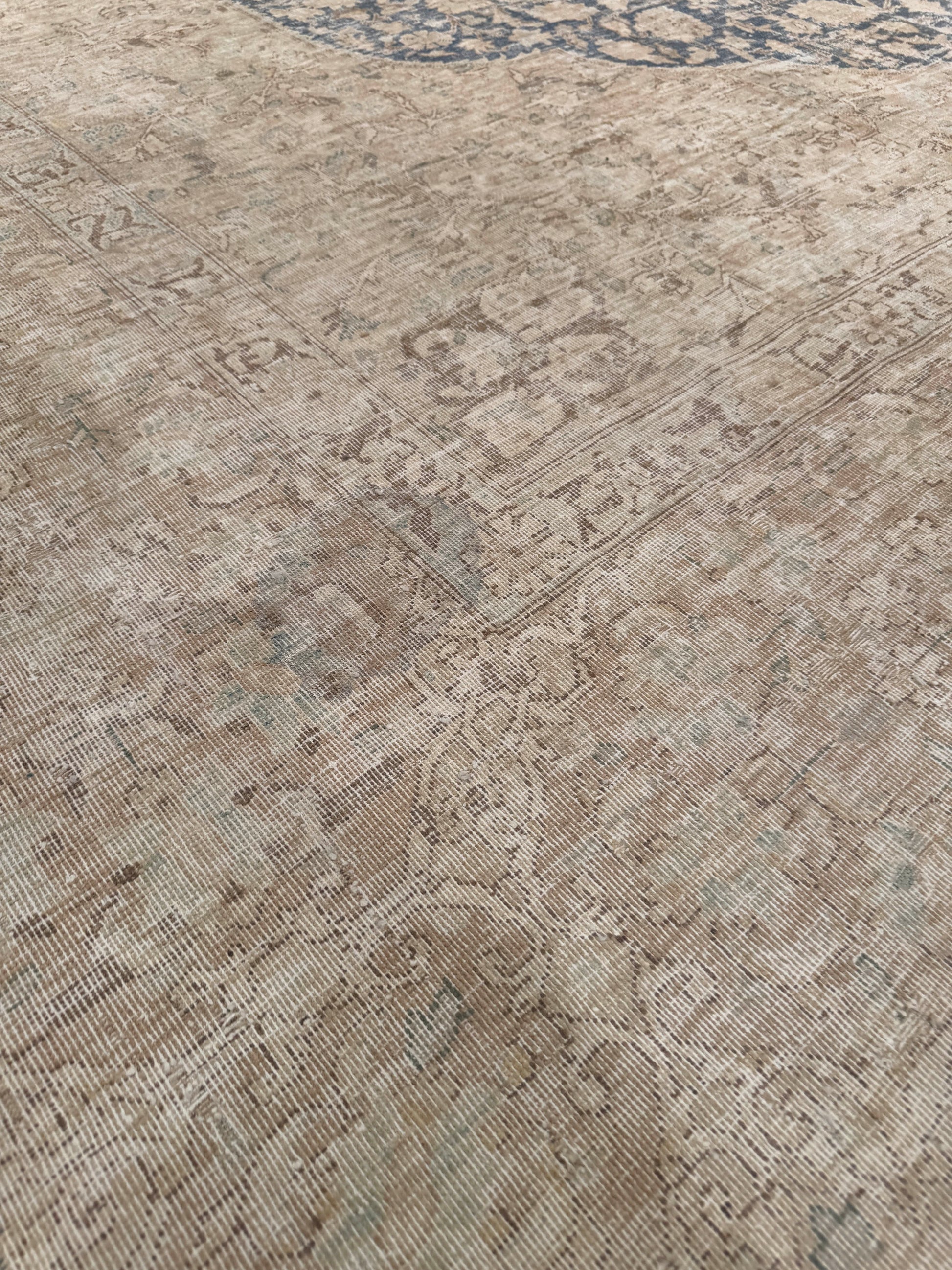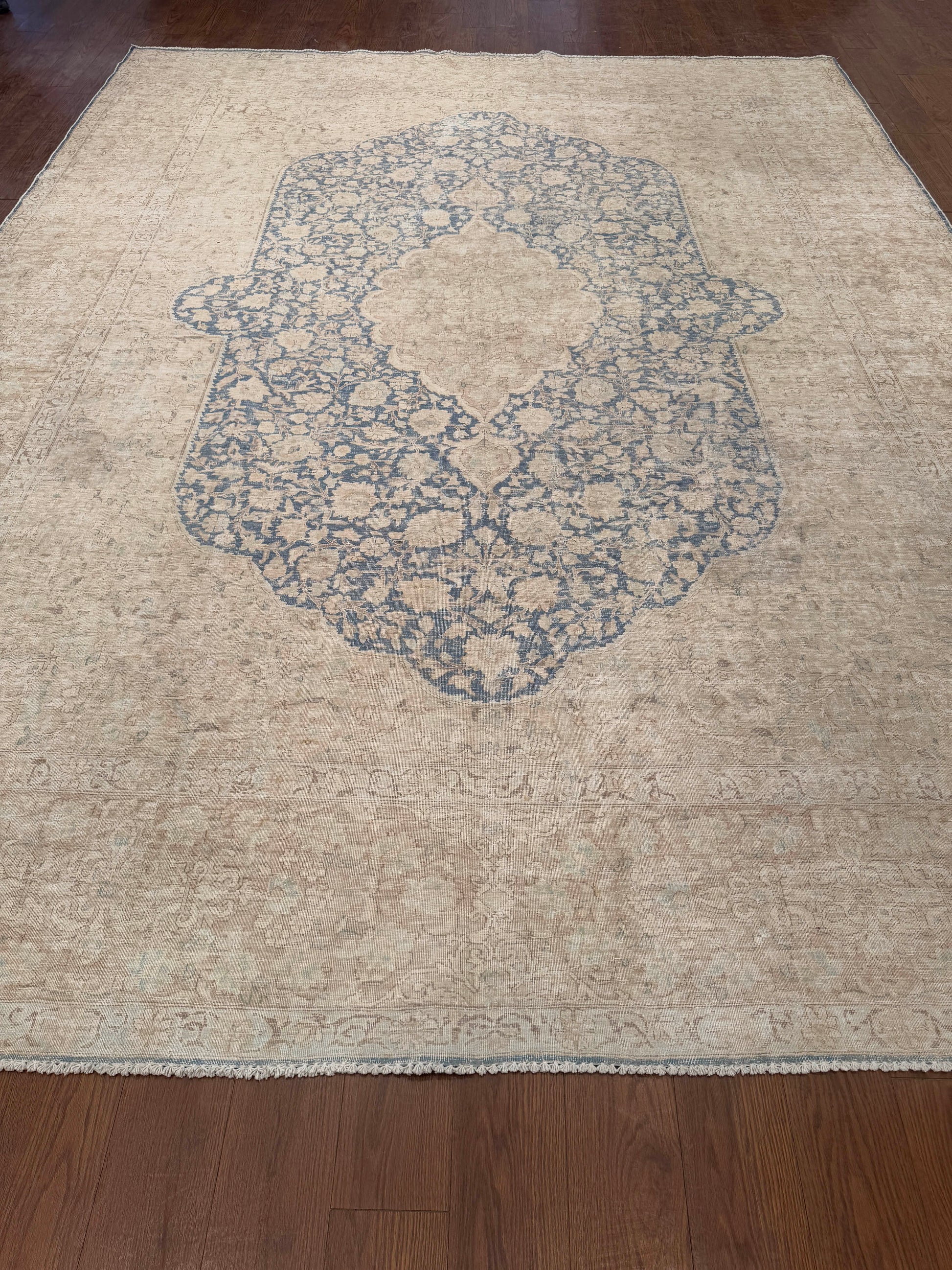 This elegant handwoven rug features a grand medallion-style open field with a central lozenge motif framed in delicate floral patterns. The surrounding negative space highlights the intricate details, giving the design a sense of balance and refinement. Soft beige, muted taupe, and faded blue tones create a calming, antique-inspired palette, making it a versatile choice for sophisticated interiors.