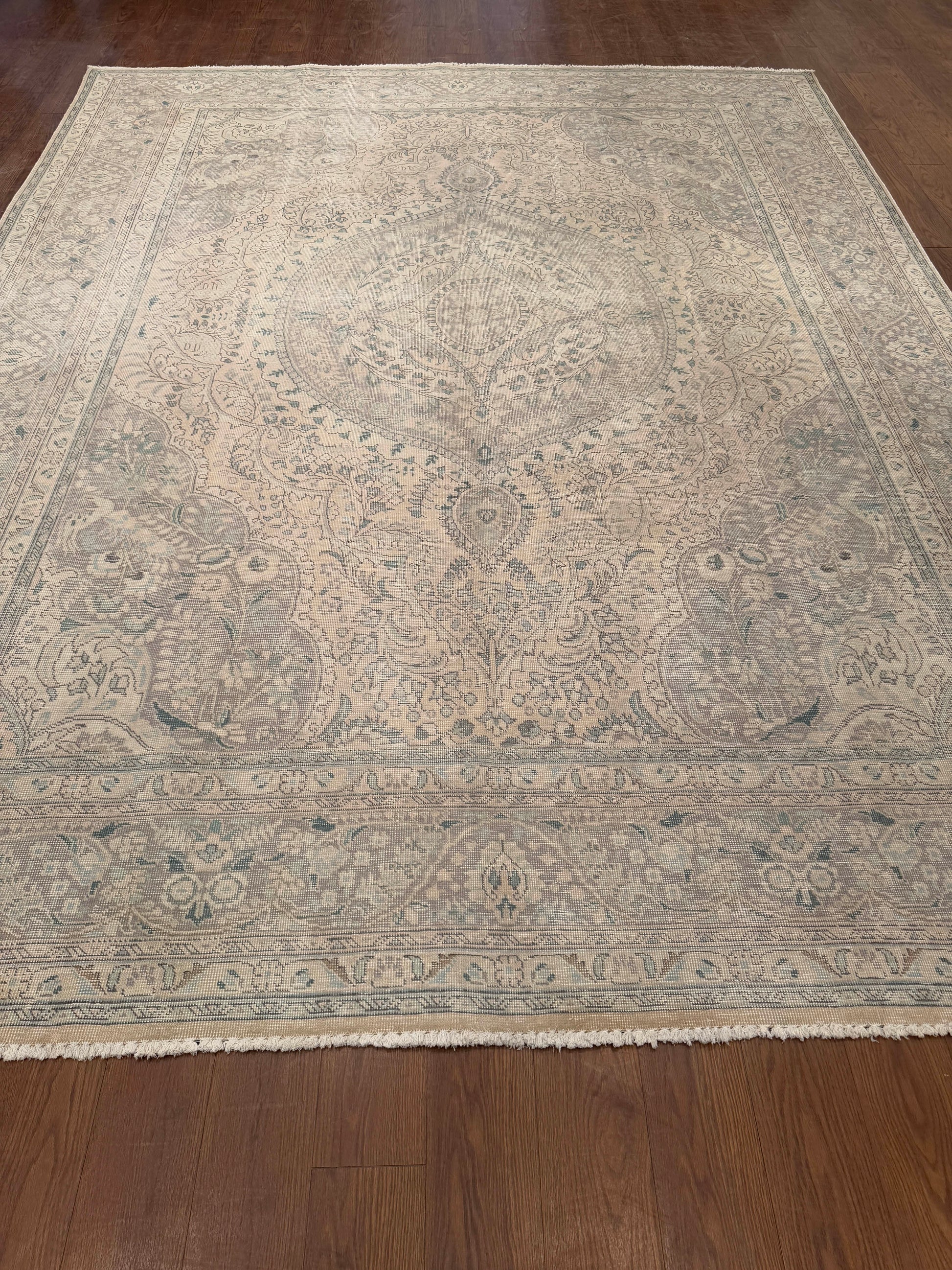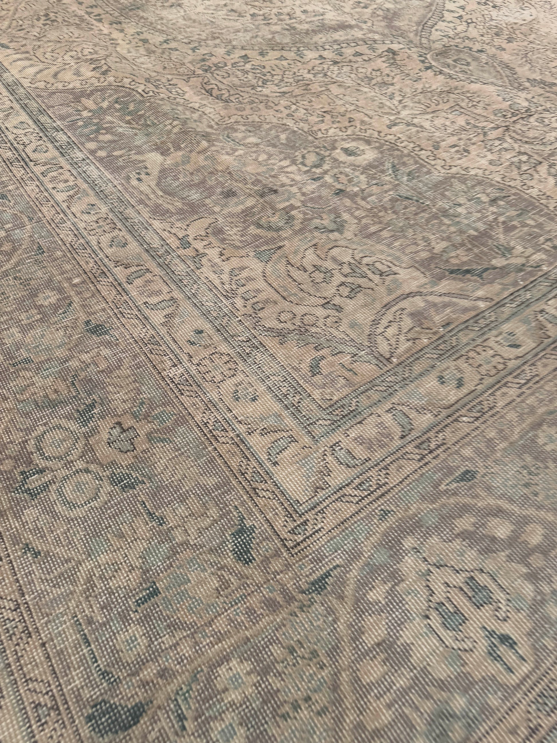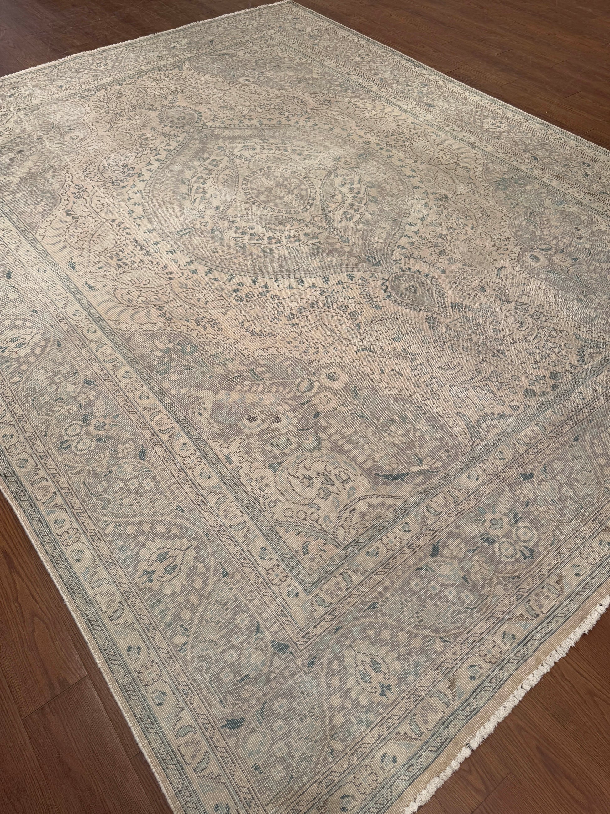 This elegant handwoven rug displays a classic Persian medallion-and-vine design softened by a distressed, faded finish. The central medallion flows seamlessly into delicate floral motifs, framed by scrolling borders that enhance its refined character. Muted tones of beige, soft grey, and hints of teal create a serene palette that brings vintage charm and understated sophistication to any room.
