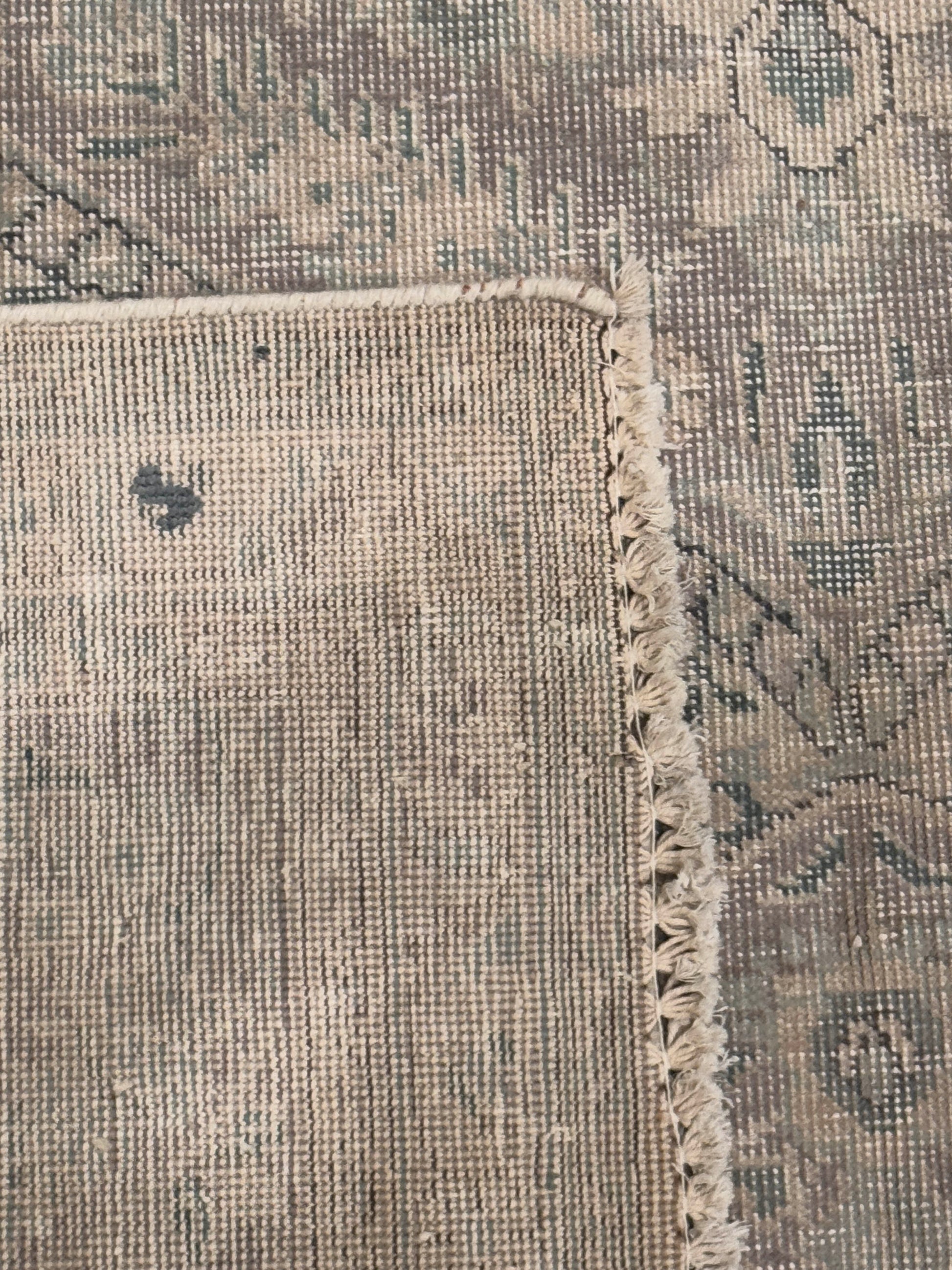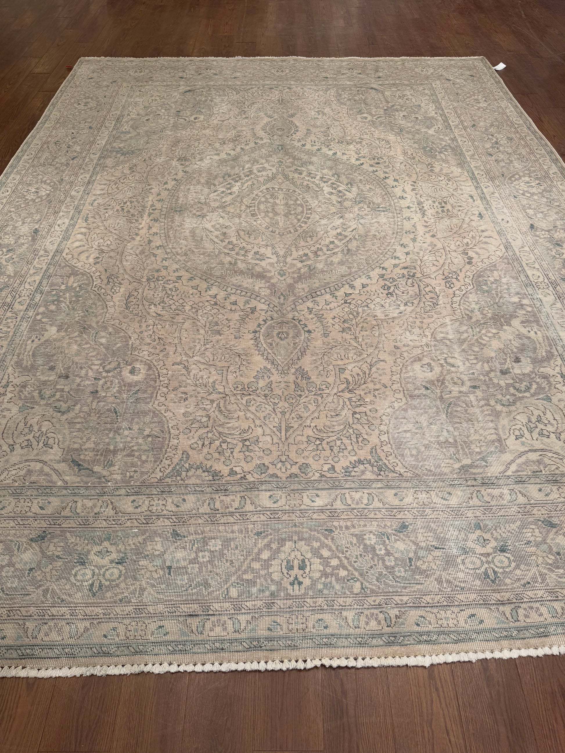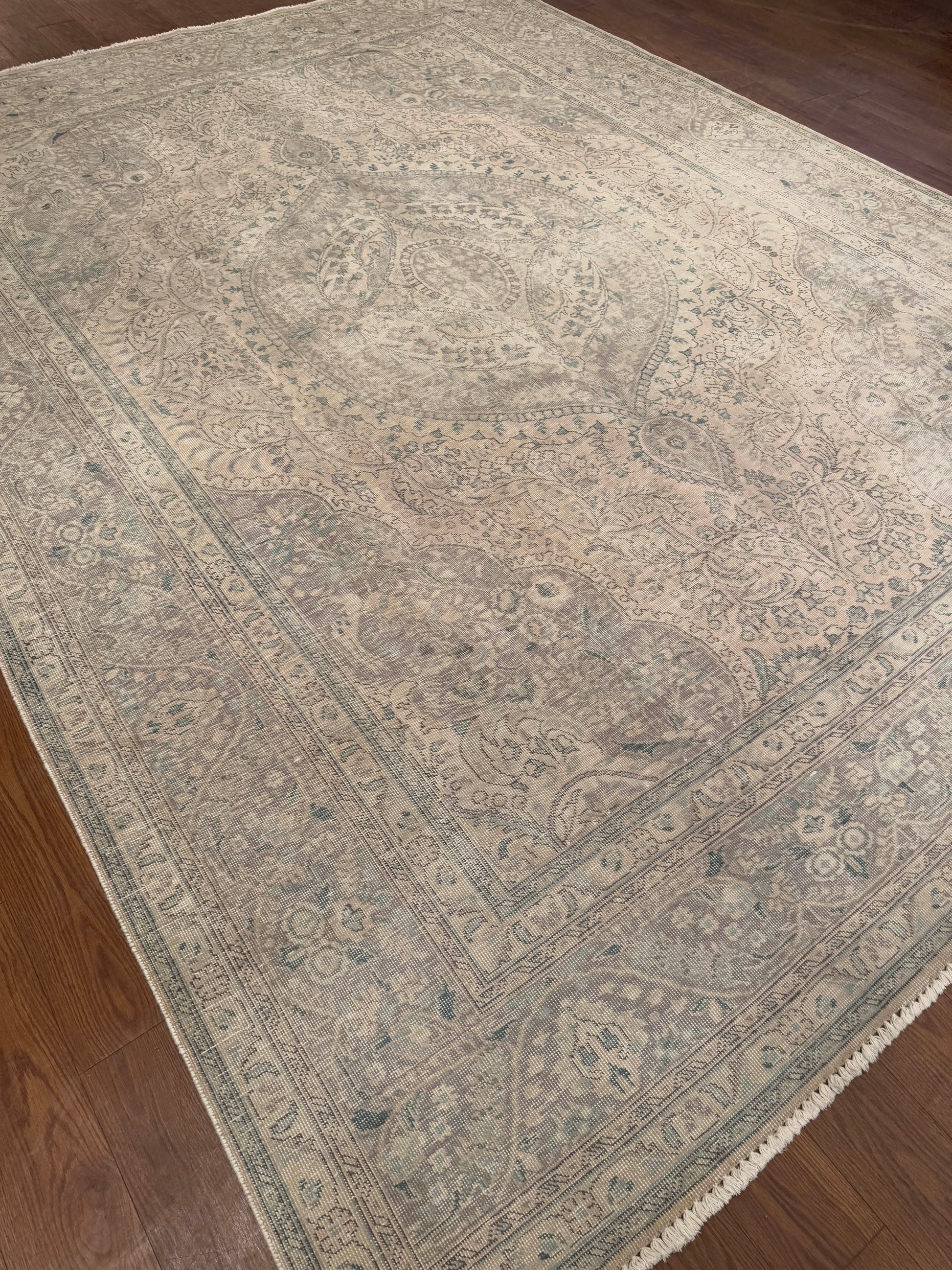 This elegant handwoven rug displays a classic Persian medallion-and-vine design softened by a distressed, faded finish. The central medallion flows seamlessly into delicate floral motifs, framed by scrolling borders that enhance its refined character. Muted tones of beige, soft grey, and hints of teal create a serene palette that brings vintage charm and understated sophistication to any room.
