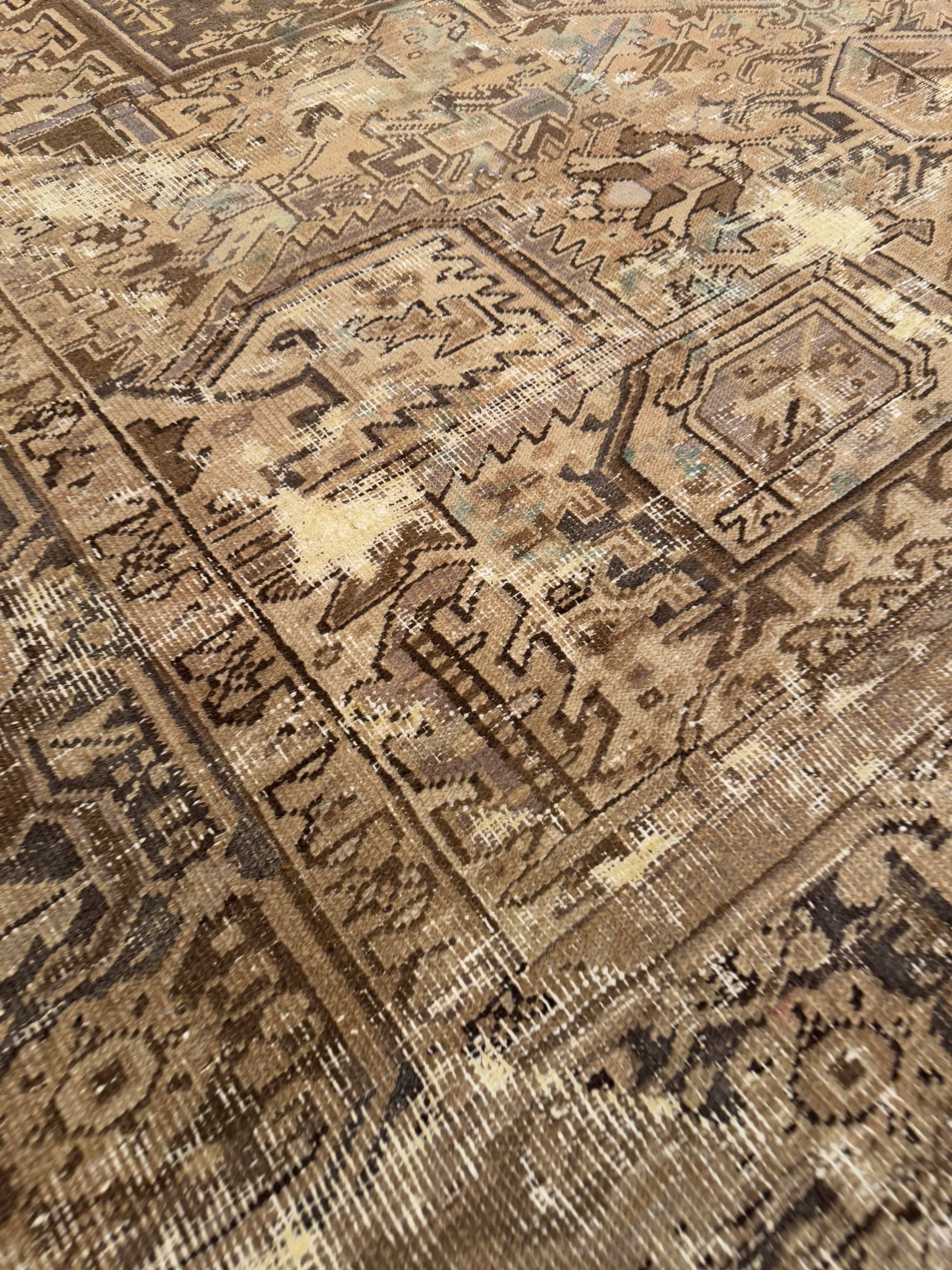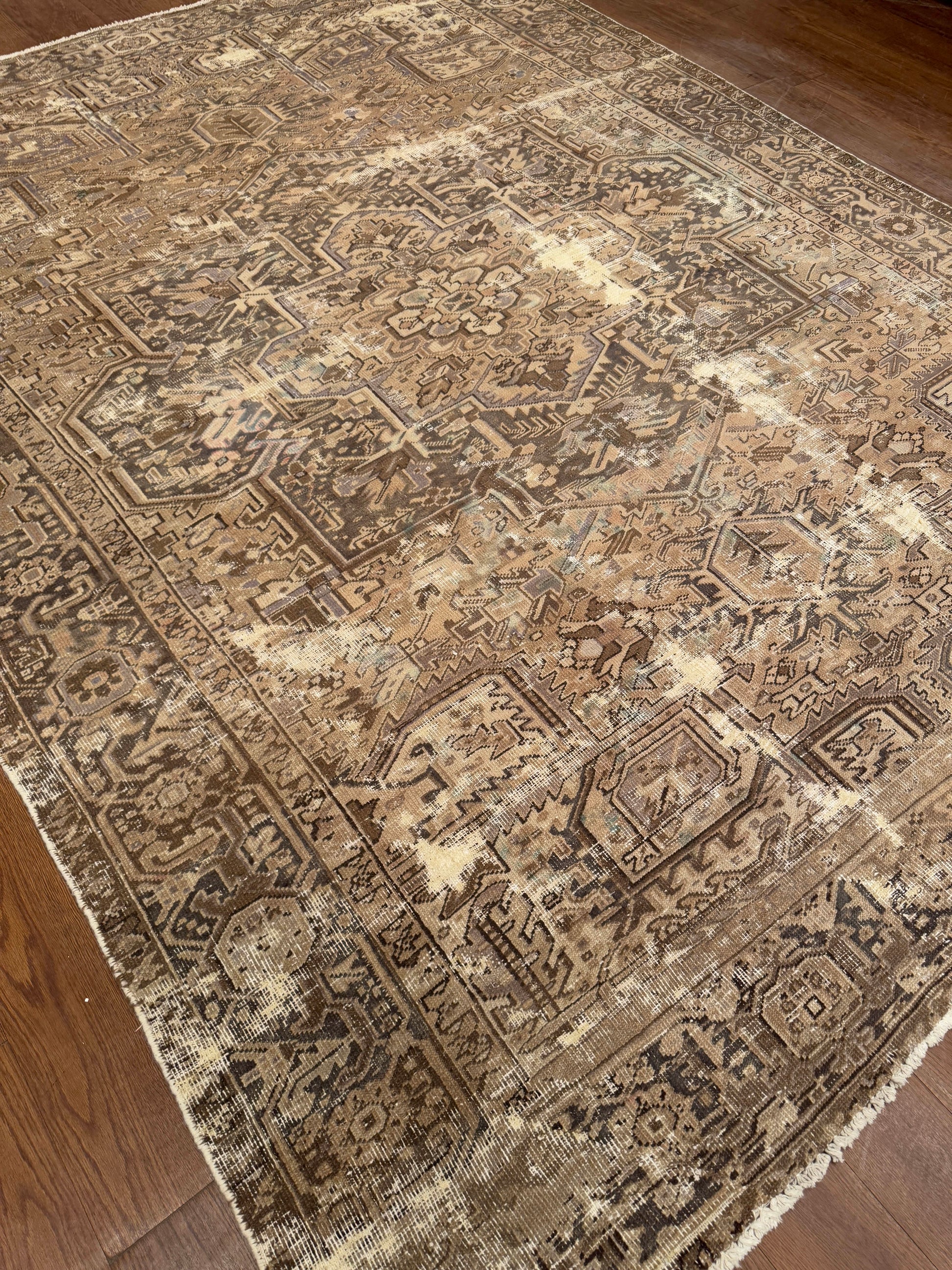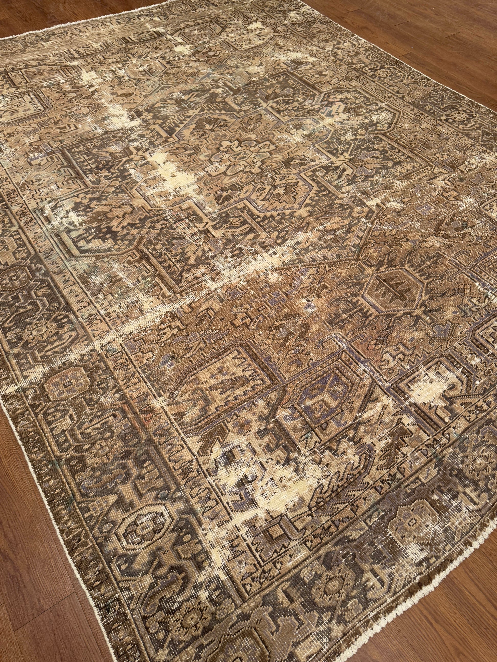 This handwoven rug showcases an intricate geometric medallion design accented by layered tribal motifs, rendered in an earthy palette of chestnut, sand, and taupe. The naturally distressed texture and abrash variations lend it a timeworn, antique appearance full of character and warmth. Perfect for grounding modern, rustic, or traditional interiors with a sense of artisanal heritage and understated elegance.