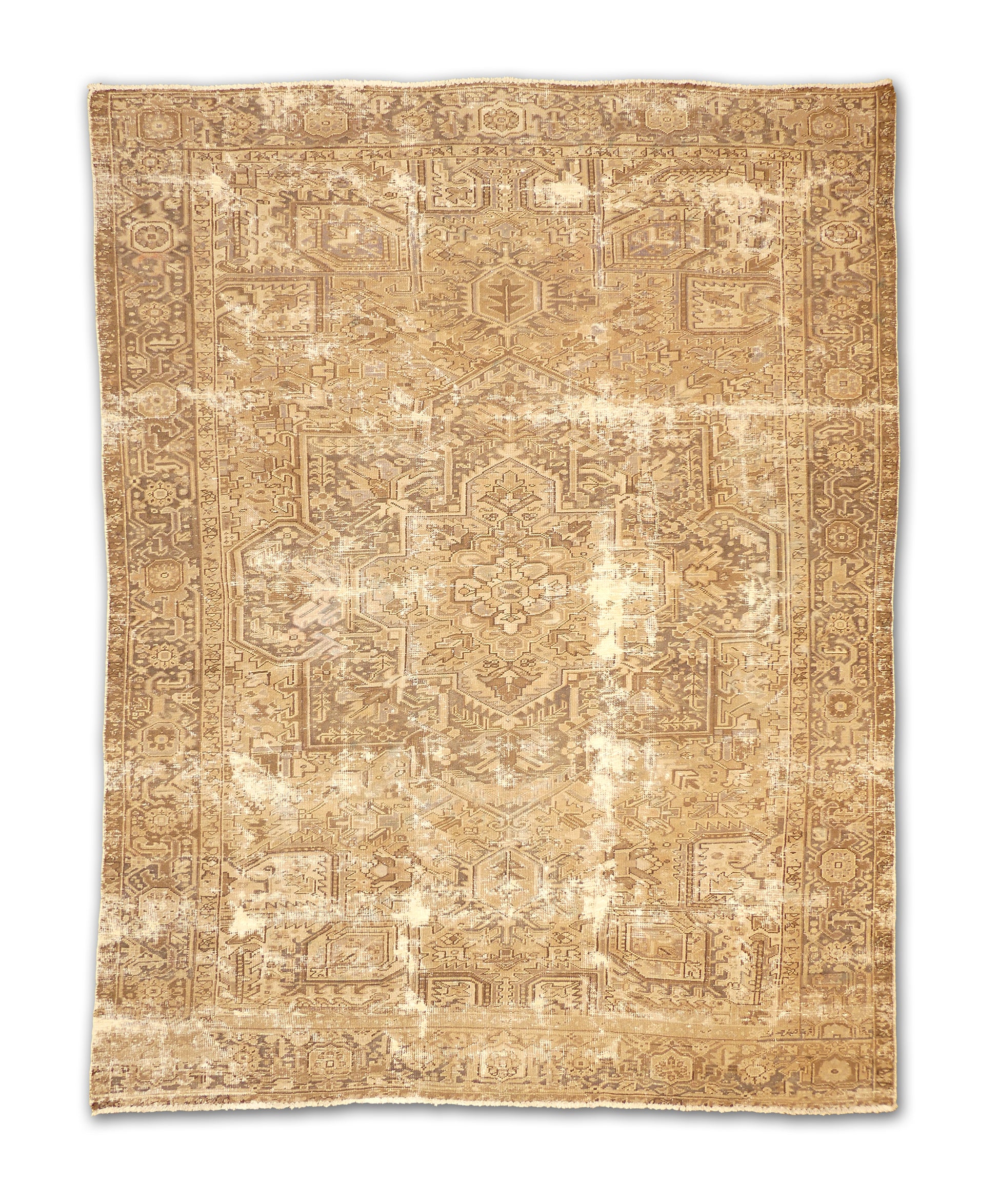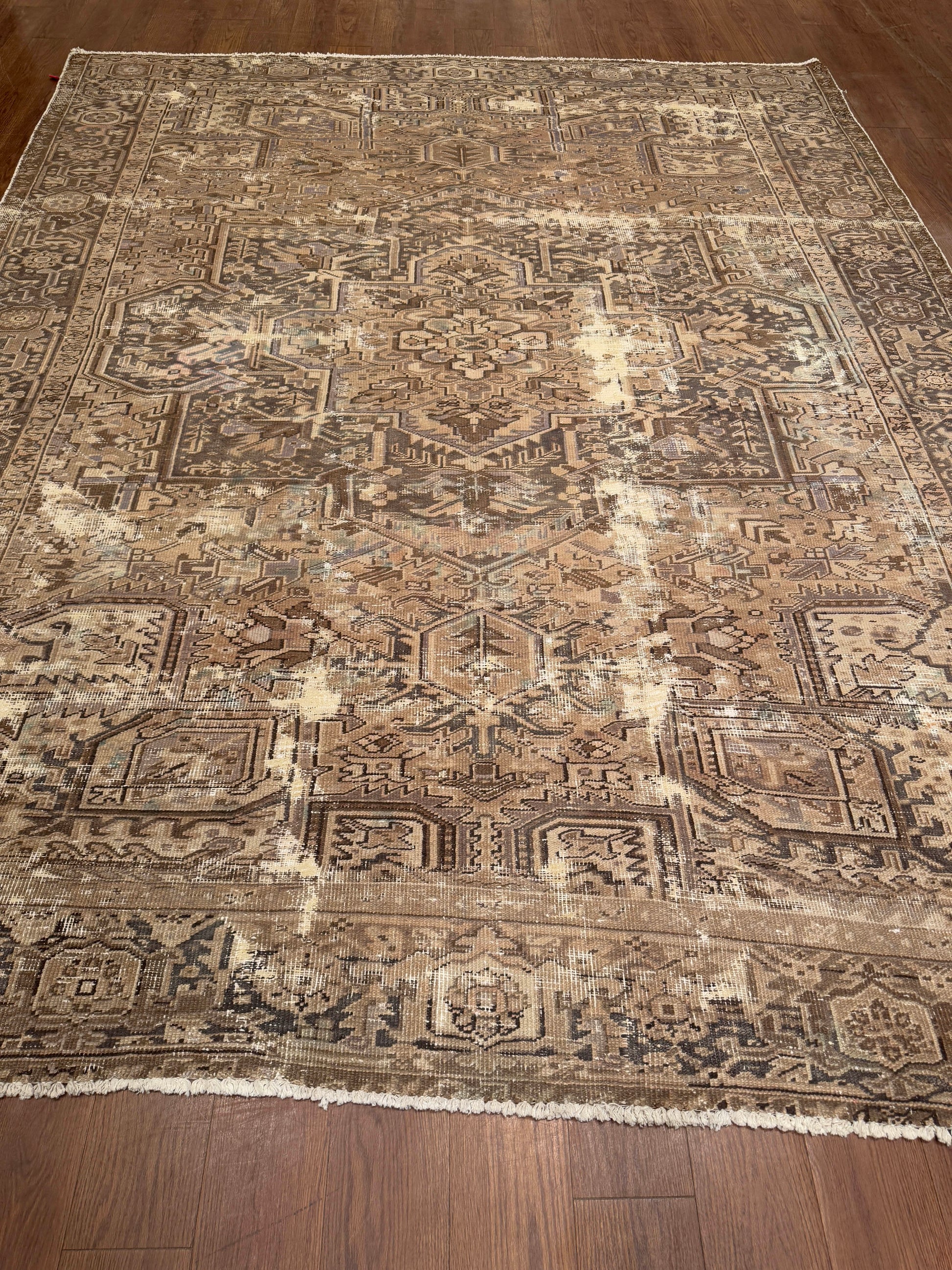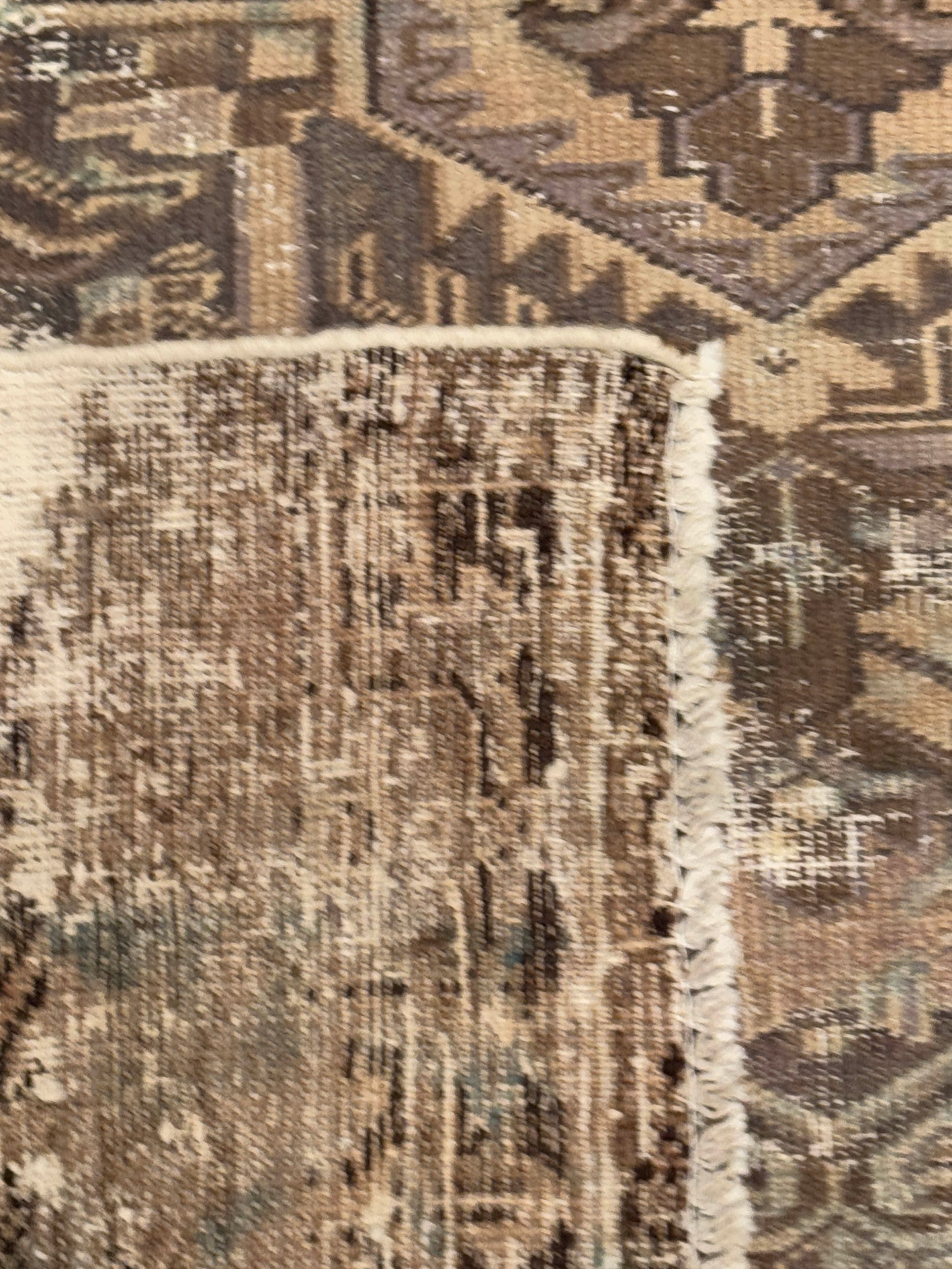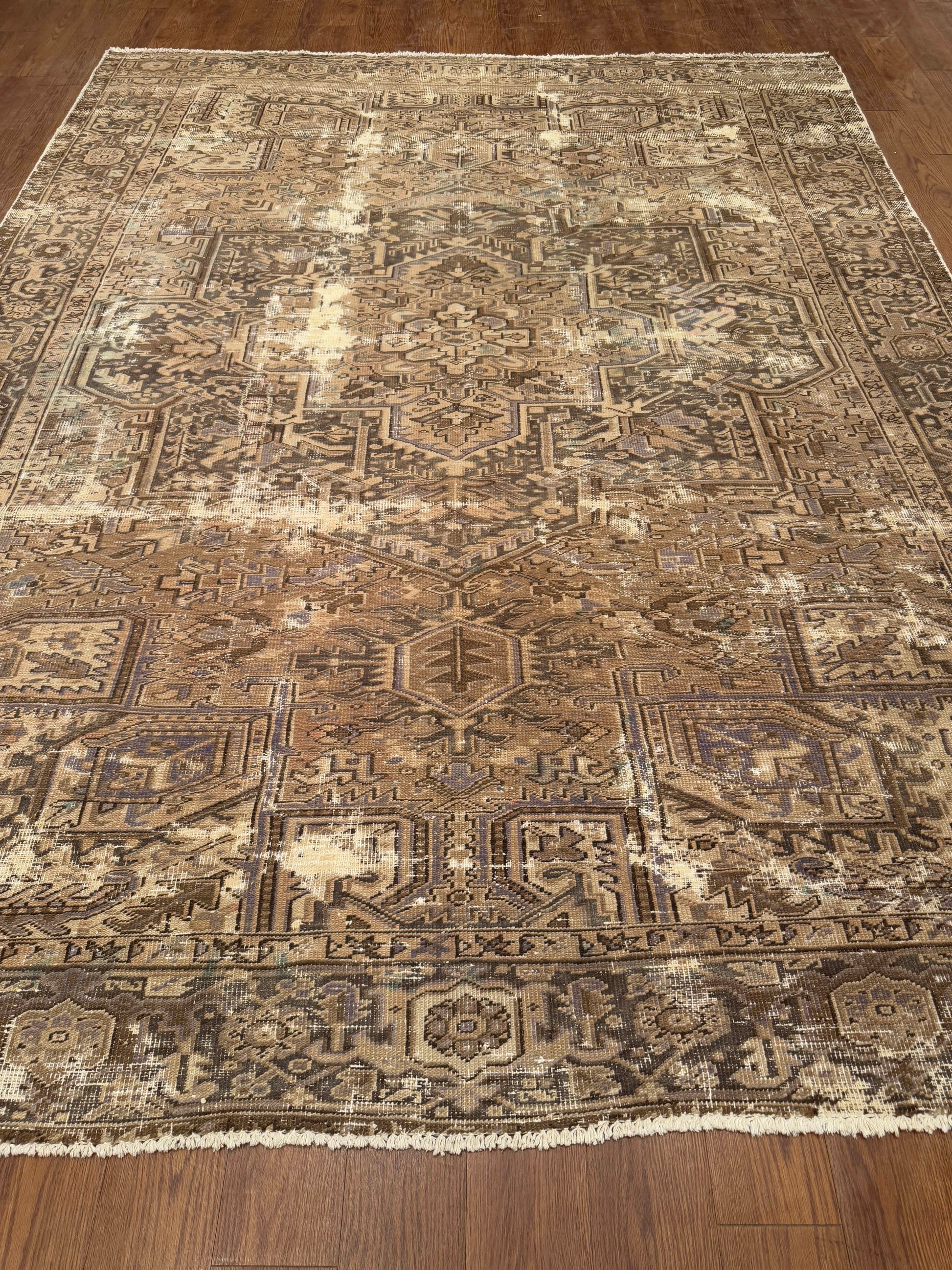 This handwoven rug showcases an intricate geometric medallion design accented by layered tribal motifs, rendered in an earthy palette of chestnut, sand, and taupe. The naturally distressed texture and abrash variations lend it a timeworn, antique appearance full of character and warmth. Perfect for grounding modern, rustic, or traditional interiors with a sense of artisanal heritage and understated elegance.
