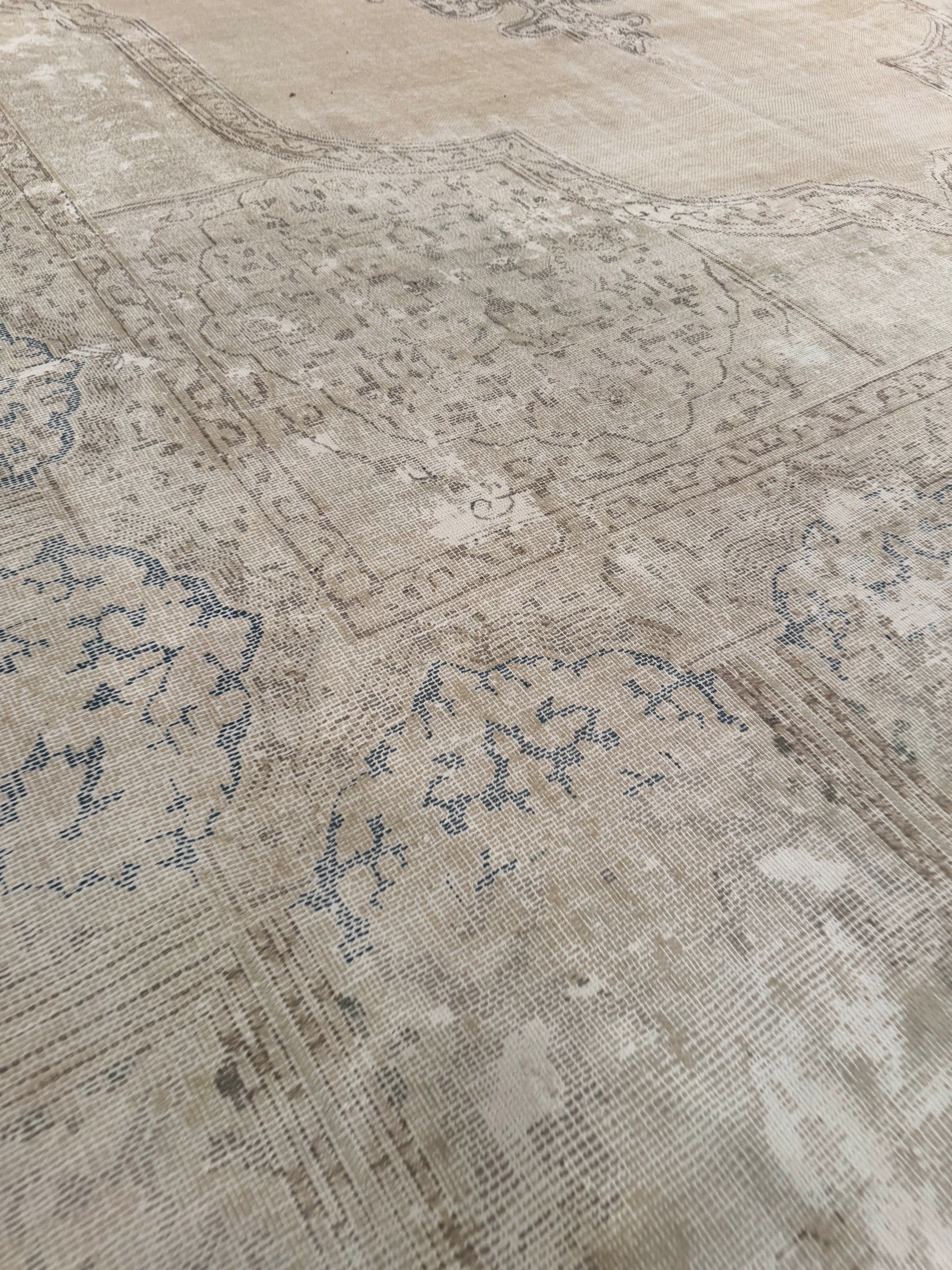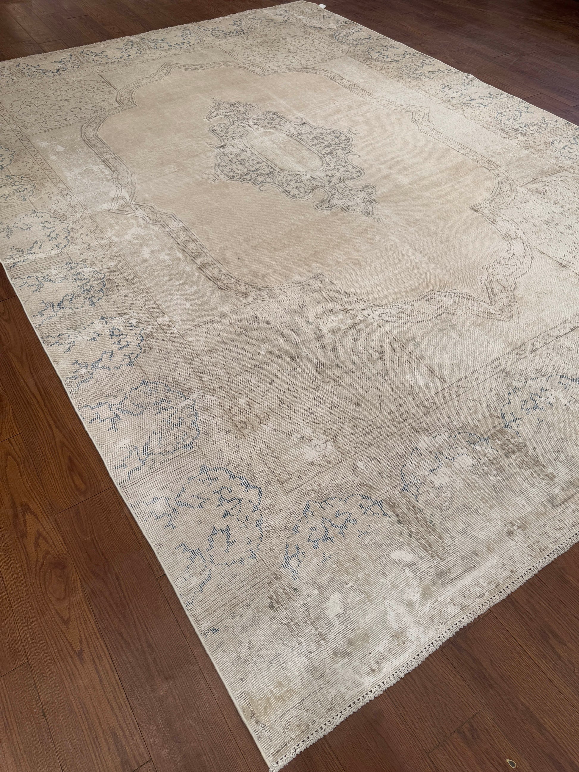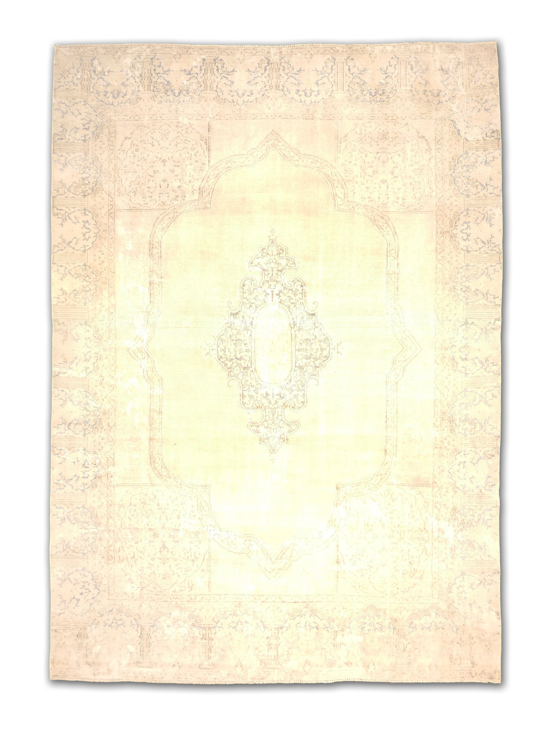This elegant handwoven rug features a soft, faded medallion design with intricate detailing along the border. The neutral beige tones are accented with subtle hints of gray and blue, giving it a timeless, vintage-inspired look. Its muted palette makes it versatile for layering in both modern and traditional interiors.