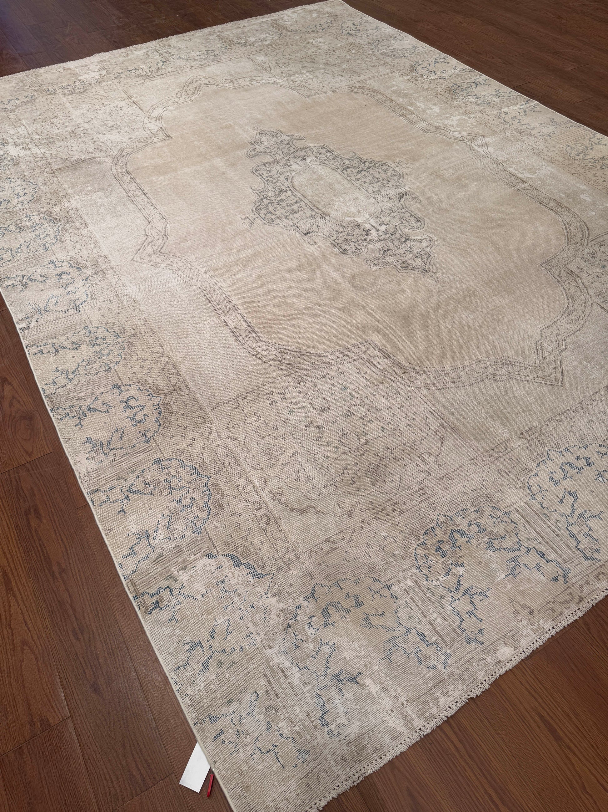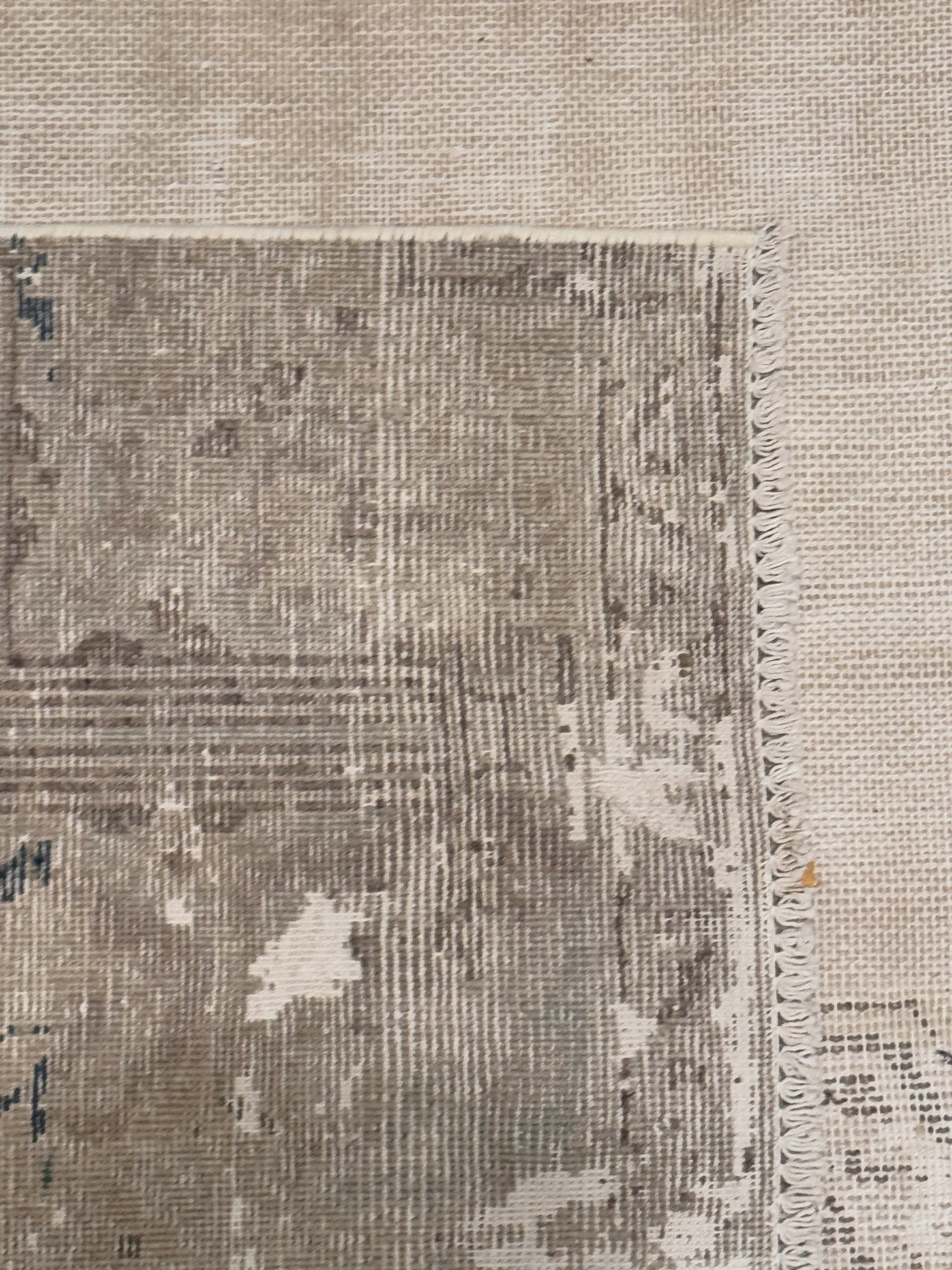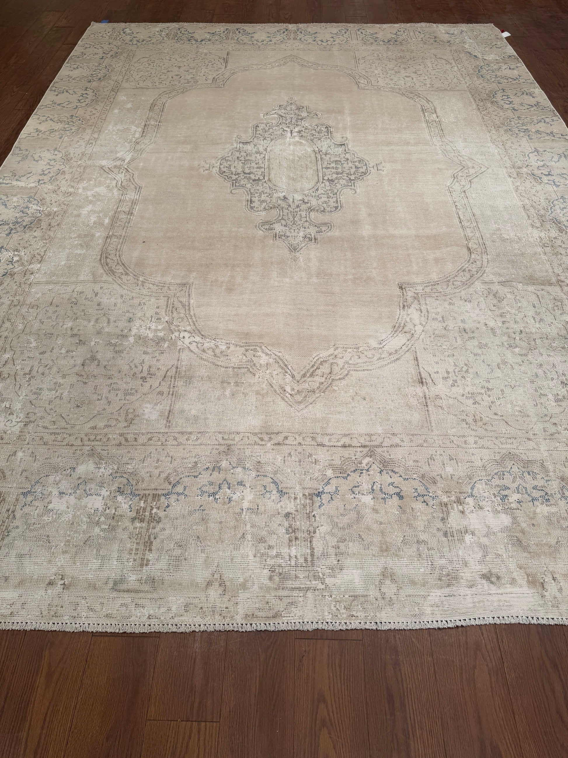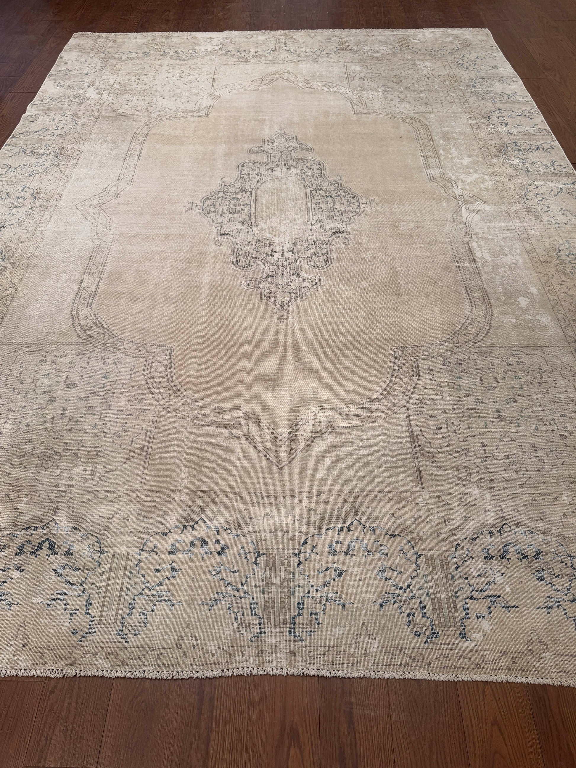 This elegant handwoven rug features a soft, faded medallion design with intricate detailing along the border. The neutral beige tones are accented with subtle hints of gray and blue, giving it a timeless, vintage-inspired look. Its muted palette makes it versatile for layering in both modern and traditional interiors.