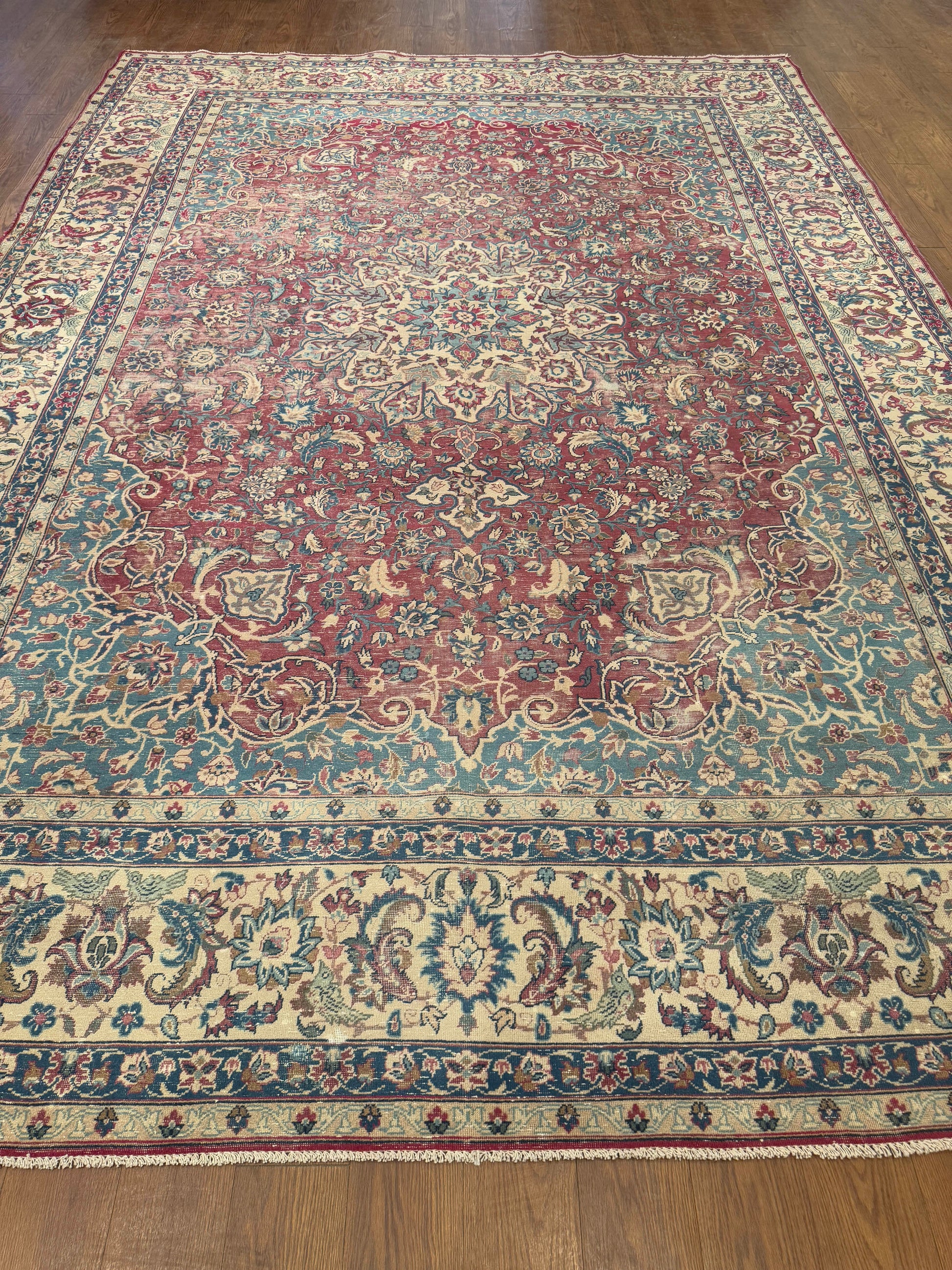 This striking handwoven rug showcases a rich medallion design with intricate floral detailing. The deep red field is beautifully complemented by teal, ivory, and navy accents, framed with a classic floral border. Its bold palette and refined craftsmanship make it a timeless centerpiece for elegant interiors.