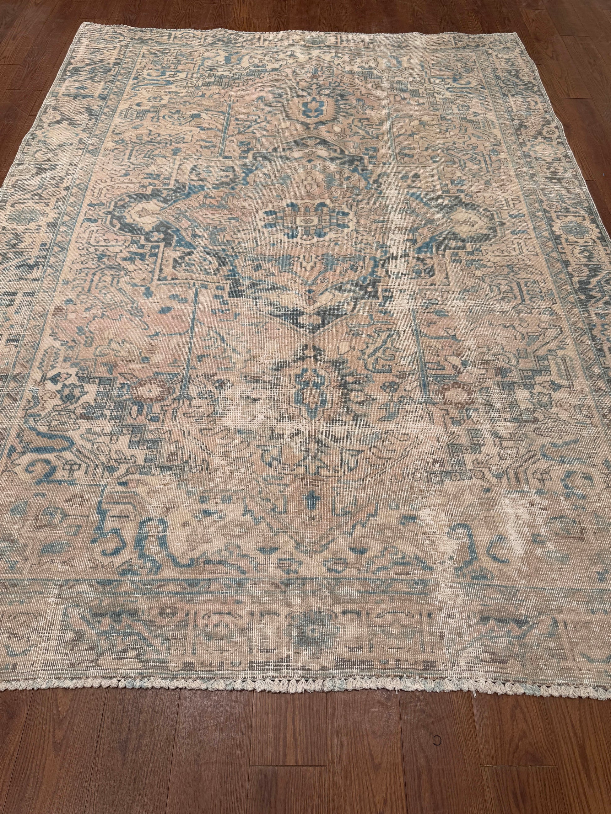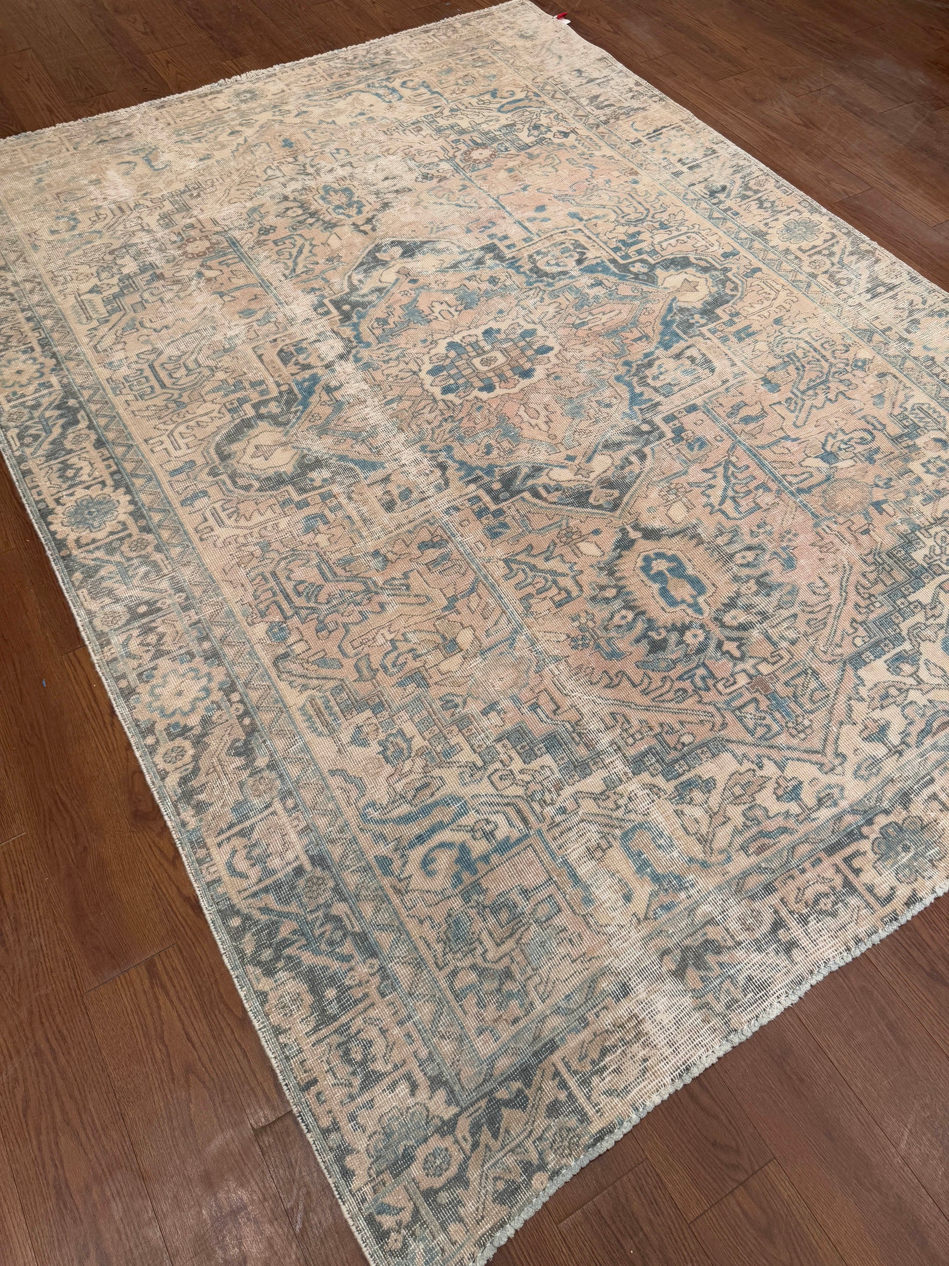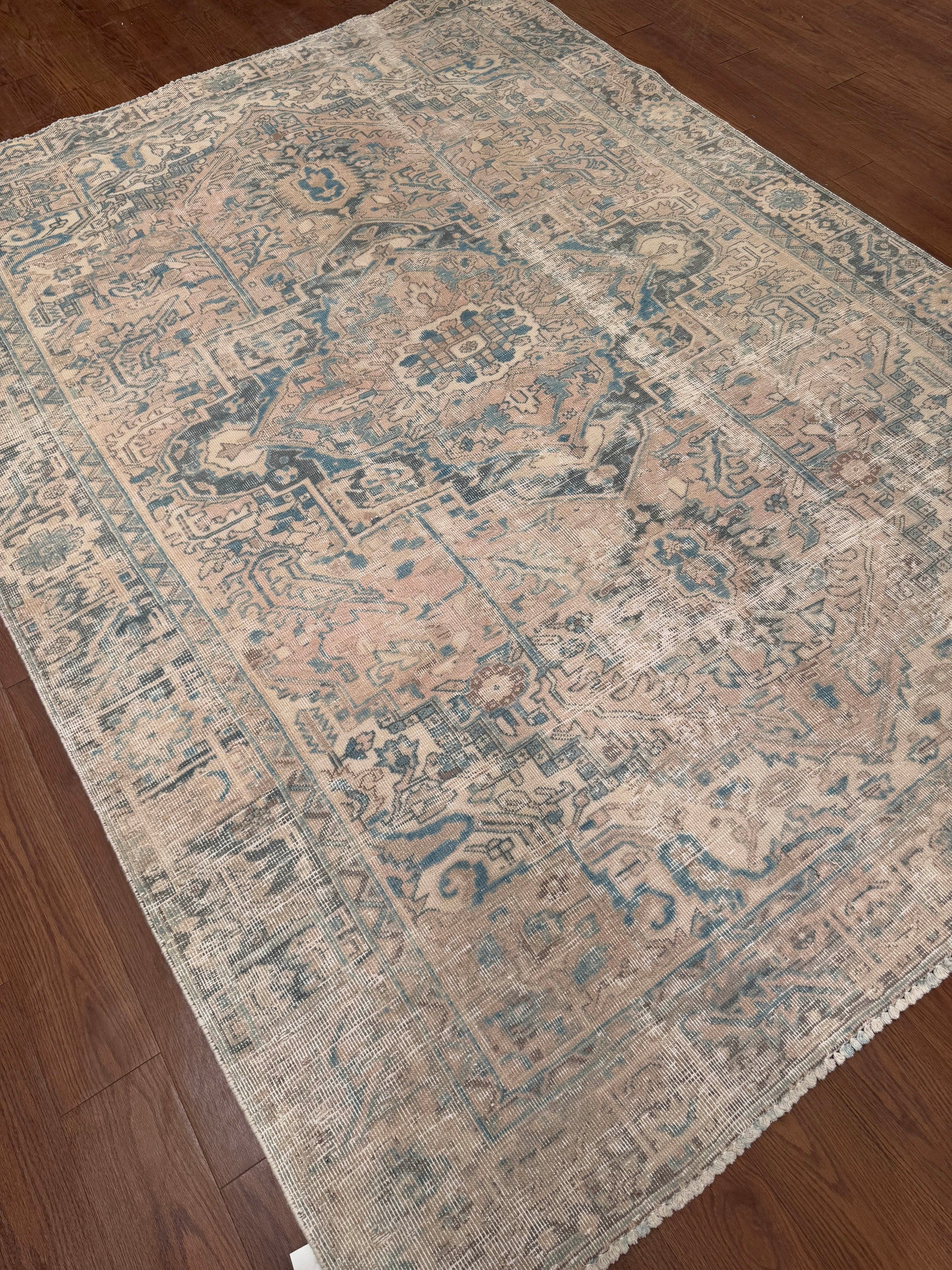 This handwoven rug features a beautifully balanced geometric medallion surrounded by intricate floral and tribal motifs, softly faded for a timeworn appeal. The palette of dusty rose, muted teal, and ivory creates a calming yet sophisticated atmosphere, ideal for both modern and classic interiors. Its distressed texture highlights the craftsmanship and artistry behind its design, bringing warmth and authenticity to any space.
